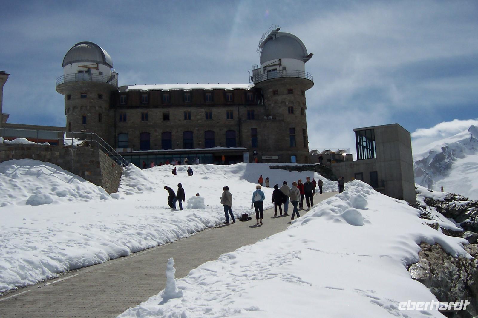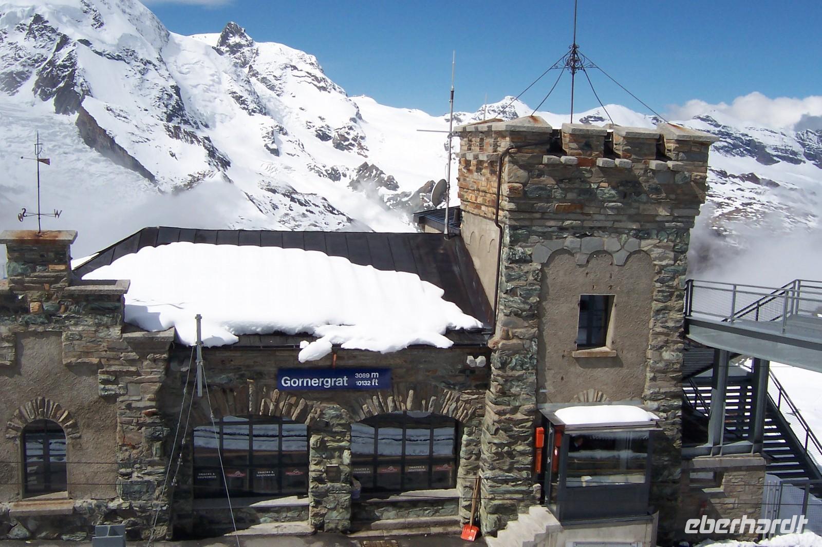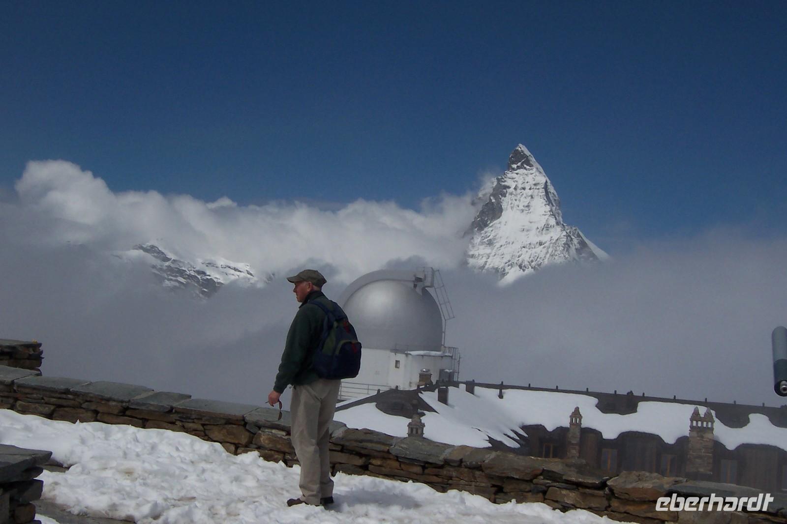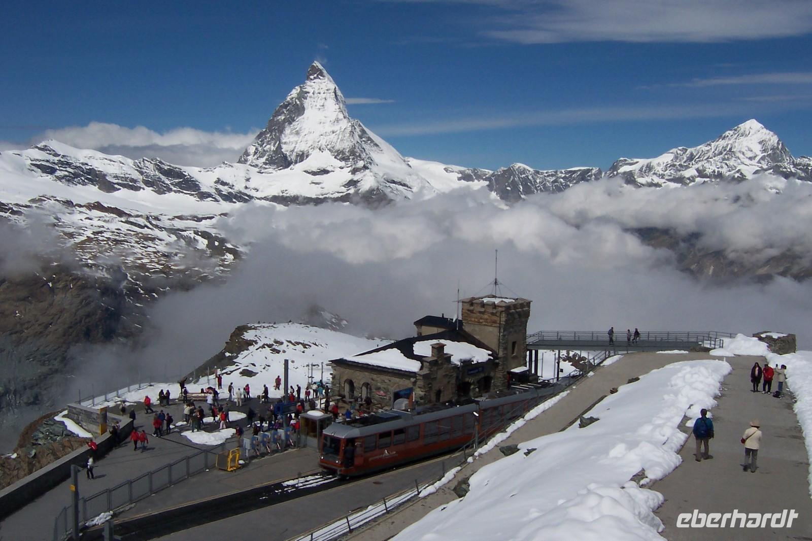 Nach dem Aufwecken, Blick zu den Bergen, über Zermatt liegt der Nebel. Was sagt die Wetterstation auf dem Berg? Das Matterhorn liegt frei über den Wolken. Nach dem Frühstück lassen wir uns nicht aufhalten die Gruppe fährt mit der Gornergratbahn, der höchsten Zahnradbahn Europas, zum 3130m hohen Gornergrat. Welch ein überwältigendes Panorama. Wir benötigen die Sonnenbrille, um die Schönheit der Berge genießen zu können.