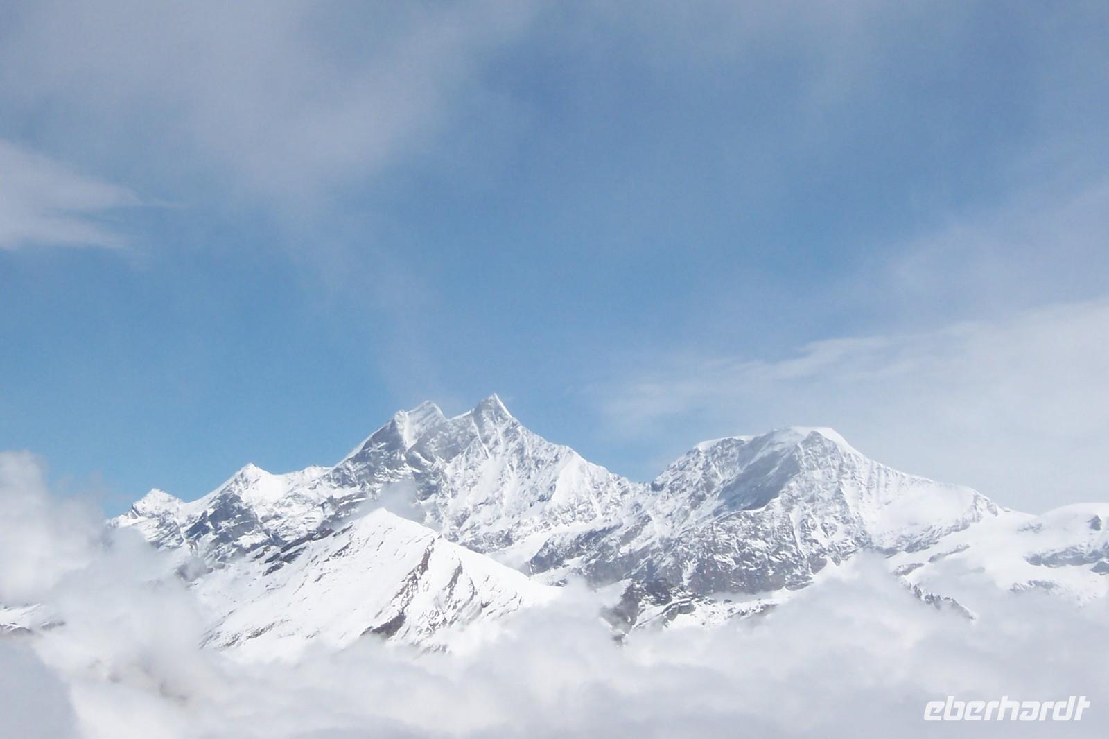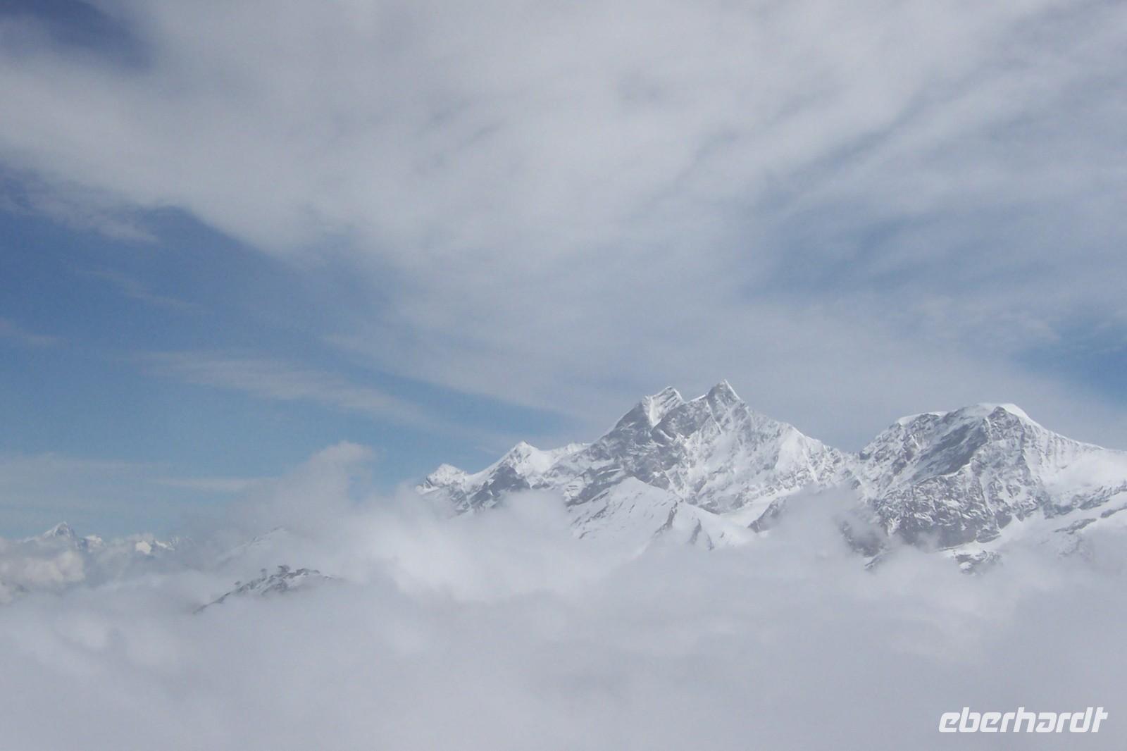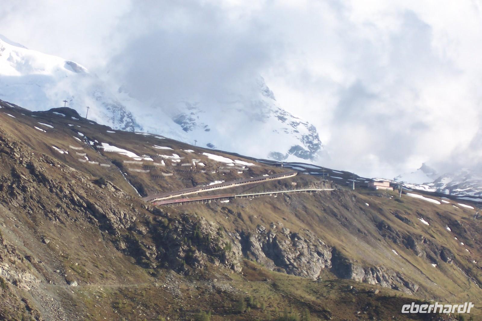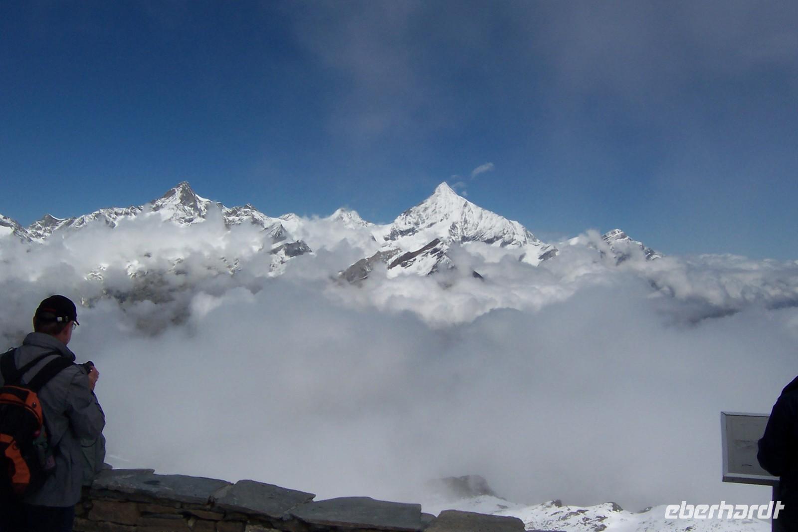 Wieder Nebel in Zermatt, aber die Sicht auf die Berge um Zermatt über den Wolken ist gut. Ein Teil der Gruppe fährt mit der höchsten Luftseilbahn Europas zum kleinen Matterhorn(3820 m).
