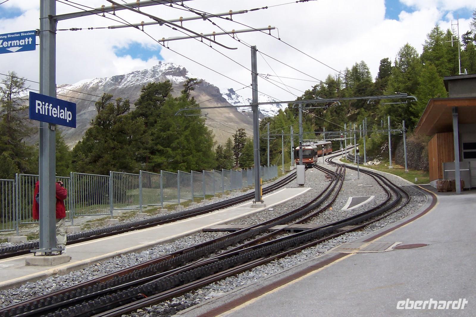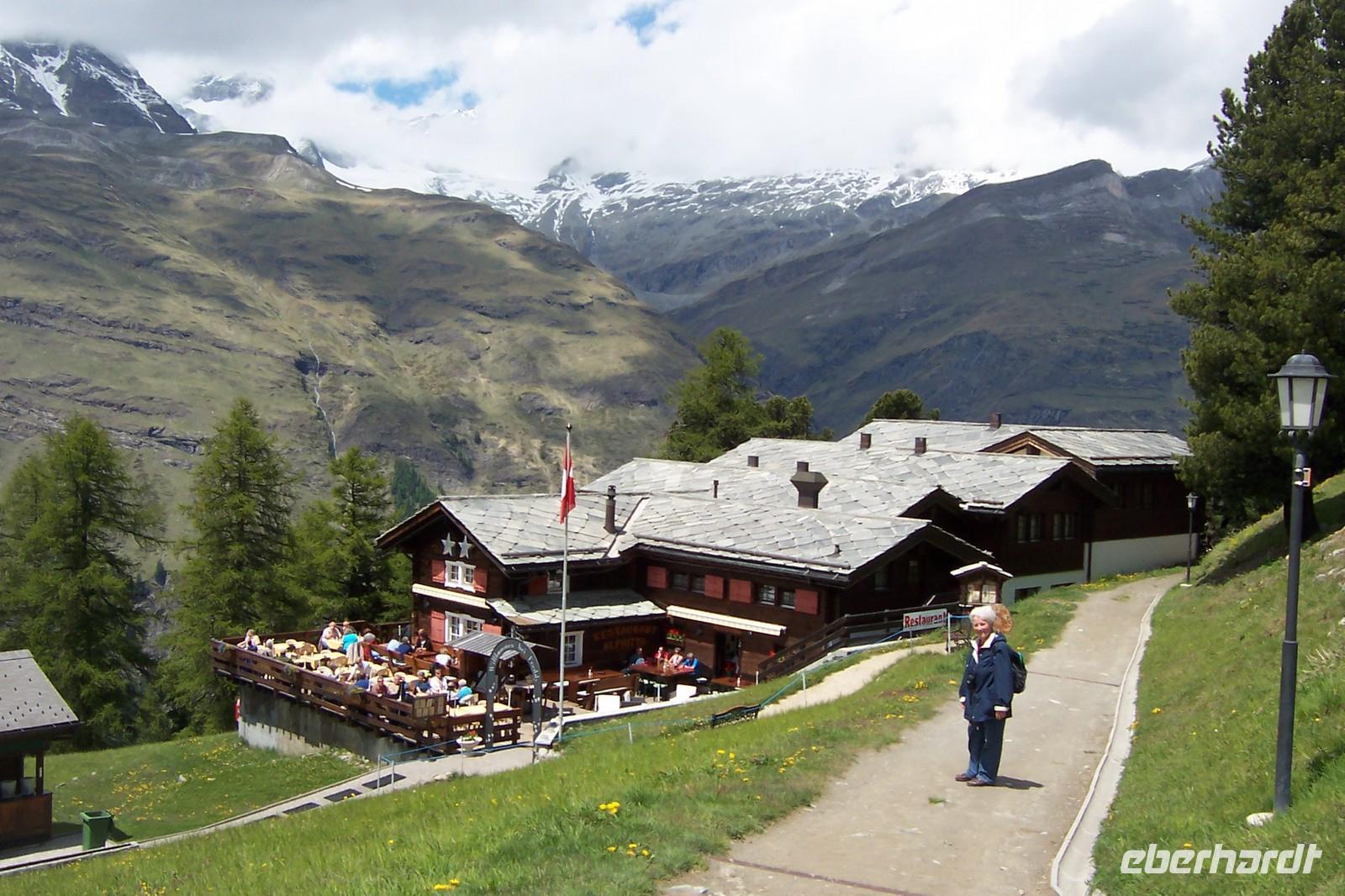 Die Gestaltung des weiteren Tages kann jeder selbst bestimmen. Ein Teil der Gruppe möchte wandern und so treffen wir uns wieder an der Bahn und fahren bis zur Station Riffelberg (2582m). Hier steigen wir aus und wandern bis zur Riffelalp (2211m). In der Alp mit Blick auf das Matterhorn ruhen wir aus.