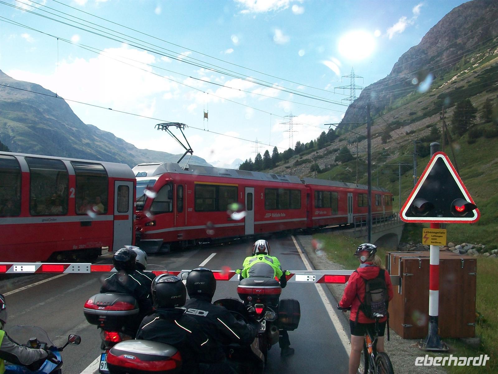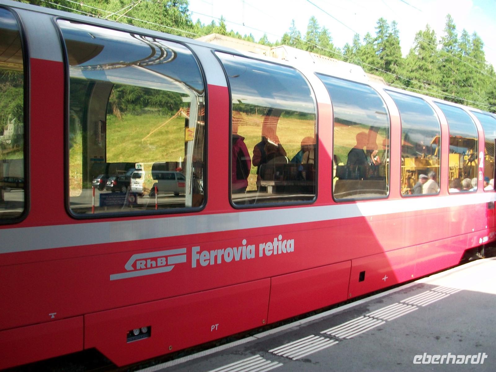 Wir sind früh gestartet und es geht zuerst hinauf in die Berge und über den Flüelapass zum Inn hinunter. Wir folgen dem Fluss aufwärts und können die schöne Bergwelt genießen die unsere Fahrt flankiert. Kurz vor halb zehn kommen wir in Pontresina an, hier wird dann unsere Fahrt mit dem Zug beginnen. Ein kleiner Spaziergang in der frischen Bergluft ist sehr angenehm, eine halbe