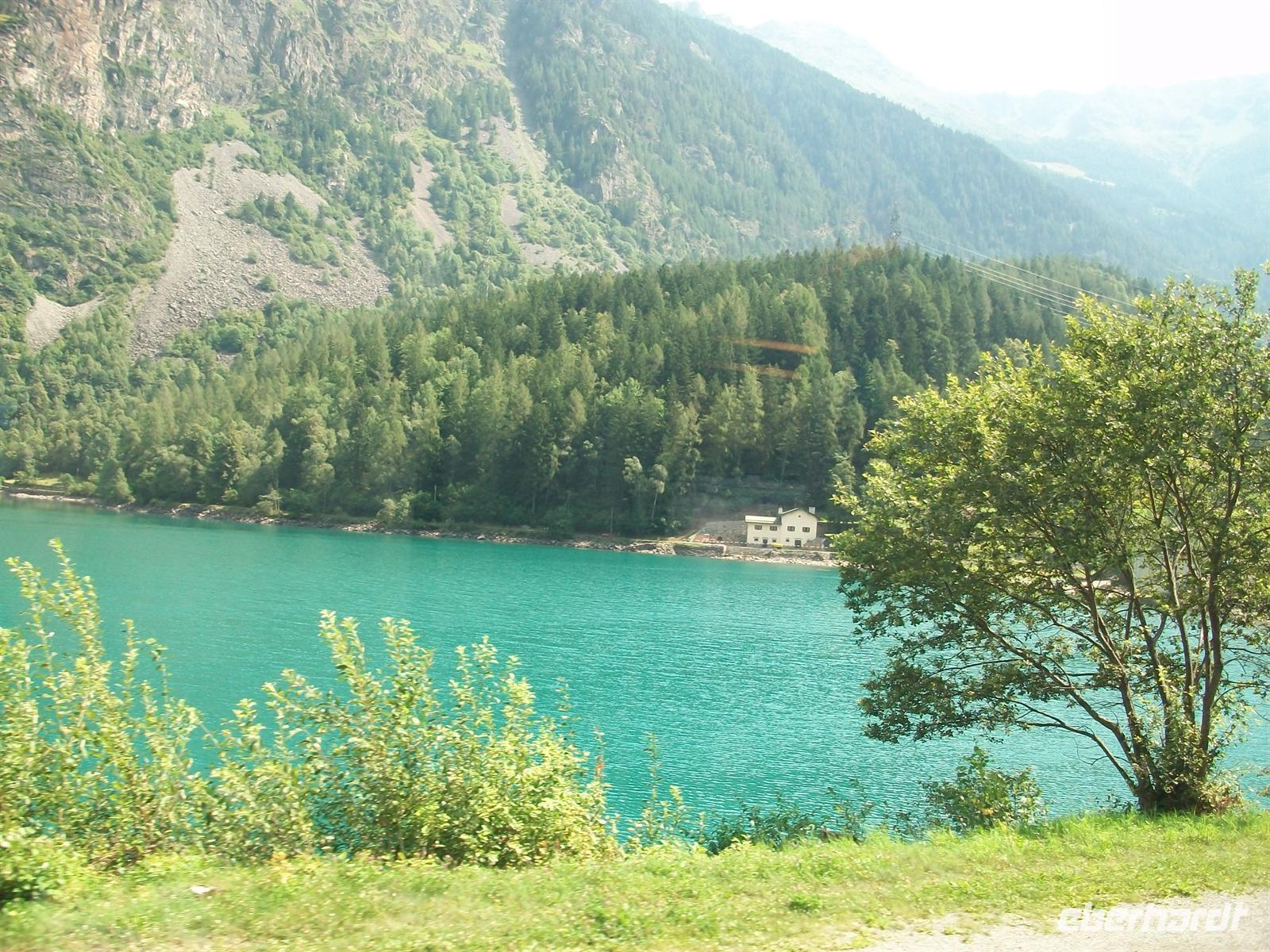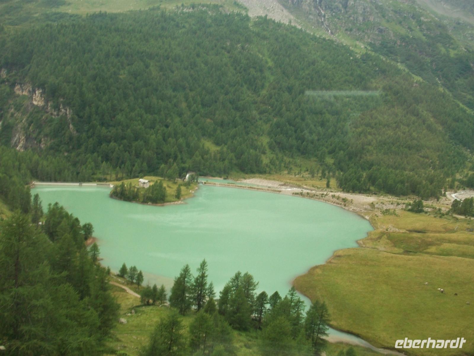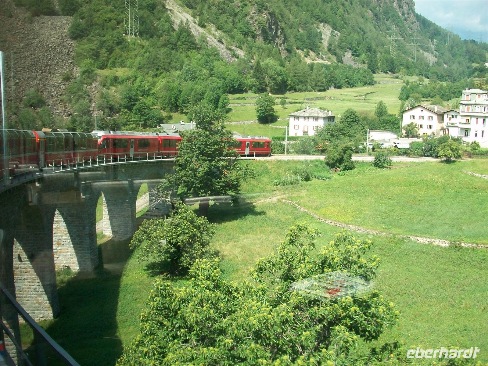 Stunde später hat unsere Reisegruppe auf den reservierten Sitzen platzgenommen. Ein schriller Pfiff vom Fahrdienstleiter, ein leichter Ruck- die wundervolle Fahrt durch die Berge beginnt. Durch die großen Panoramafenster zieht eine grandiose Landschaft vorbei. Zuerst fahren wir durch ein Waldstück, einige Wasserfälle sind zu sehen, unmerklich geht es in Serpentinen aufwärts und bald öffnet sich das Panorama zum Morteratschgletscher. Beindruckend ist der Blick hinüber zur gewaltigen Eismasse die weiß erglänzt und zum Grün der Wälder einen schönen Kontrast bildet. Unaufhörlich geht es bergauf, bald sind wir über der Baumgrenze angelangt und der Blick wird frei auf die Hochgebirgslandschaft des Berninapasses. Hier oben sind auch zahlreiche Seen zu sehen, in ihren Wassern spiegeln sich die Berge- ein schöner Anblick. Doch bald geht es wieder abwärts, das Grün nimmt wieder zu und bald haben wir die Talstufe vor unseren Augen die den Blick hinunter nach Poschiavo freigibt. Wie im Spielzeugland liegt der Ort ausgebreitet, dahinter der gleichnamige See, Petrus spielt auch mit- es ist einfach wunderbar die Schönheiten der Natur vom bequemen Reisewagen zu schauen. In Serpentinen geht es hinunter ins Tal, durch üppige Wälder hindurch und bald sind wir unten angelangt.