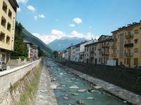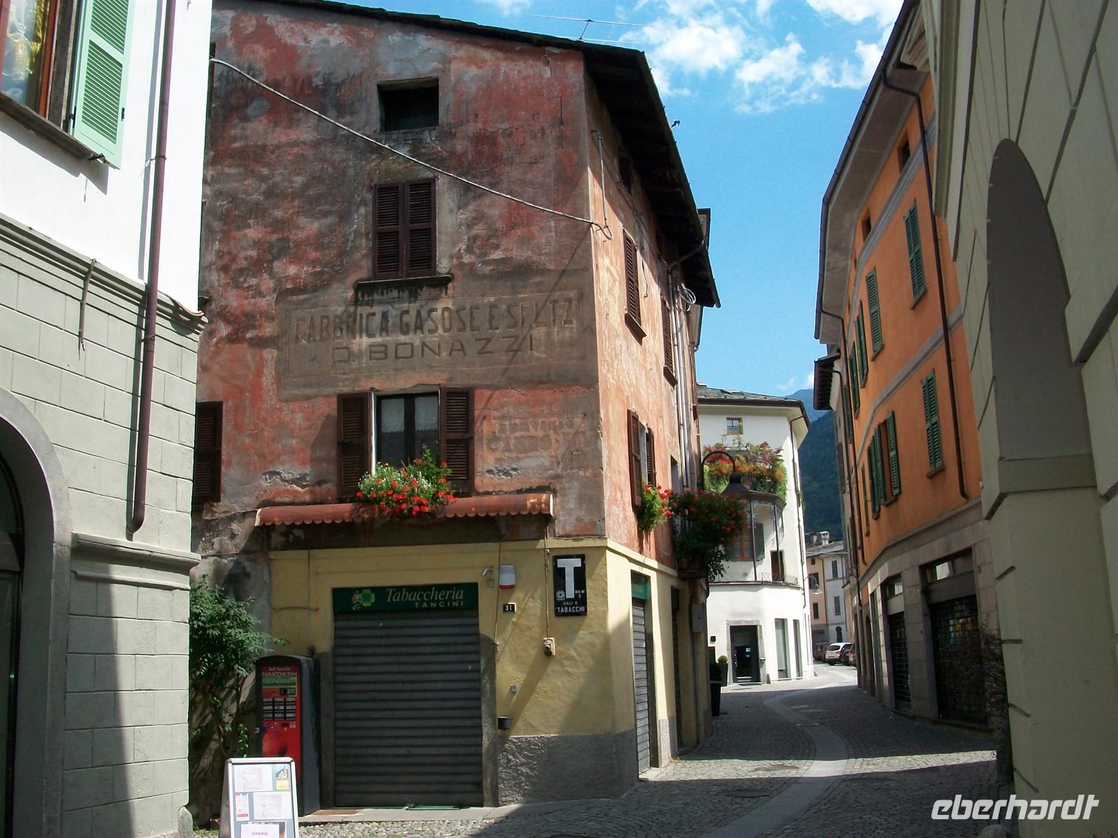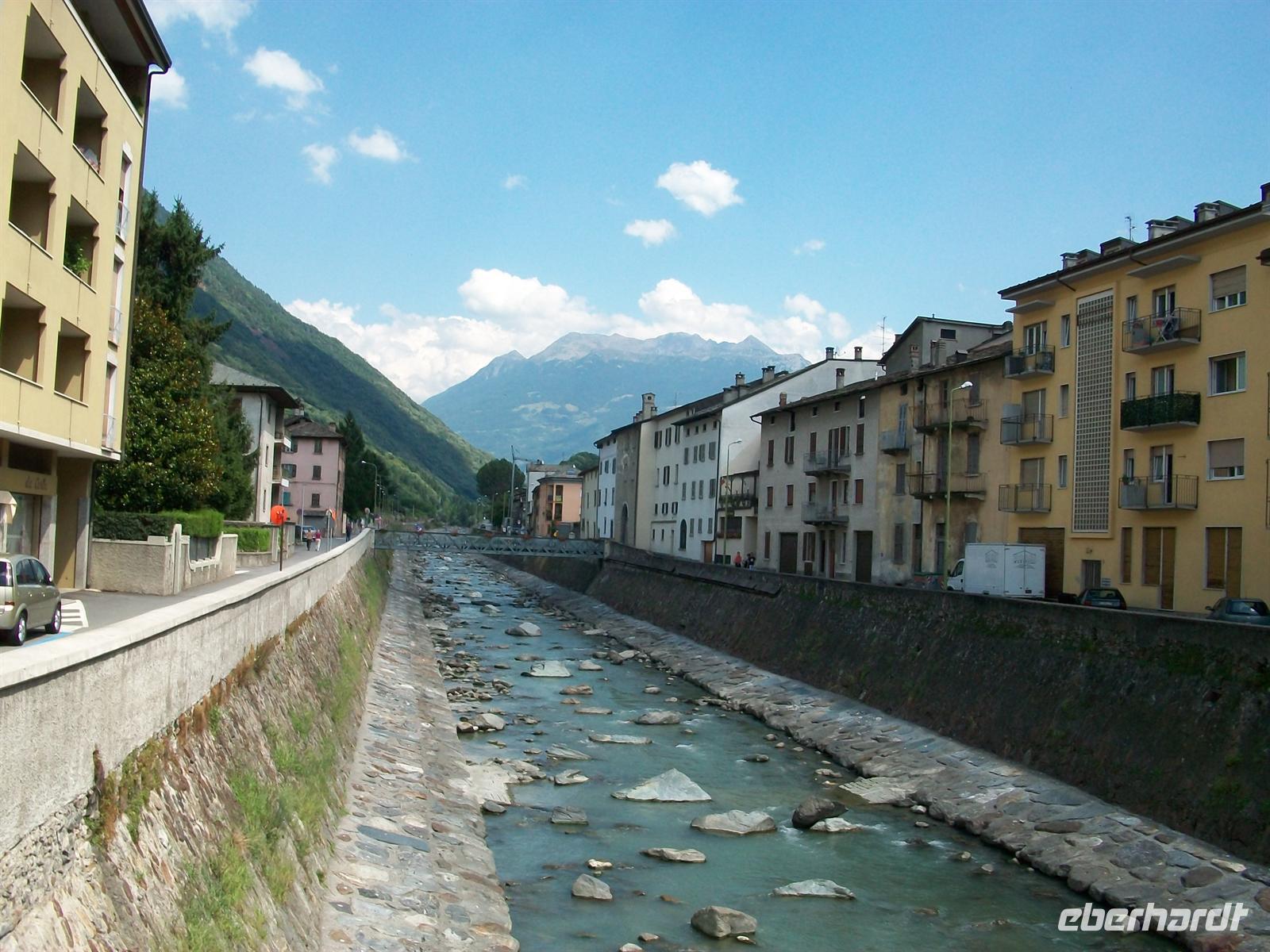 Erkundungen, sehr reizvoll ist der historische Kern des Ortes mit seinen altertümlichen Häusern, dazwischen hat sich die Adda ihren Weg gesucht. Ringsum steigen steil die Berge an die sich auch hier einen Schmuck aus Wolken aufgesetzt haben. Es sind schöne Impressionen an diesem frühen Nachmittag, von hier sind auch Weinreben zu sehen, kein Wunder wir sind hier im Veltin, einem nicht unbedeutenden Anbaugebiet.