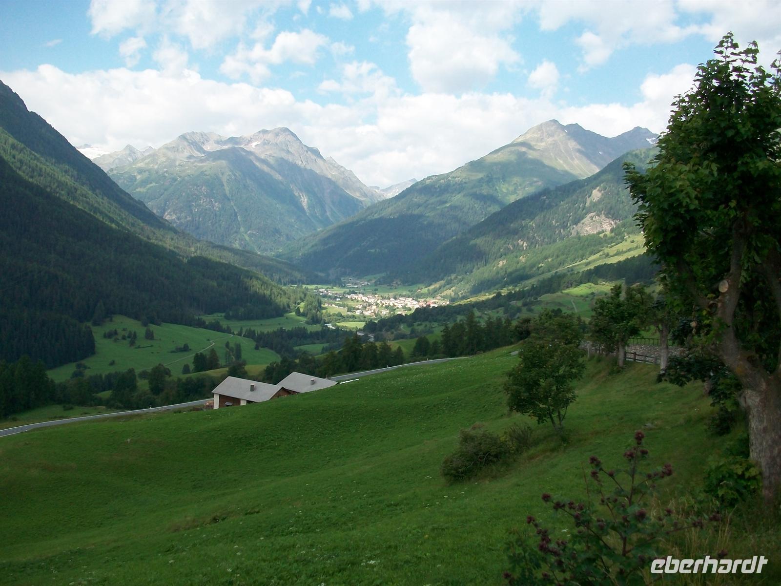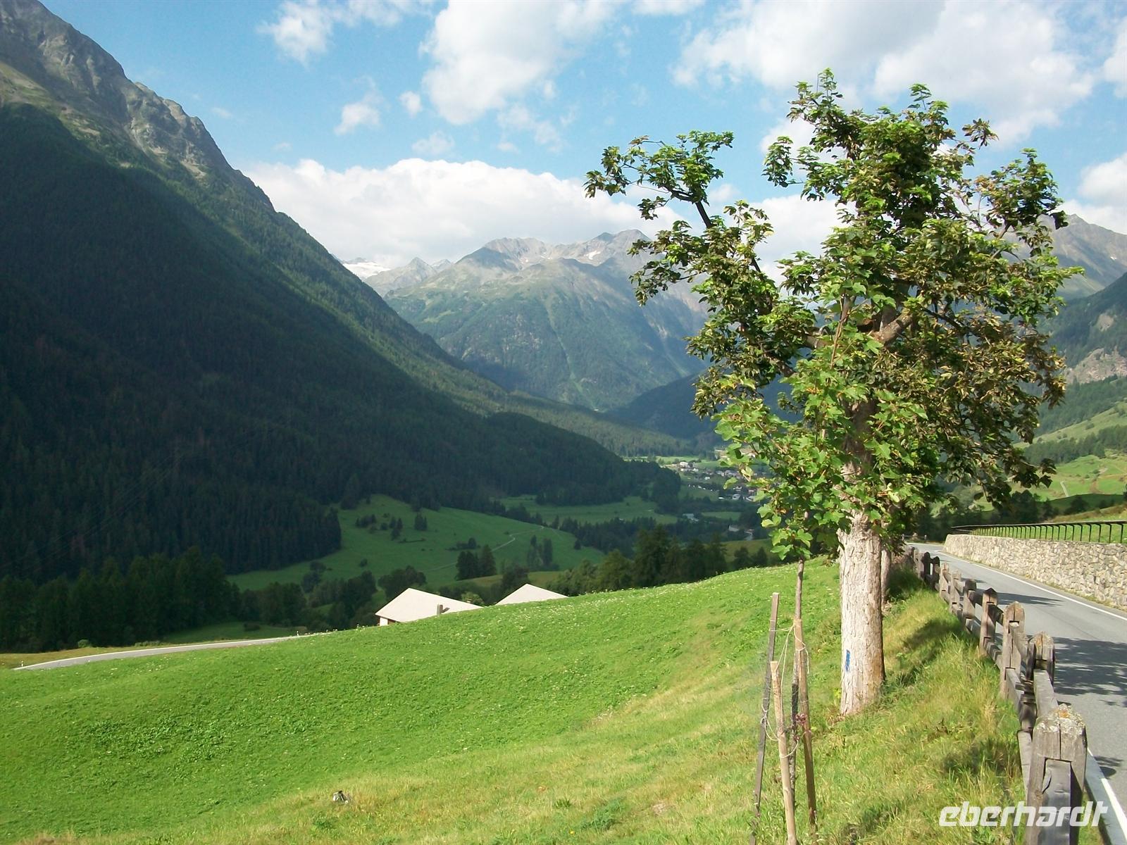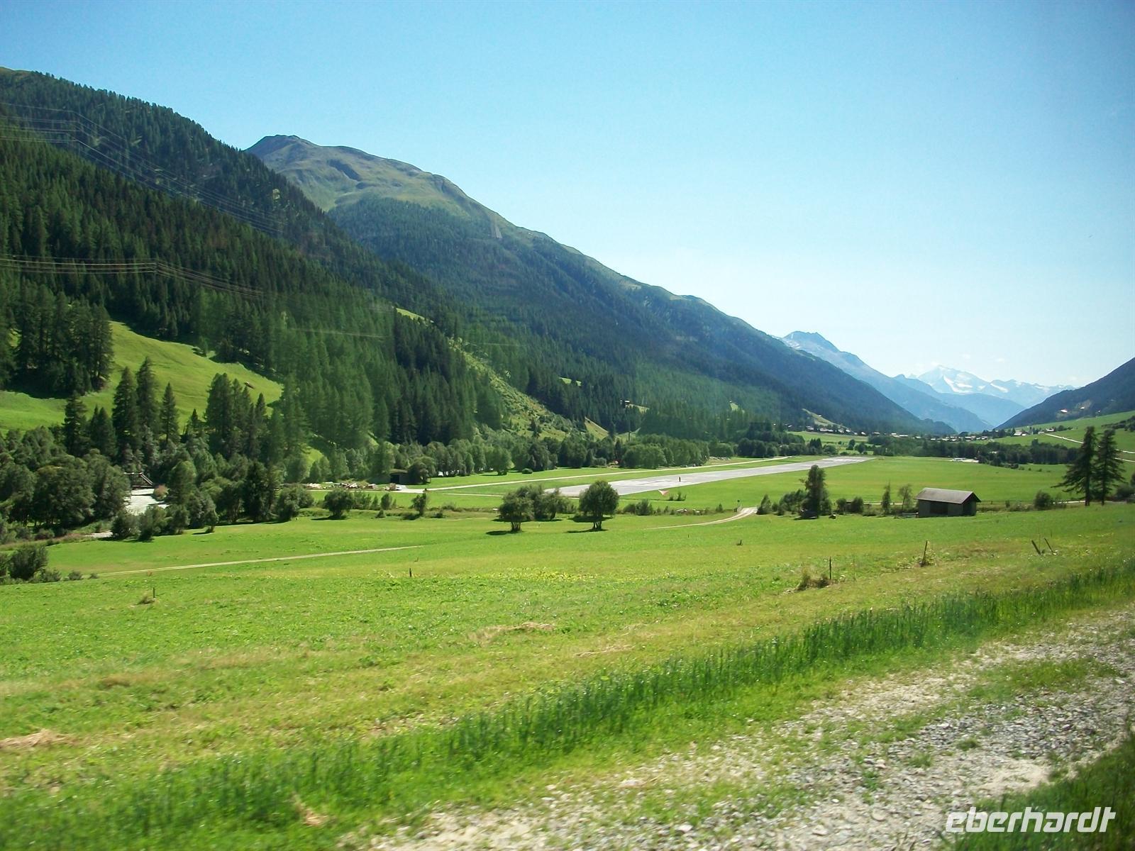 Dann senkt sich die Straße ab und vor uns ist schon das obere Inntal zu sehen dass hier Engadin- „Garten des Inn“ heißt. Schön sind die Wälder anzuschauen die sich an den Berghängen nach entlangziehen und einer zahlreichen Tierwelt Schutz und Geborgenheit geben.