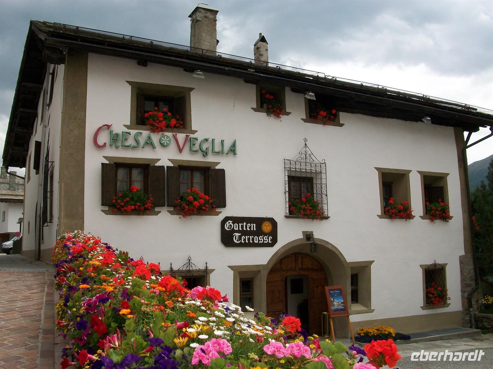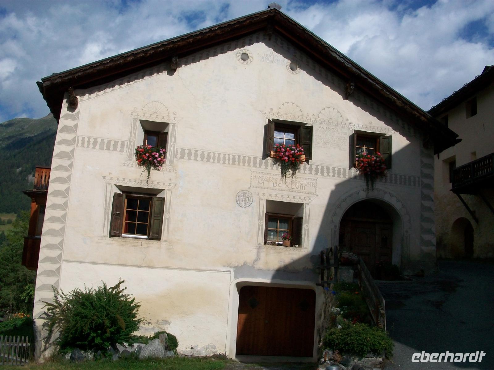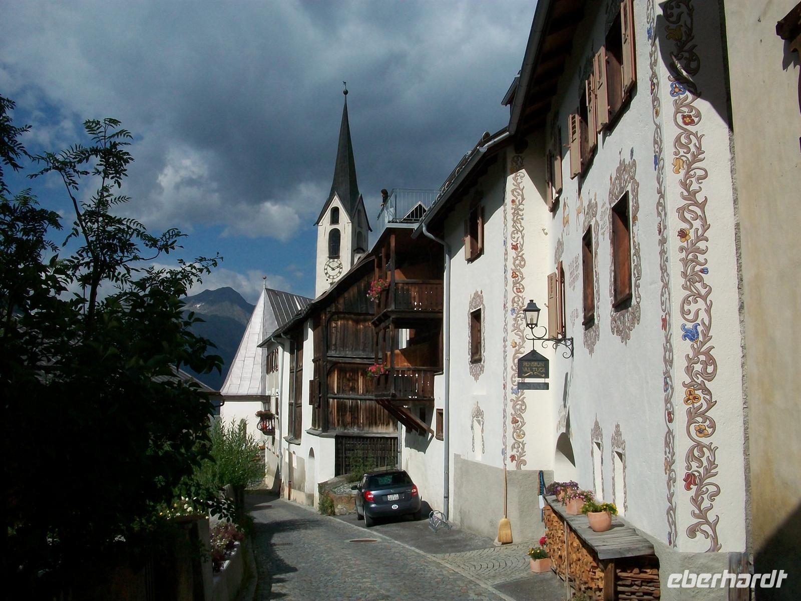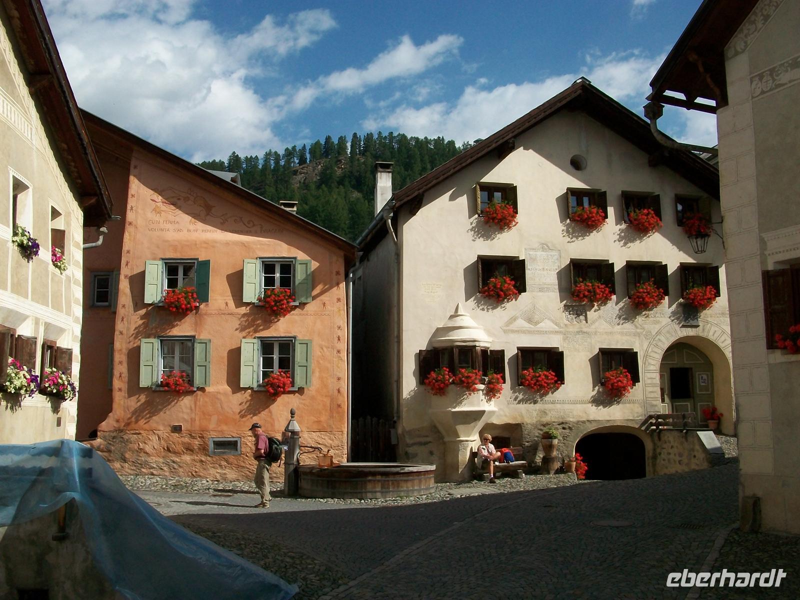 Wir bummeln nun durch den Ort und staunen über die schönen Häuser und das gepflegte Ambiente. Hier ist die Zeit stehen geblieben, wir lassen uns darauf ein in eine Zeit einzutauchen die längst vergangen ist. Alle Fassaden tragen den Kratzputz der doch für diese Gegend so typisch ist und mit bunten Farben und schönen Motiven unser Auge erfreut. Es ist ein erholsamer Bummel durch den Ort, er hat seine Originalität erhalten, das ist in der Schweiz in dieser Form nicht mehr sehr häufig zu sehen. Die Menschen leben hier in schöner Eintracht zur Natur und haben die schöne Bergkulisse immer vor ihren Augen, wie beneidenswert doch die Menschen sind in diesem schönem Umfeld zu leben!