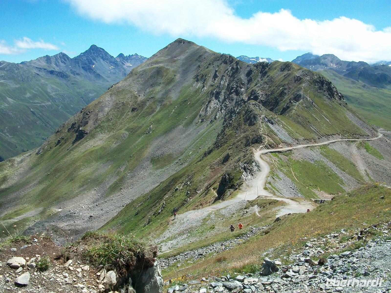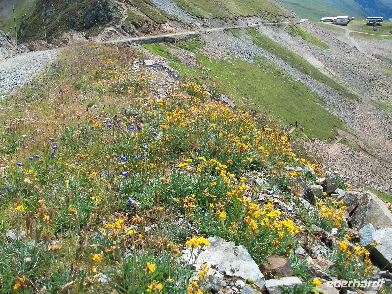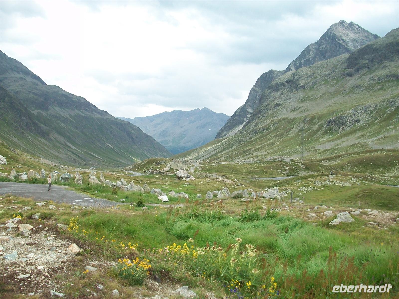 Bald haben wir die Baumgrenze hinter uns und fahren fortan in der pittoresken Natur des Hochgebirges. Überall sind die bunten Farbtupfer der Sommerblumen zu sehen die hier oben auf den Matten für schöne Kontraste sorgen. So manch kleiner Gebirgsbach fließt zwischen dem vielen Grün und schlängelt sich, kleine Kaskaden bildend, zu Tal. Ein Murmeltier sitzt auf dem Bau und äugt misstrauisch nach oben den dunklen Schatten beobachtend der dort seine Kreise zieht. Es ist ein Raubvogel der die Thermik ausnutzt und sich das schöne Land aus seiner Perspektive anschaut. Dem Murmeltier ist es aber nicht geheuer, schnell verschwindet es in seinem Bau.