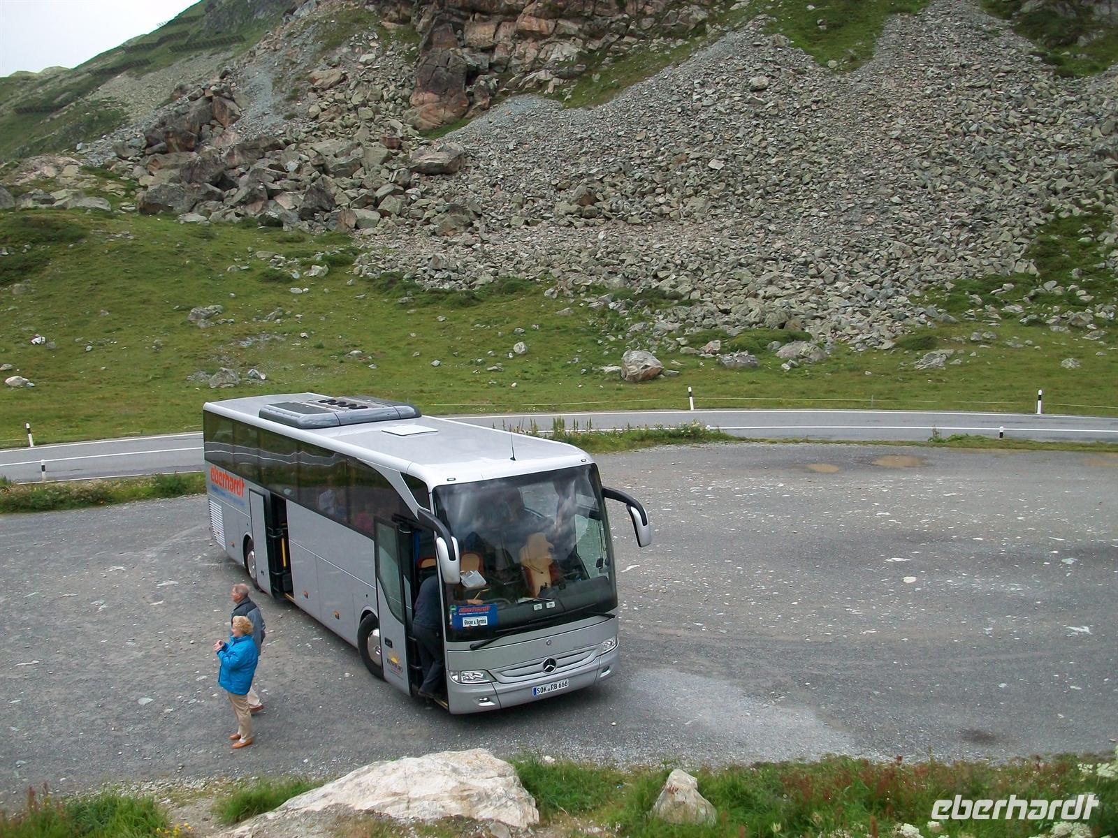Unsere Fahrt führt uns durch das Tal des Oberhalbsteins, vor uns bauen sich tief dunkle Wolken auf und nun öffnet der Wettergott auch alle Schleusen, das angekündigte Tiefdruckgebiet ist da. In wahren Sturzbächen fließt das Wasser über die Straße, die Scheibenwischer haben Höchstleistungen zu vollbringen. Aber wir sitzen im Schutz unseres Reisebusses der von unserem Chauffeur mit sicherer Hand gelenkt wird.
