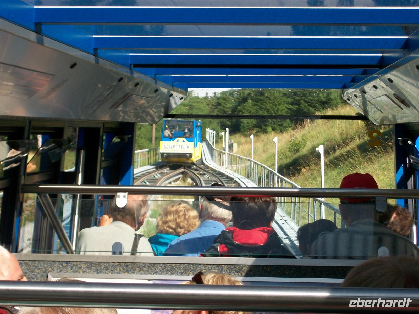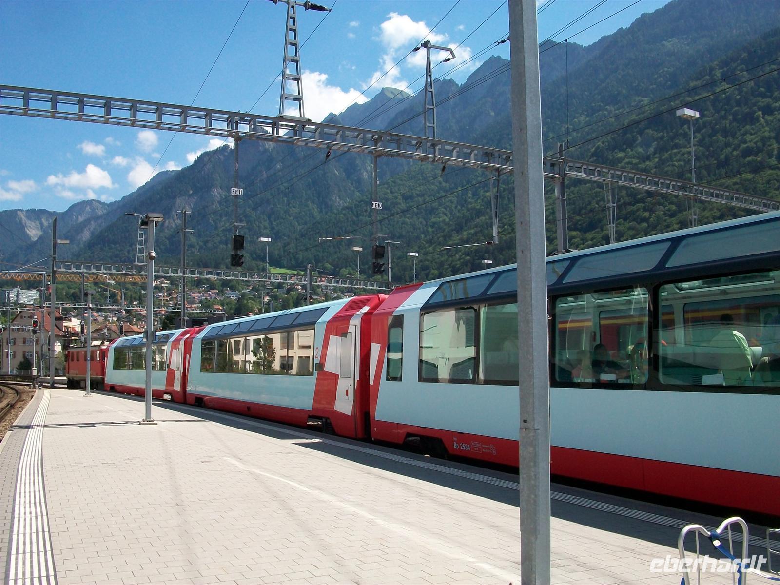 8.8.2012. Die Koffer werden heute etwas eher verladen, wir schicken unseren Chauffeur 9.00 Uhr auf Achse er hat den Weg über zwei Pässe zu nehmen und braucht deshalb etwas Vorlauf. Über dem Tal von Davos ziehen eben die letzten Dunstschleier davon, unsere Reisegruppe hat sich kurz vor halb elf am Bahnhof versammelt. Etwas später wird auch der Zug bereitgestellt, wir steigen in einen schönen Panoramawagen ein der für uns reserviert wurde. Er wird unser Domizil bis heute Abend sein, von seinen großen Fenstern aus werden wir bei prachtvollem Wetter die schönsten Ecken der Schweiz erkunden können.