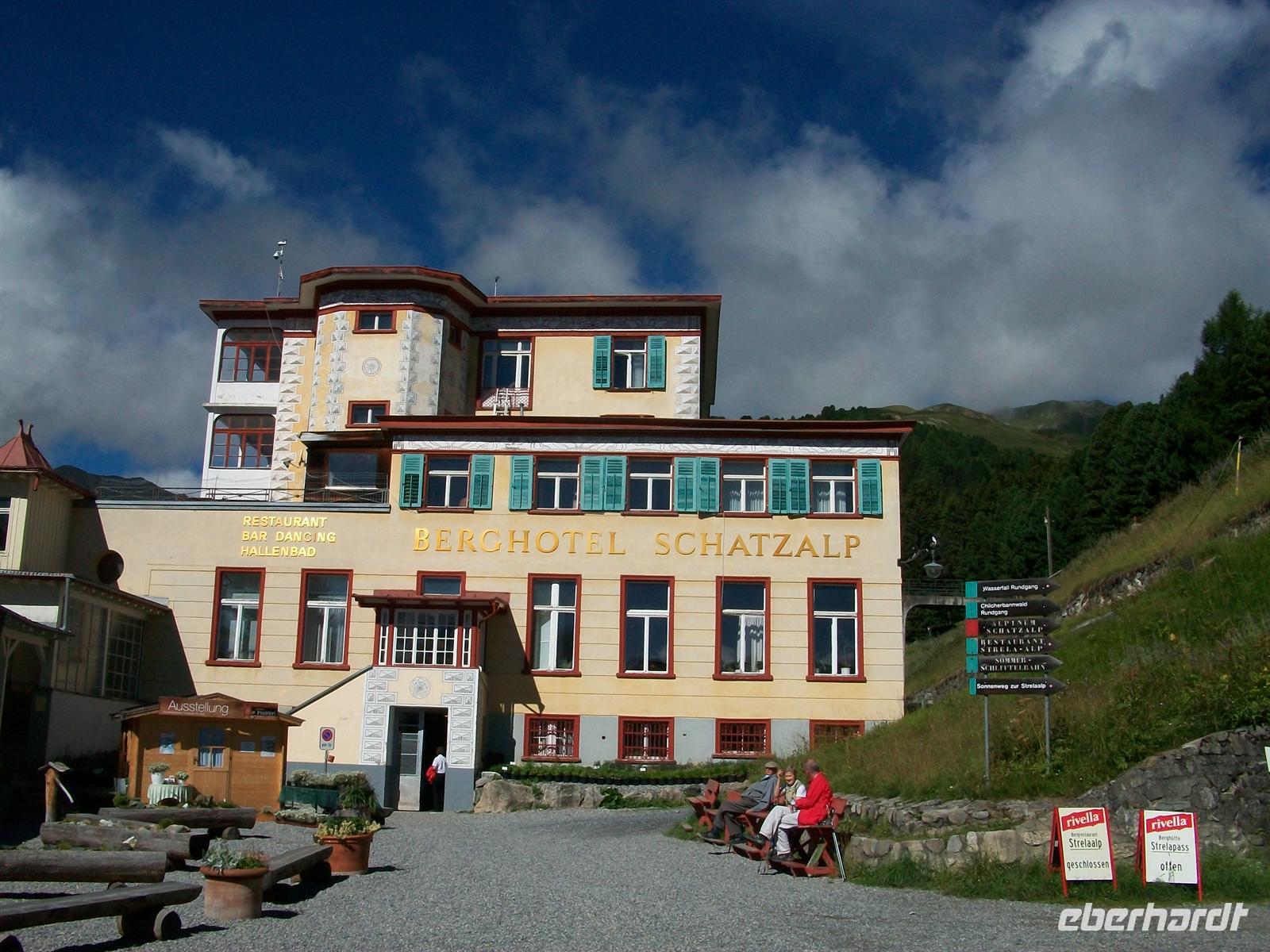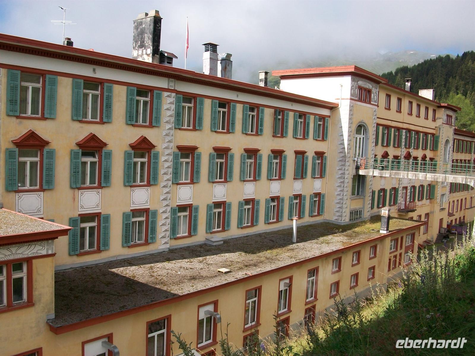 7.8.2012. Über dem Tal von Davos hängen am frühen Morgen noch dünne Wolkengespinste die von der aufgehendenden Sonne hinauf in die Berge getrieben werden, sich dort festsetzen und dennoch weichen müssen. Ein strahlend schöner Tag hat begonnen und begleitet uns auf dem kleinen Fußmarsch durch Davos. Heute kann jeder nach Lust und Laune den Tag selbst gestalten, mit der Gästekarte sind die Bergbahnen und vieles mehr gratis. Eine kleine Gruppe ist mit mir unterwegs um der Schatzalp einen Besuch abzustatten. Der Weg vom Hotel ist nicht weit und kurz nach halb neun sind wir an der Talstation der Standseilbahn angelangt. Wir sind nicht die einzigen Gäste die das schöne Wetter nutzen; die Bahn bringt uns in weniger als zehn Minuten hinauf. Wir steigen direkt vor dem großen Hotel aus, hier beginnen die Wanderungen. Dieser Berg hat Literaturgeschichte geschrieben; Thomas Mann siedelte hier seinen Roman „Der Zauberberg“ an. An diesem Ort war der fiktive Treffpunkt der illustren Gesellschaft die sich um den Haupthelden Hans Castrop versammelte, an dieser Stelle analysierte Mann die Dinge seiner Zeit.