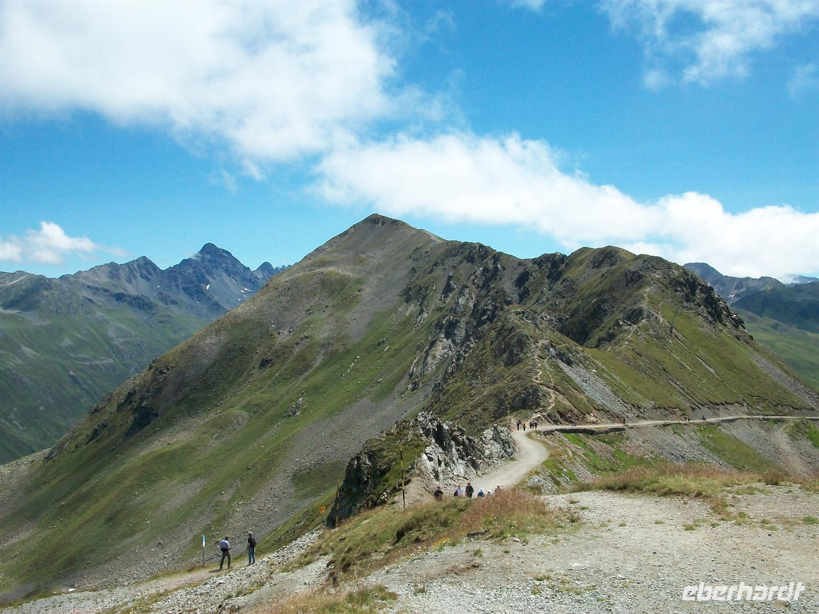 Unmerklich geht es bergauf, die Sonne bescheint eine wirklich schöne Szenerie, mächtige Wolken haben sich auf die Berge aufgelegt und geben zu diesem schönen Sommertag einen interessanten Kontrast.