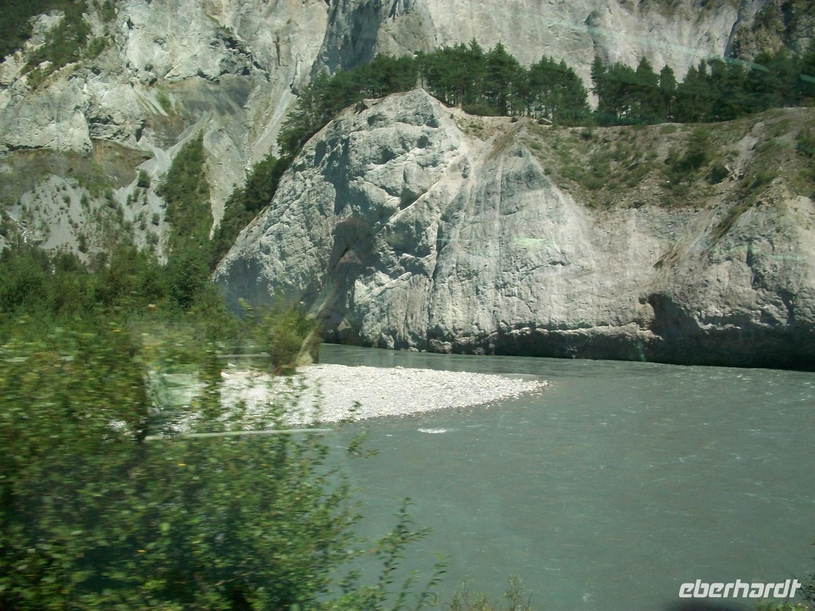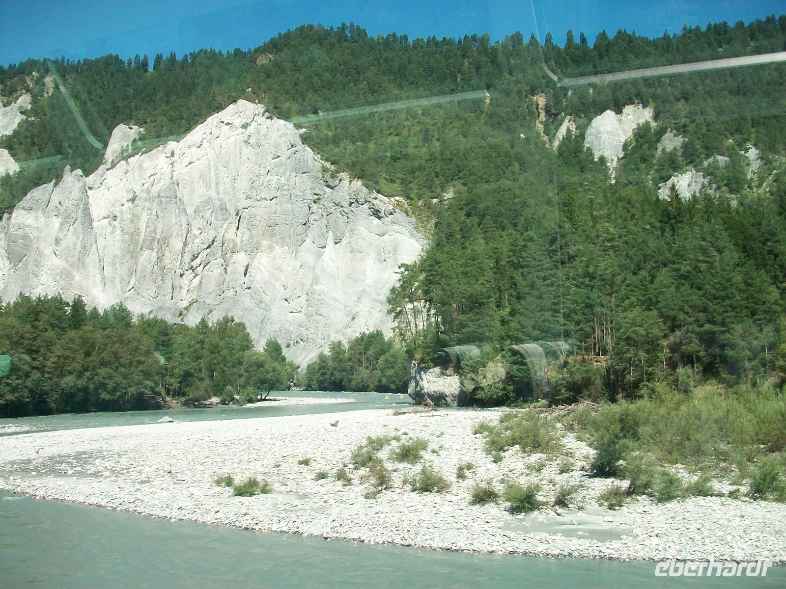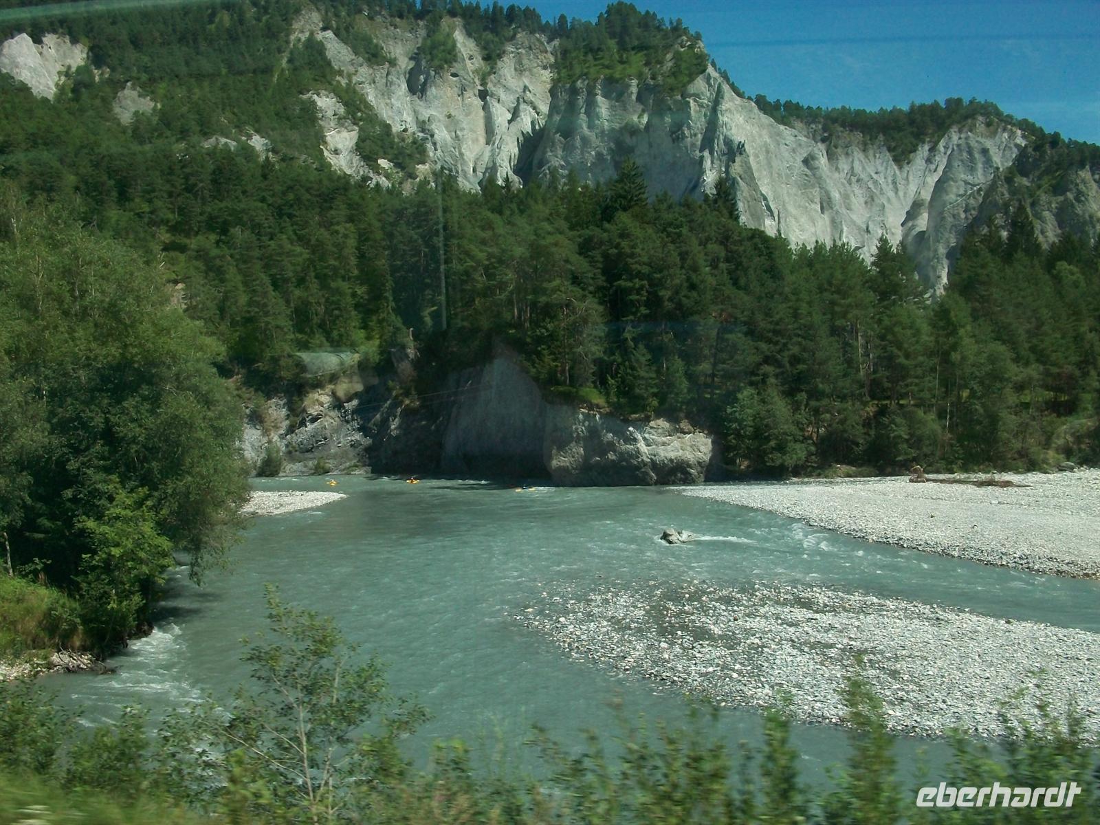 Hier wechseln wir die Fahrtrichtung und etwas später gelangen wir in die wildromantische Rheinschlucht. Der Fluss hat sich hier zahlreiche Windungen in den Fels gewaschen, die Wände steigen zum Teil lotrecht an und die Bahnstrecke verläuft manchmal sehr nah am wilden Wasser. Hier sind auch Kanuten zu sehen die auf halsbrecherischen Kurs den Weg entlang der Strudel und Untiefen nehmen.