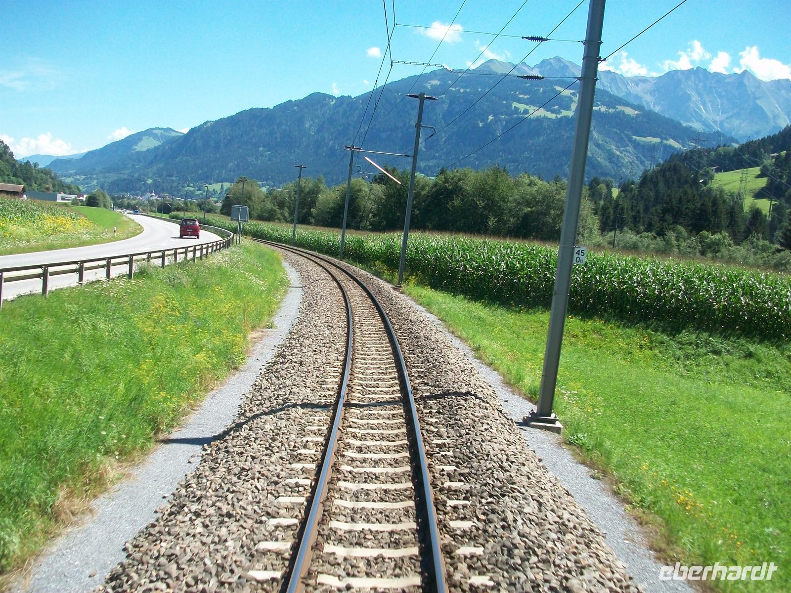 Dann überschreiten wir die Grenze zu Österreich und wenig später sind wir schon in der Schweiz. Wir schwenken ein in das Rheintal und sind bald inmitten der Berge angelangt die links und rechts unsere Fahrt flankieren. Wir legen noch eine Pause ein und durchfahren dann das Prättigau, ein wirklich malerisches Wiesental. Von hier steigen steil die Berge des Rätikon in die Höhe und durchflossen wird es vom romantischen Flüsschen Landquart.