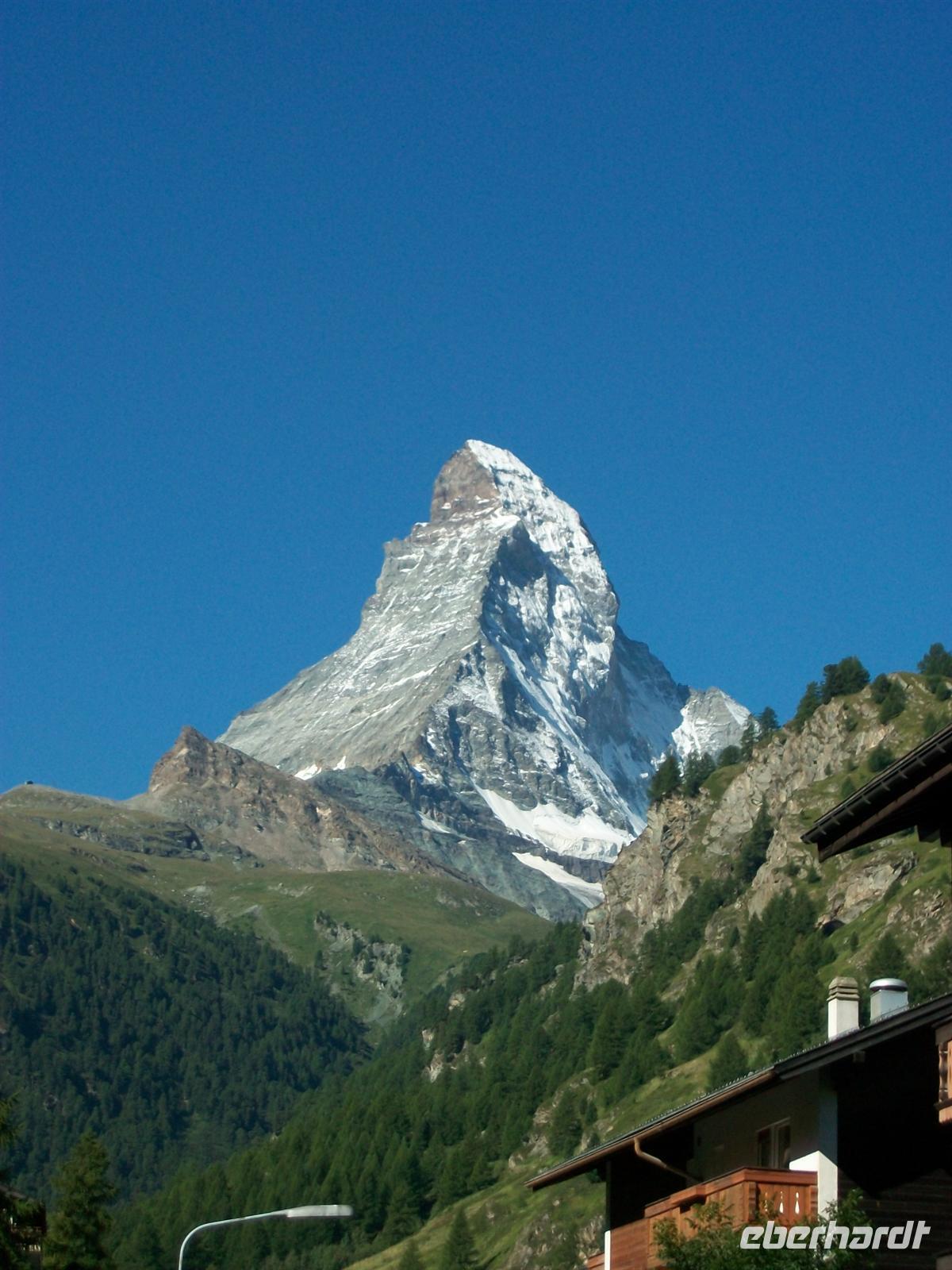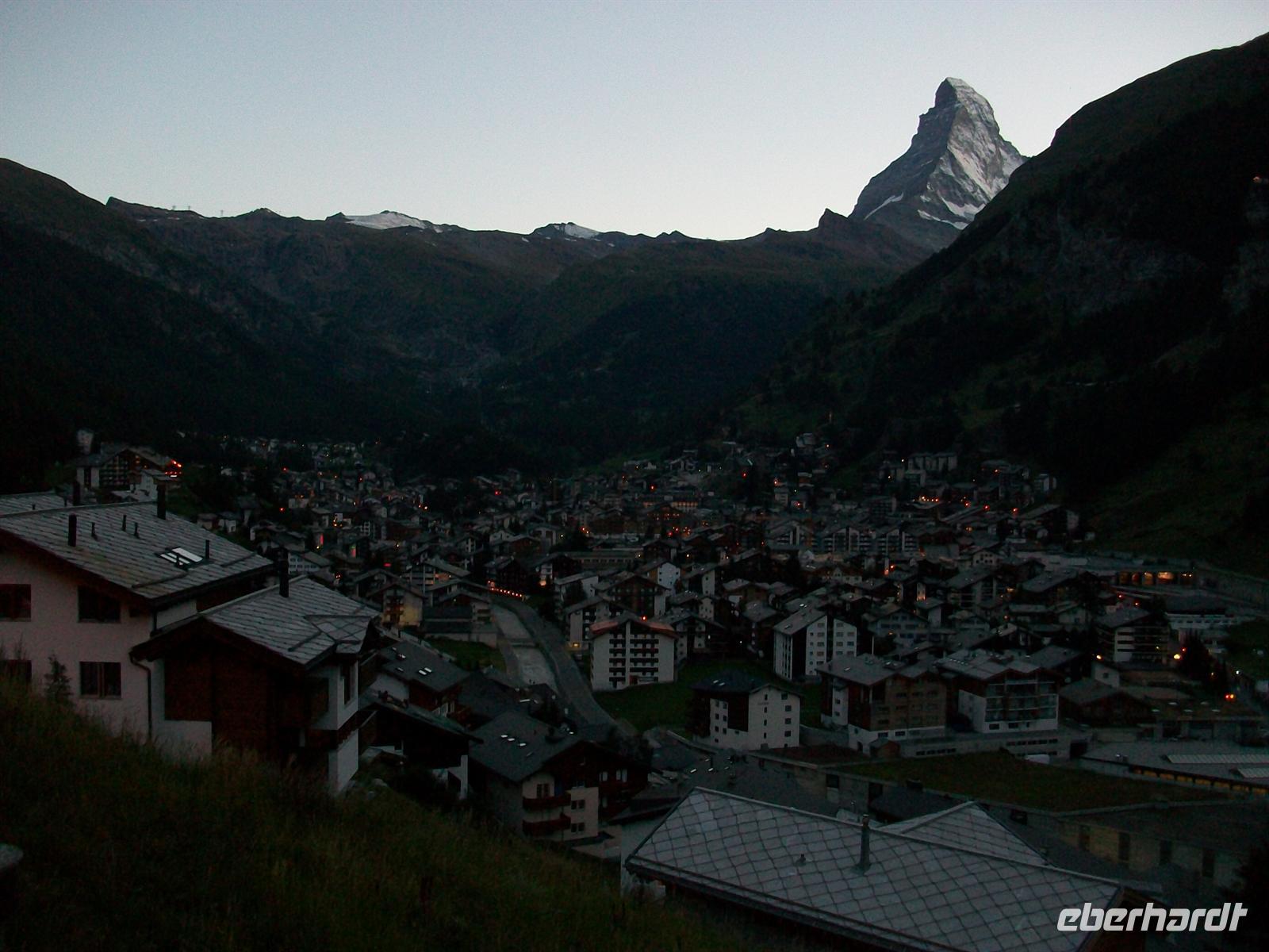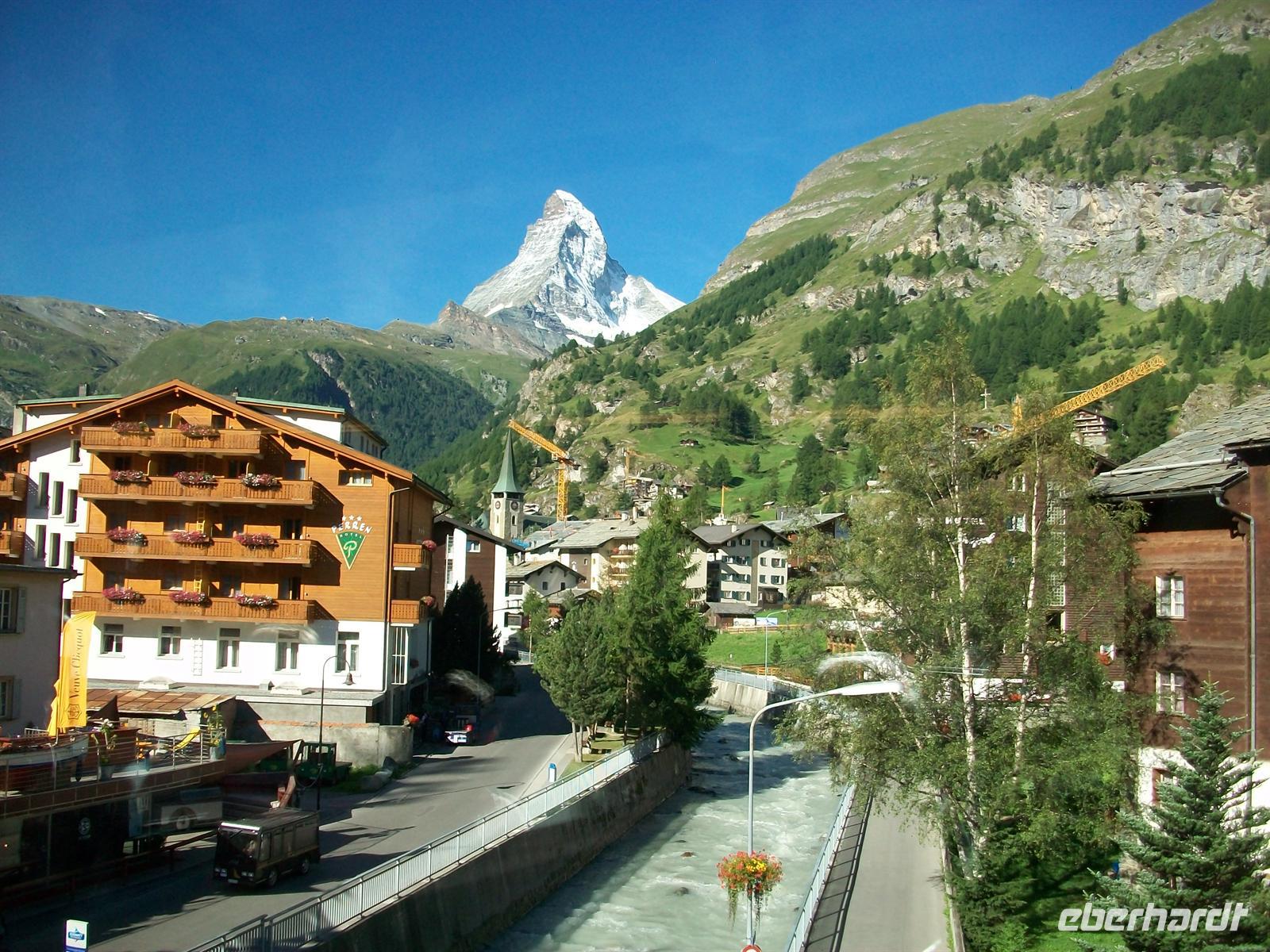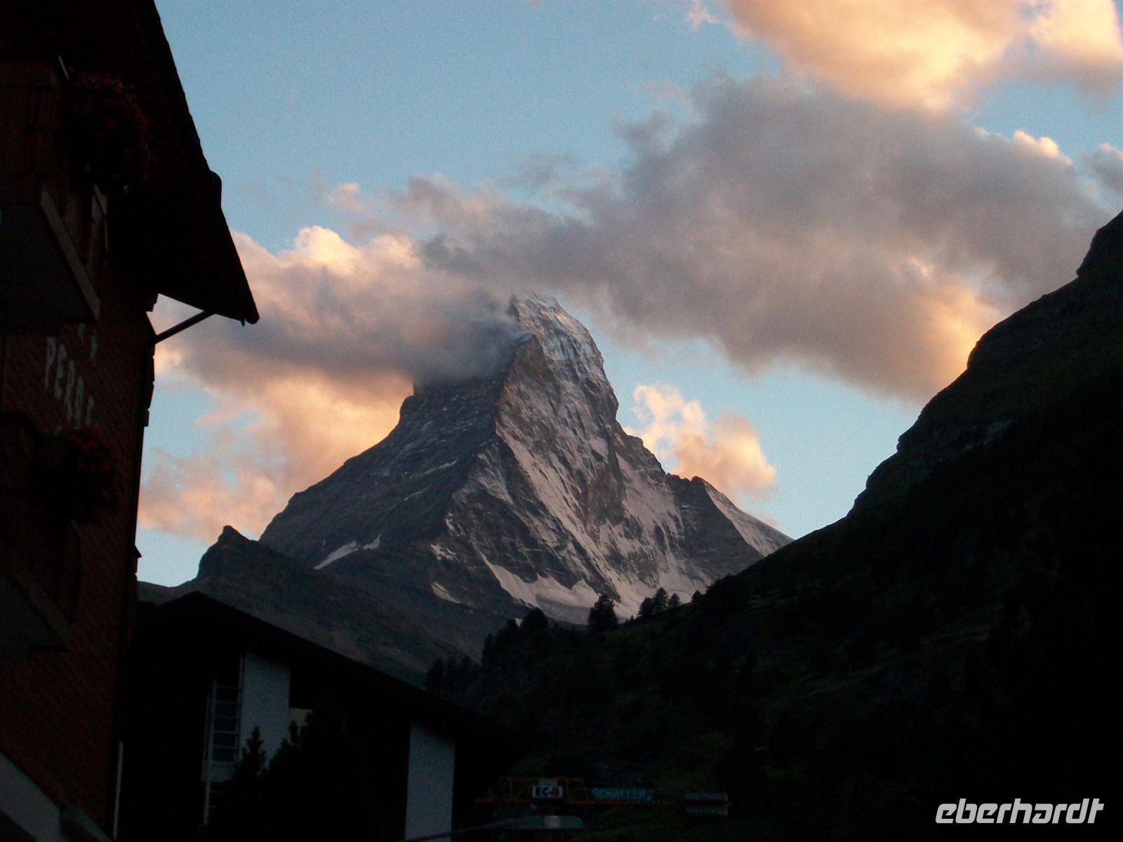 Unaufhörlich geht der Zeiger voran, vorbei an den Walliser Ortschaften des immer schmaler werdenden Tales langen wir kurz nach halb sieben in Zermatt an. Etwas abgespannt aber immer noch im Banne des Erlebten gehen wir zu unserem Hotel. Nun werden wir auch noch vom Matterhorn höchstpersönlich begrüßt, ohne eine Wolke ist es rechts zu sehen und die Fotografen kommen schon jetzt auf ihre Kosten. Am Hotel „Perren“ angelangt werden wir nett begrüßt, schnell sind die Zimmer bezogen und etwas später lassen wir uns in trauter Runde das reichhaltige und gute Abendessen schmecken. Ein wirklich ereignisreicher Tag neigt sich dem Ende entgegen und so mancher unserer Gäste gönnt sich noch einen Bummel durch das abendlich- romantische Zermatt.