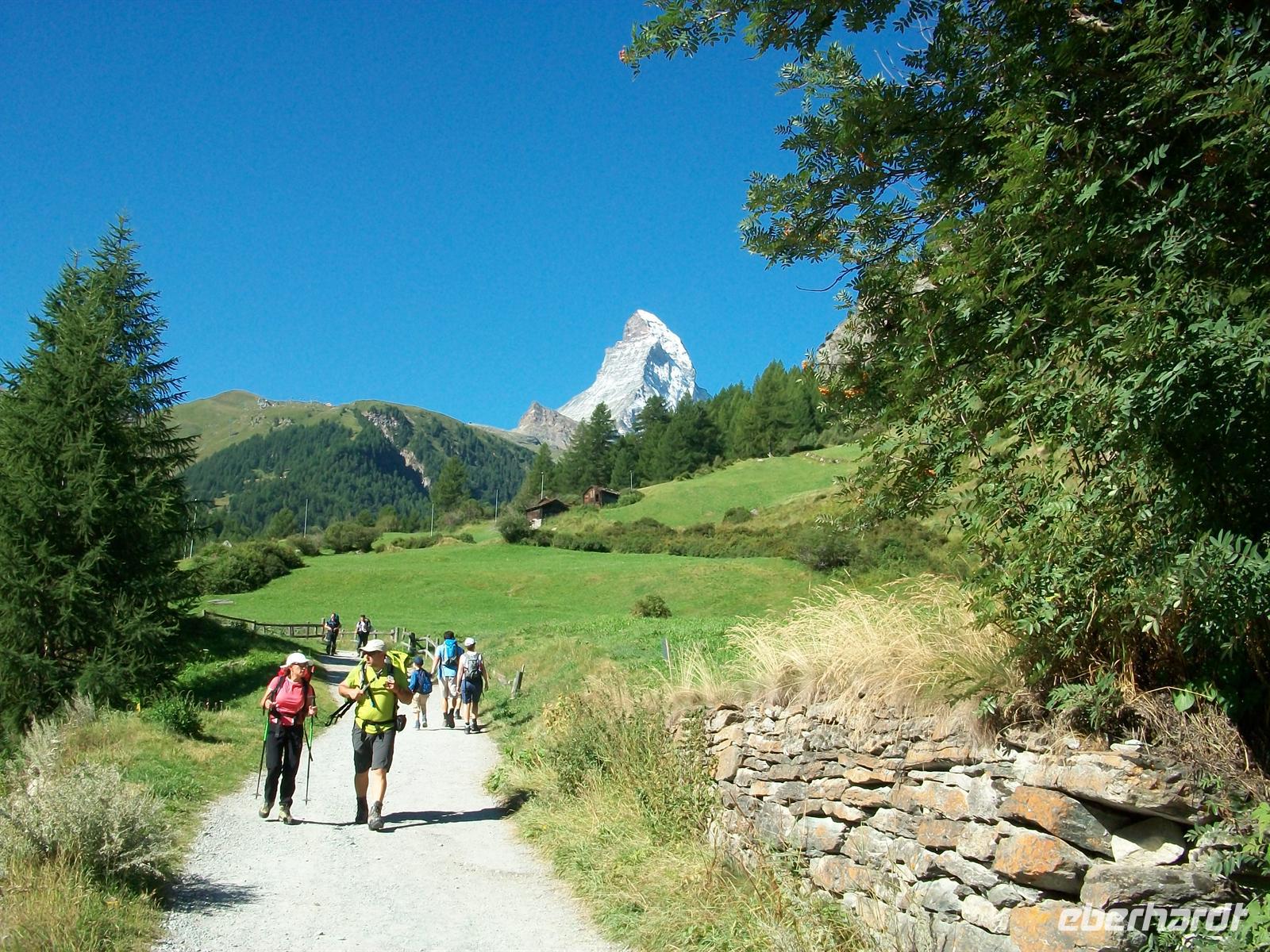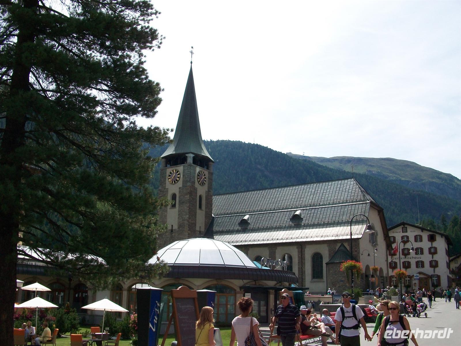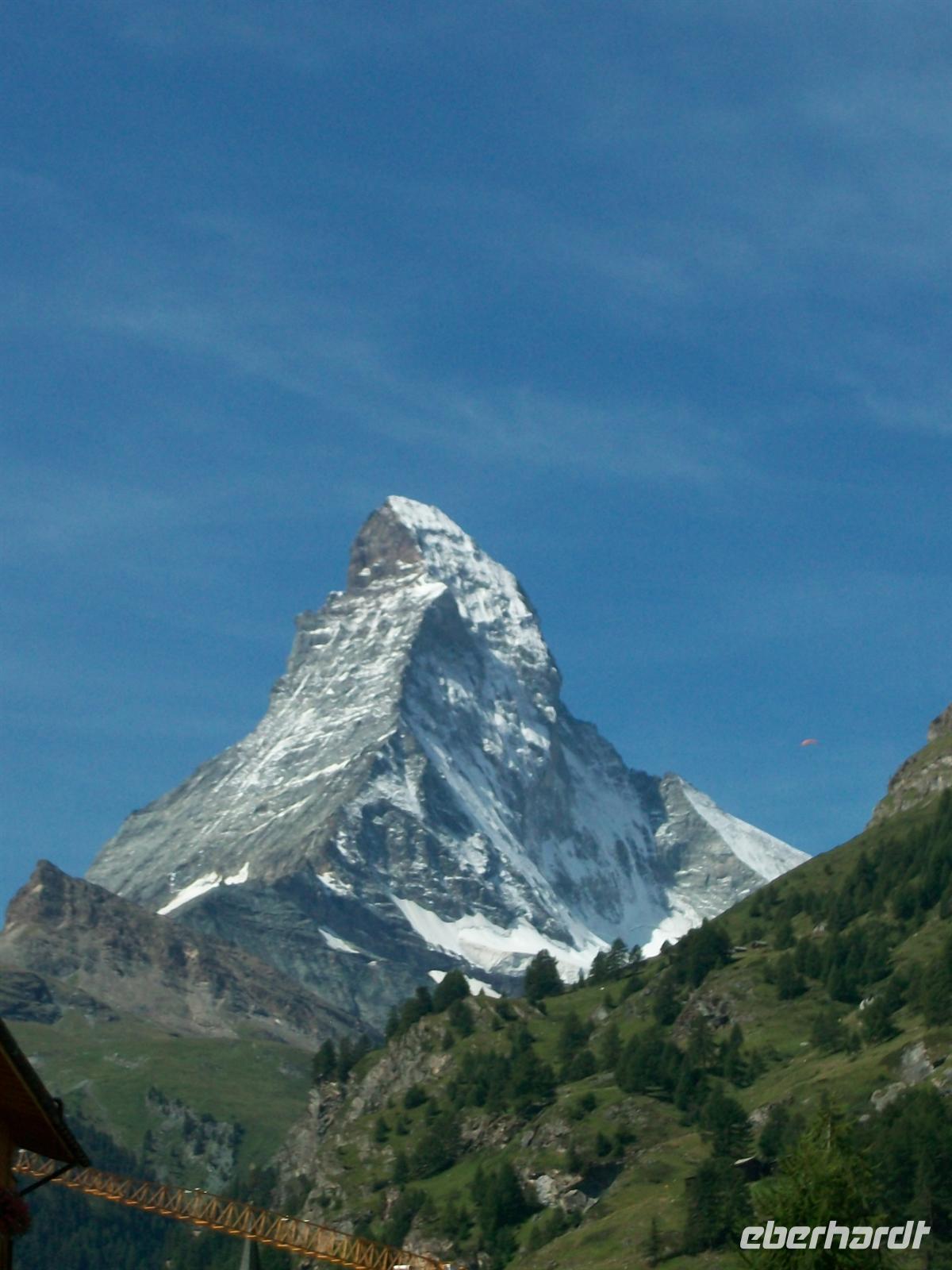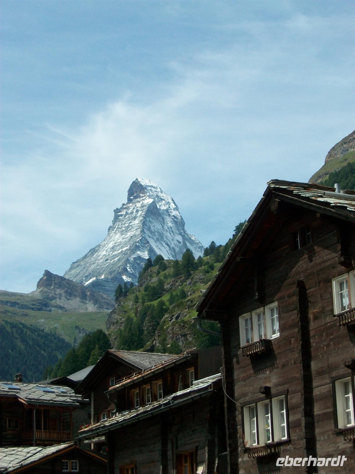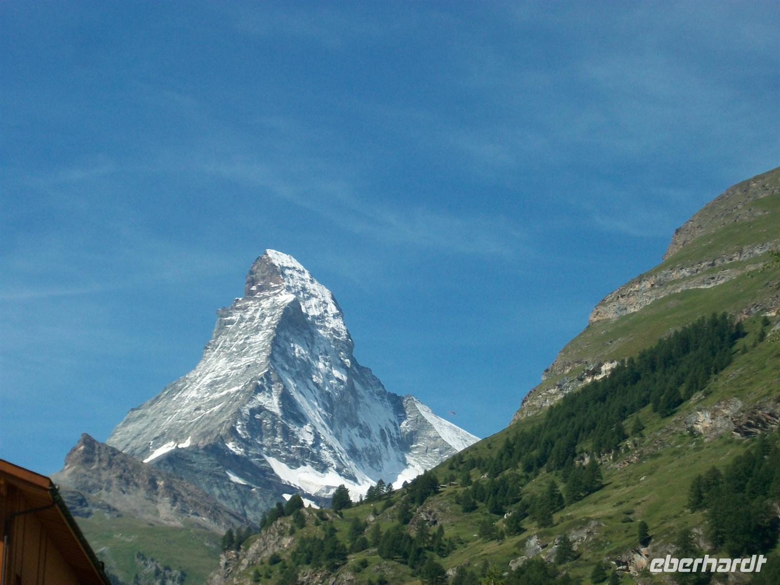 Unaufhörlich geht der Zeiger voran, vorbei an den Walliser Ortschaften des immer schmaler werdenden Tales langen wir kurz nach halb sieben in Zermatt an. Etwas abgespannt aber immer noch im Banne des Erlebten gehen wir zu unserem Hotel. Nun werden wir auch noch vom Matterhorn höchstpersönlich begrüßt, ohne eine Wolke ist es rechts zu sehen und die Fotografen kommen schon jetzt auf ihre Kosten. Am Hotel „Perren“ angelangt werden wir nett begrüßt, schnell sind die Zimmer bezogen und etwas später lassen wir uns in trauter Runde das reichhaltige und gute Abendessen schmecken. Ein wirklich ereignisreicher Tag neigt sich dem Ende entgegen und so mancher unserer Gäste gönnt sich noch einen Bummel durch das abendlich- romantische Zermatt.