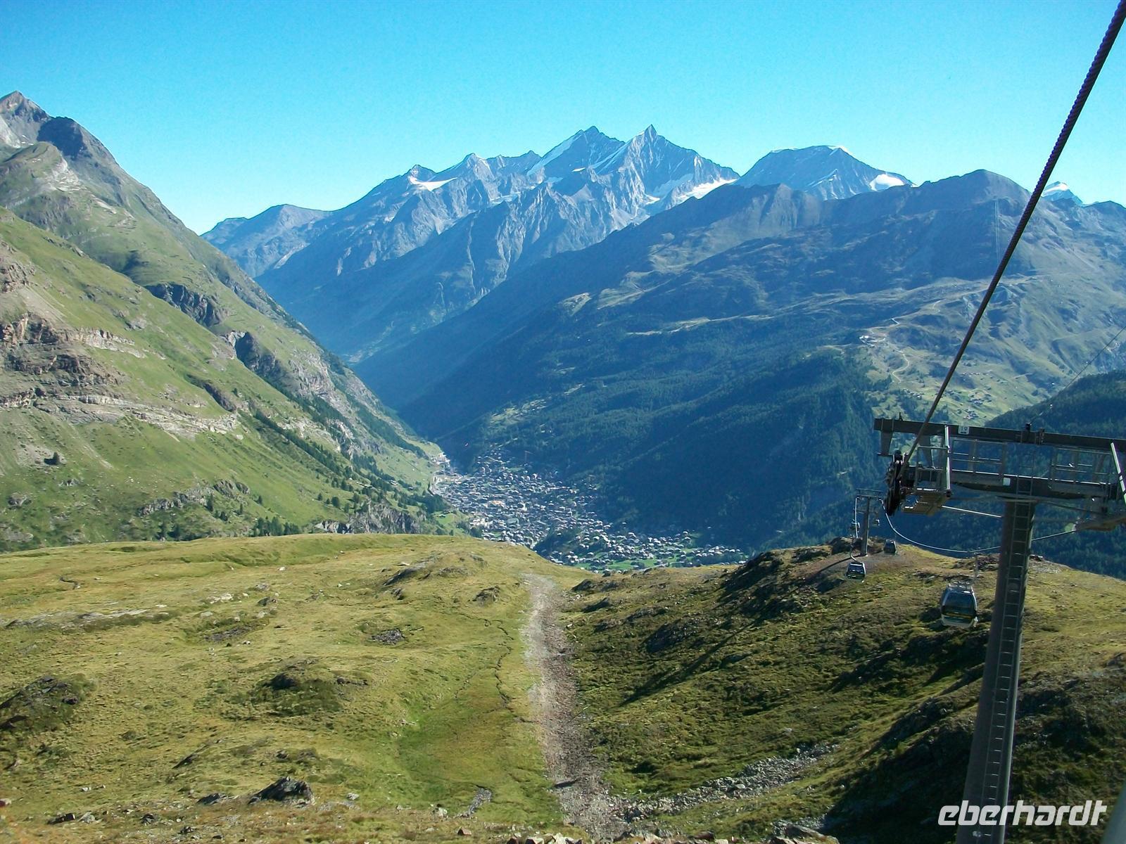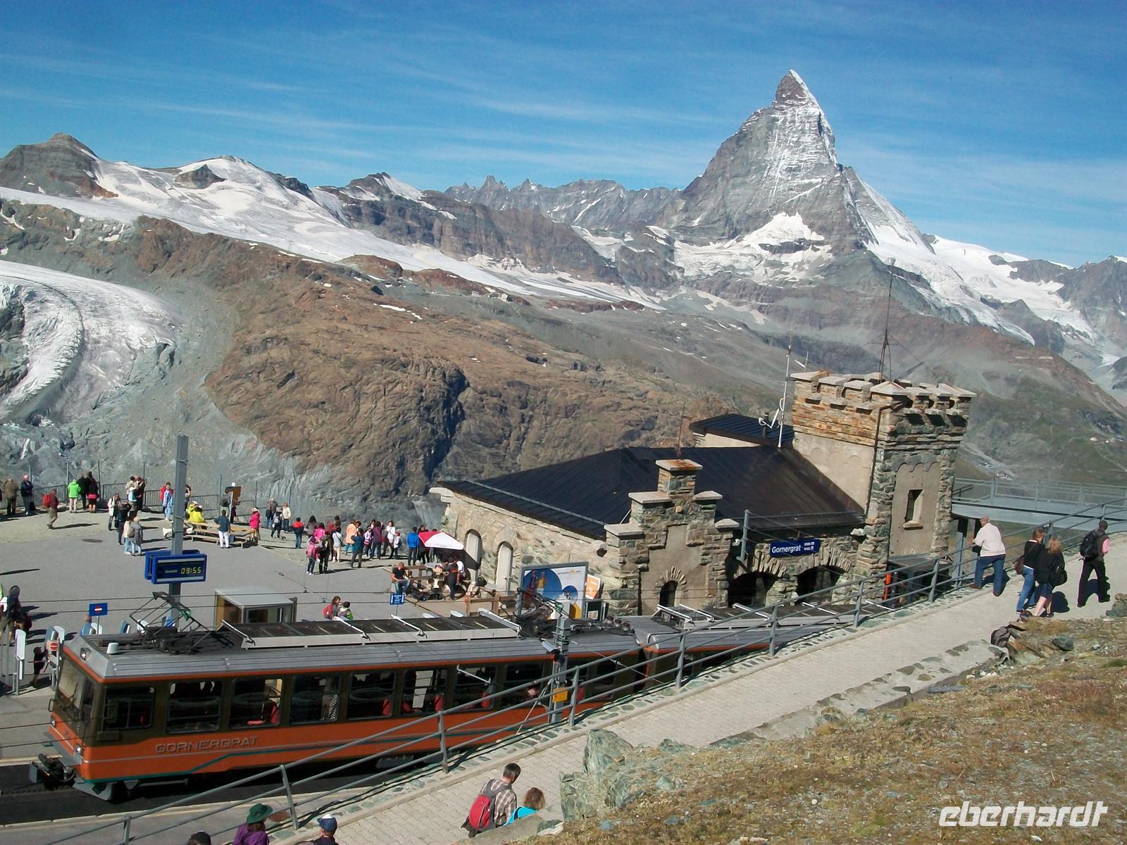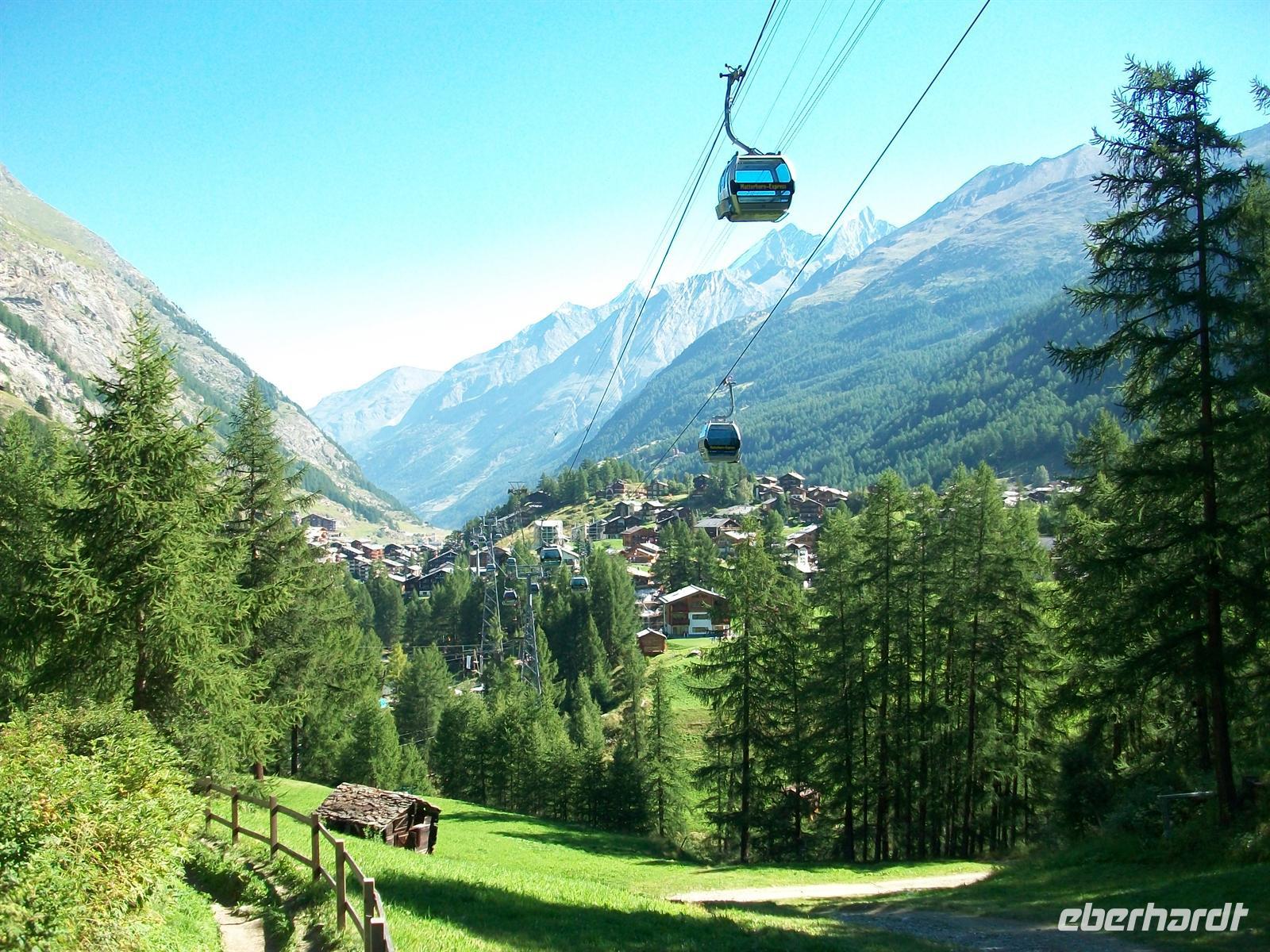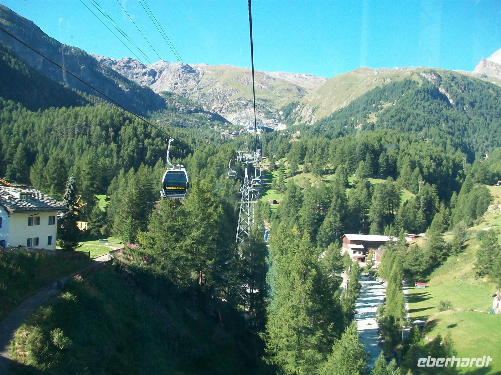 Doch zunächst fahren wir durch üppigen Baumbewuchs und sehen dabei wie die Häuser von Zermatt immer kleiner werden. Schnell gewinnen wir an Höhe, der Blick jedoch geht immer wieder hin zum magischen Berg. Keine Wolke trübt die Sicht und als wir höher kommen verschwinden die Bäume und der Blick wird frei über die Matten hin zu den anderen Schneebergen. Über den grünen Bewuchs huschen einige Murmeltiere, ein freilaufender Hund versucht eines zu bekommen, mit einem schrillen Pfiff aber warnt das Tier die anderen, schnell sind sie in ihrer Erdhöhle verschwunden und der Hund hat das Nachsehen.