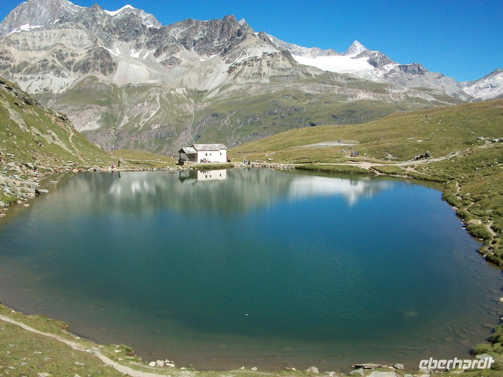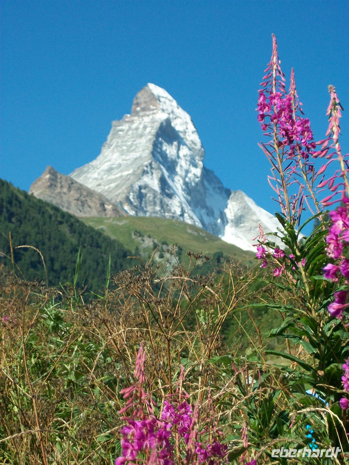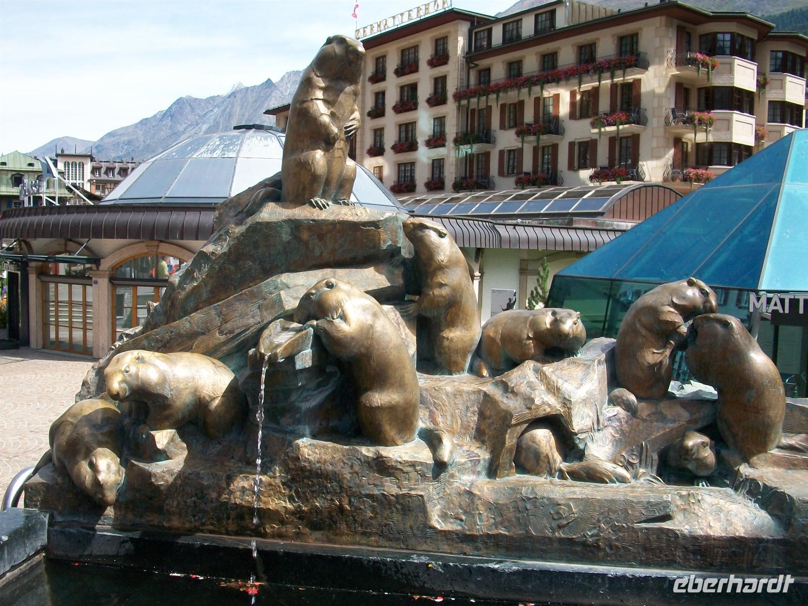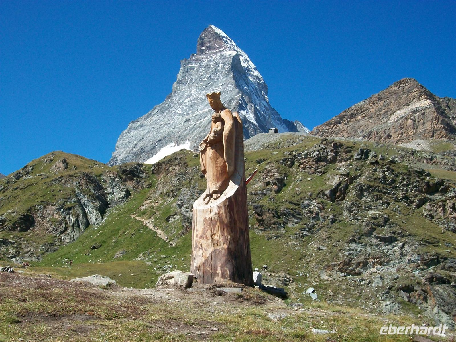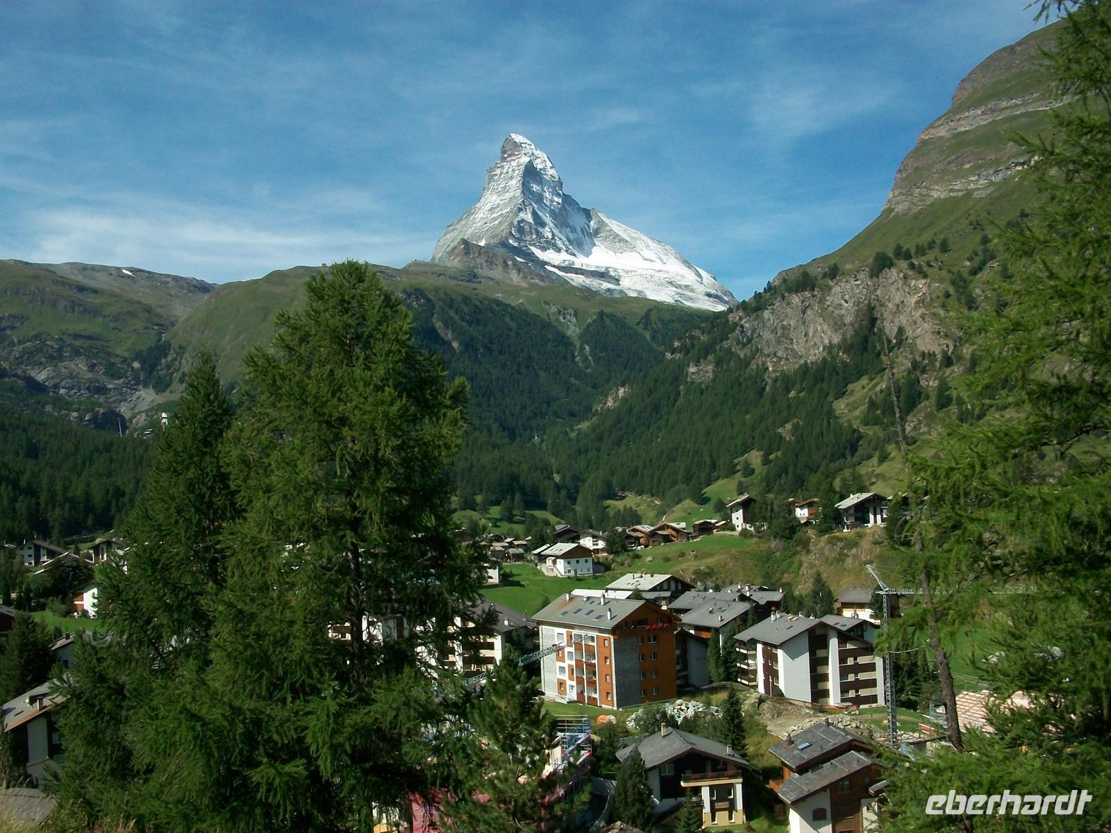 Doch zunächst fahren wir durch üppigen Baumbewuchs und sehen dabei wie die Häuser von Zermatt immer kleiner werden. Schnell gewinnen wir an Höhe, der Blick jedoch geht immer wieder hin zum magischen Berg. Keine Wolke trübt die Sicht und als wir höher kommen verschwinden die Bäume und der Blick wird frei über die Matten hin zu den anderen Schneebergen. Über den grünen Bewuchs huschen einige Murmeltiere, ein freilaufender Hund versucht eines zu bekommen, mit einem schrillen Pfiff aber warnt das Tier die anderen, schnell sind sie in ihrer Erdhöhle verschwunden und der Hund hat das Nachsehen.