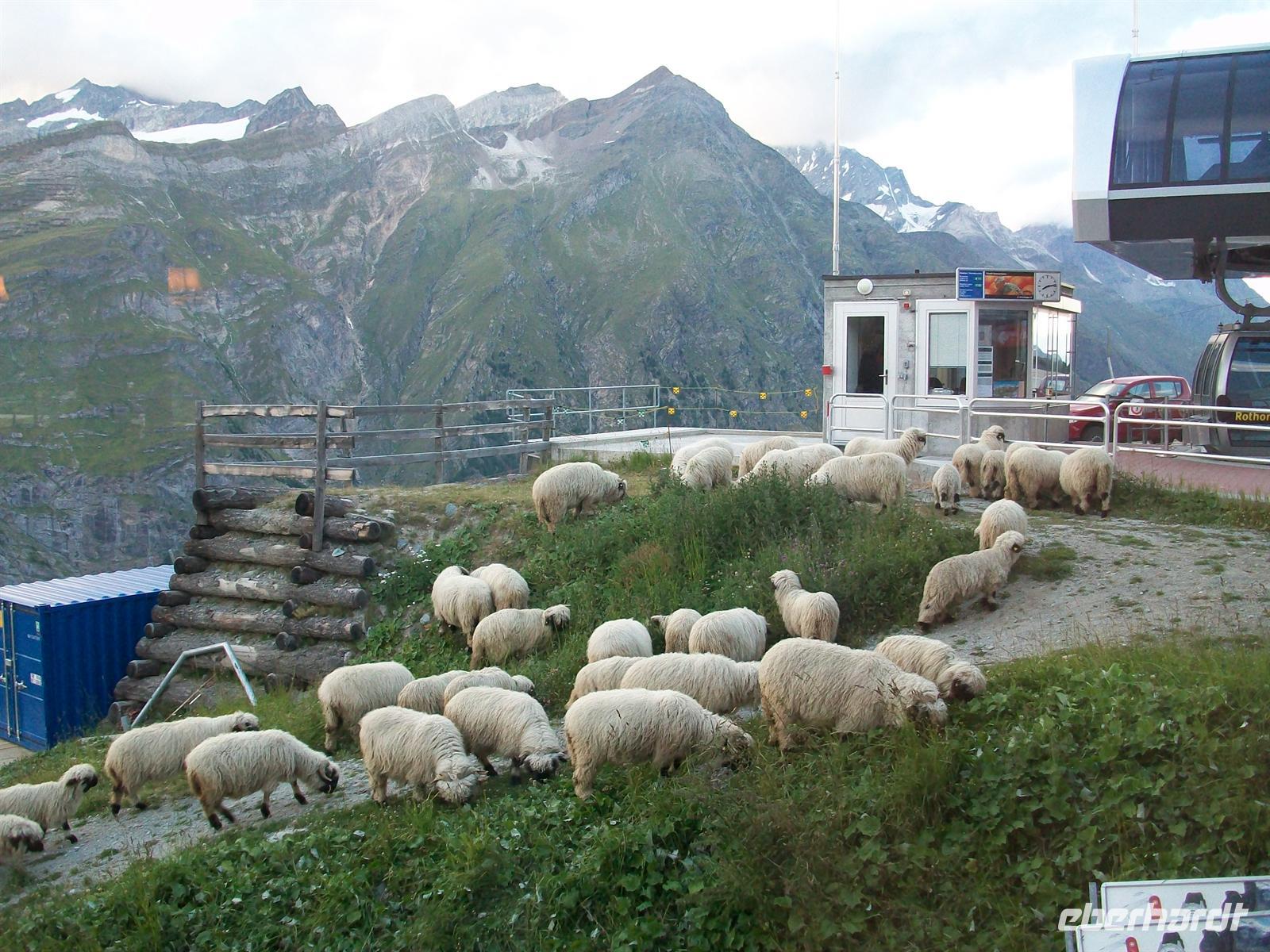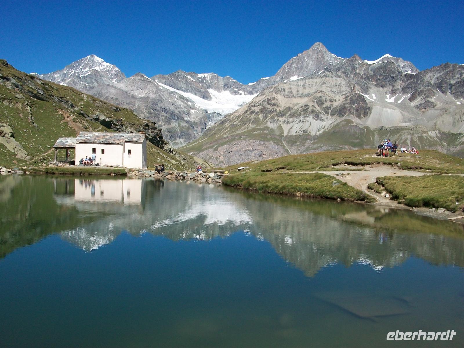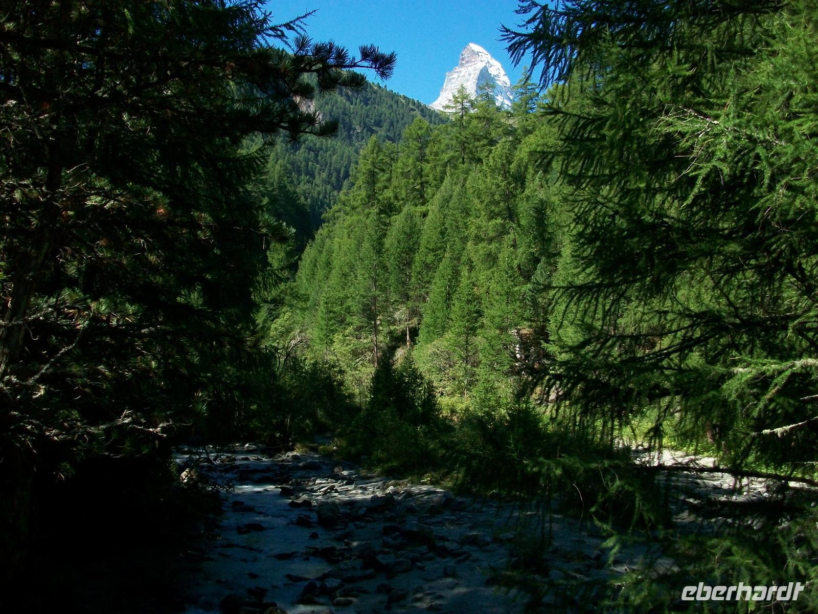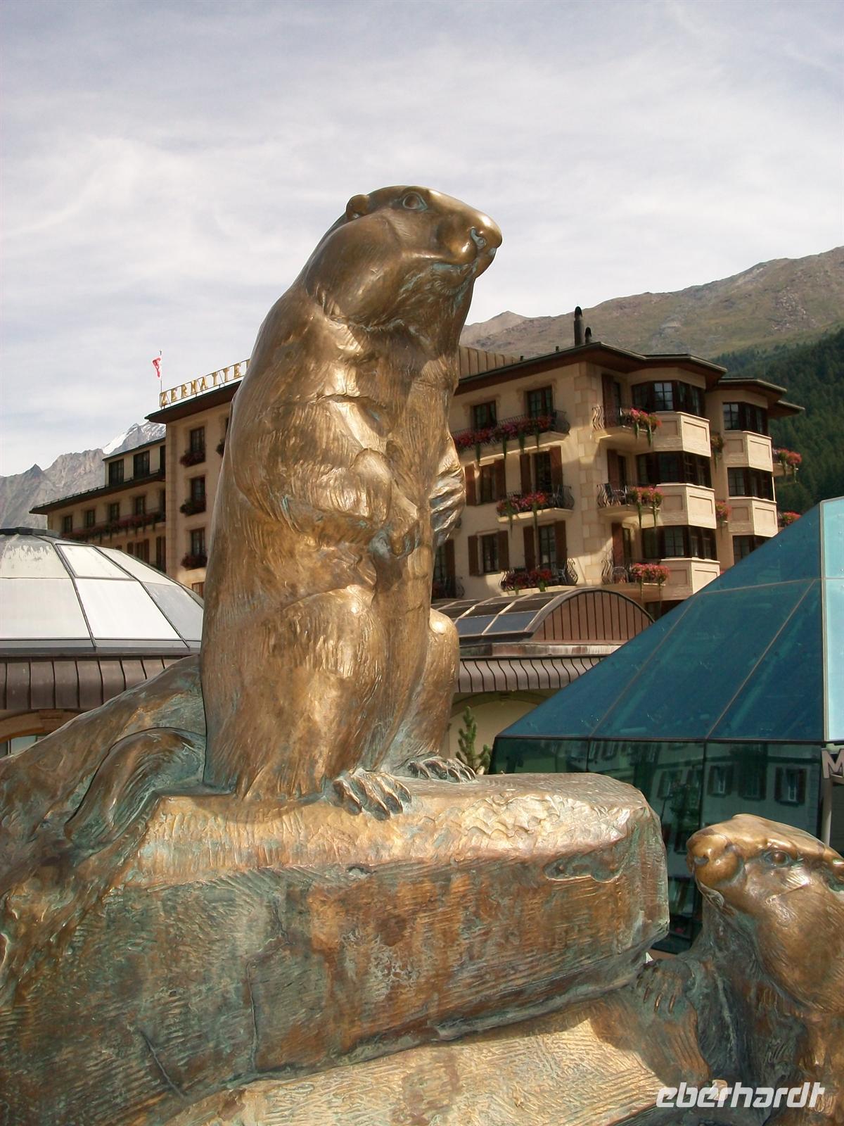 Doch zunächst fahren wir durch üppigen Baumbewuchs und sehen dabei wie die Häuser von Zermatt immer kleiner werden. Schnell gewinnen wir an Höhe, der Blick jedoch geht immer wieder hin zum magischen Berg. Keine Wolke trübt die Sicht und als wir höher kommen verschwinden die Bäume und der Blick wird frei über die Matten hin zu den anderen Schneebergen. Über den grünen Bewuchs huschen einige Murmeltiere, ein freilaufender Hund versucht eines zu bekommen, mit einem schrillen Pfiff aber warnt das Tier die anderen, schnell sind sie in ihrer Erdhöhle verschwunden und der Hund hat das Nachsehen.