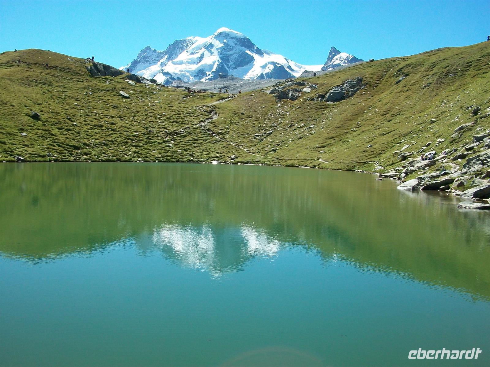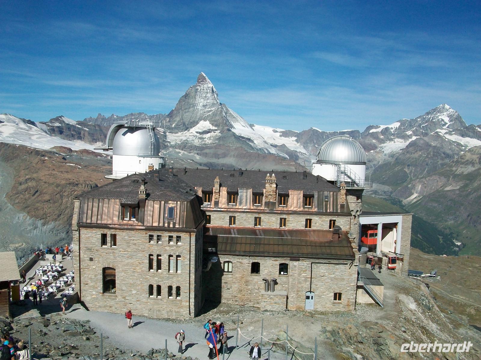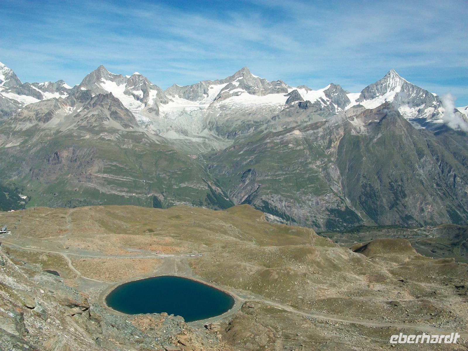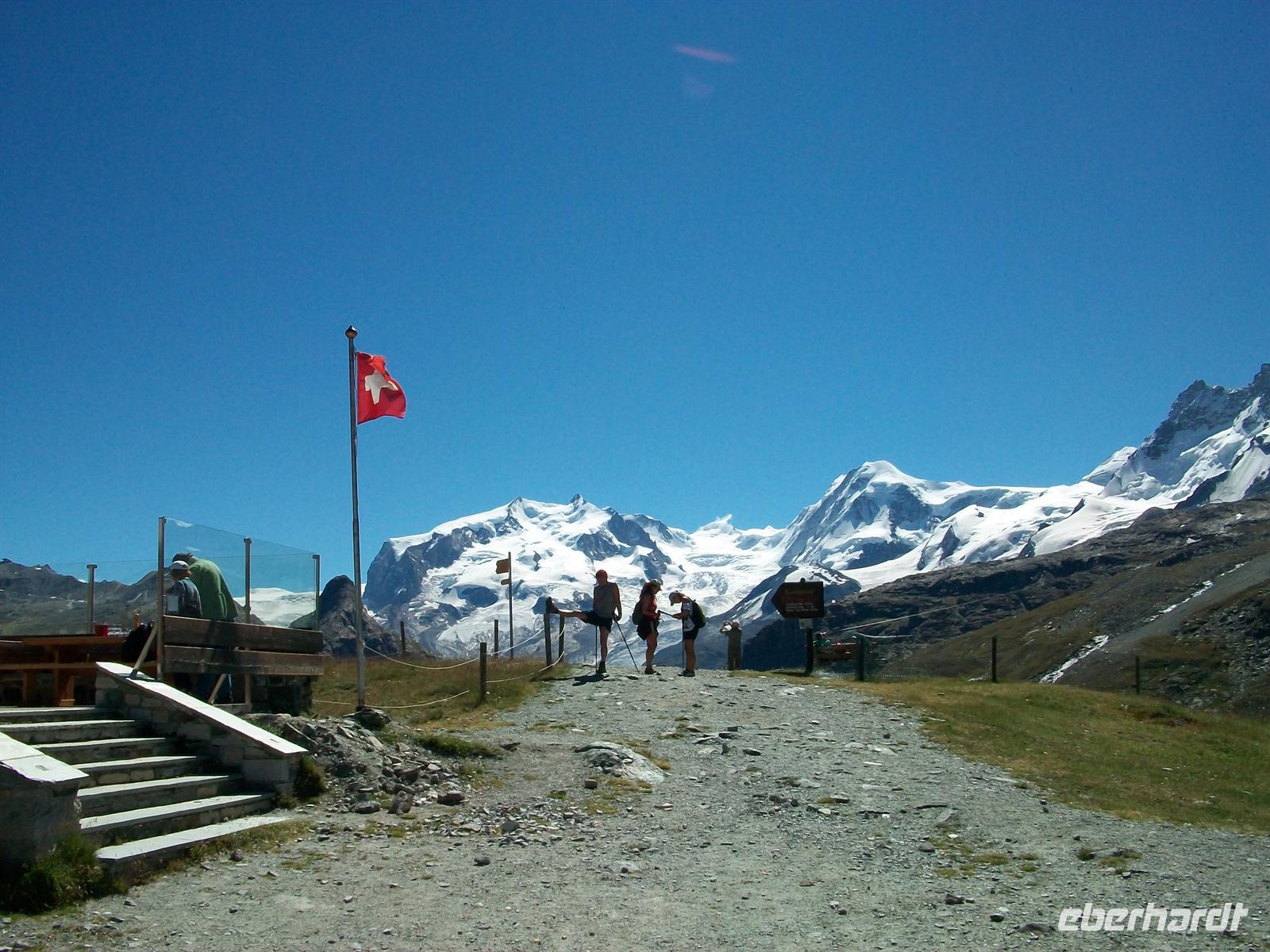 oben haben wir einen Panoramablick wie er schöner nicht sein kann. Die Sonne wirft ein grelles Licht auf den Schnee der die Augen blendet, aber der Blick ist wunderschön. Hinter uns sind die Walliser Alpen, vor uns im Südosten die Monte Rosa Gruppe, direkt gegenüber die Zwillinge und das Breithorn. Der Blick bleibt kurz am Klein-Matterhorn haften um dann endgültig weiter zu schwenken zum Berg der Berge. Dabei gibt es hier oben am Gornergrat eine himmlische Ruhe zumindest wenn man auf den zahlreichen Wanderwegen etwas Abstand von den Touristen gewinnt.