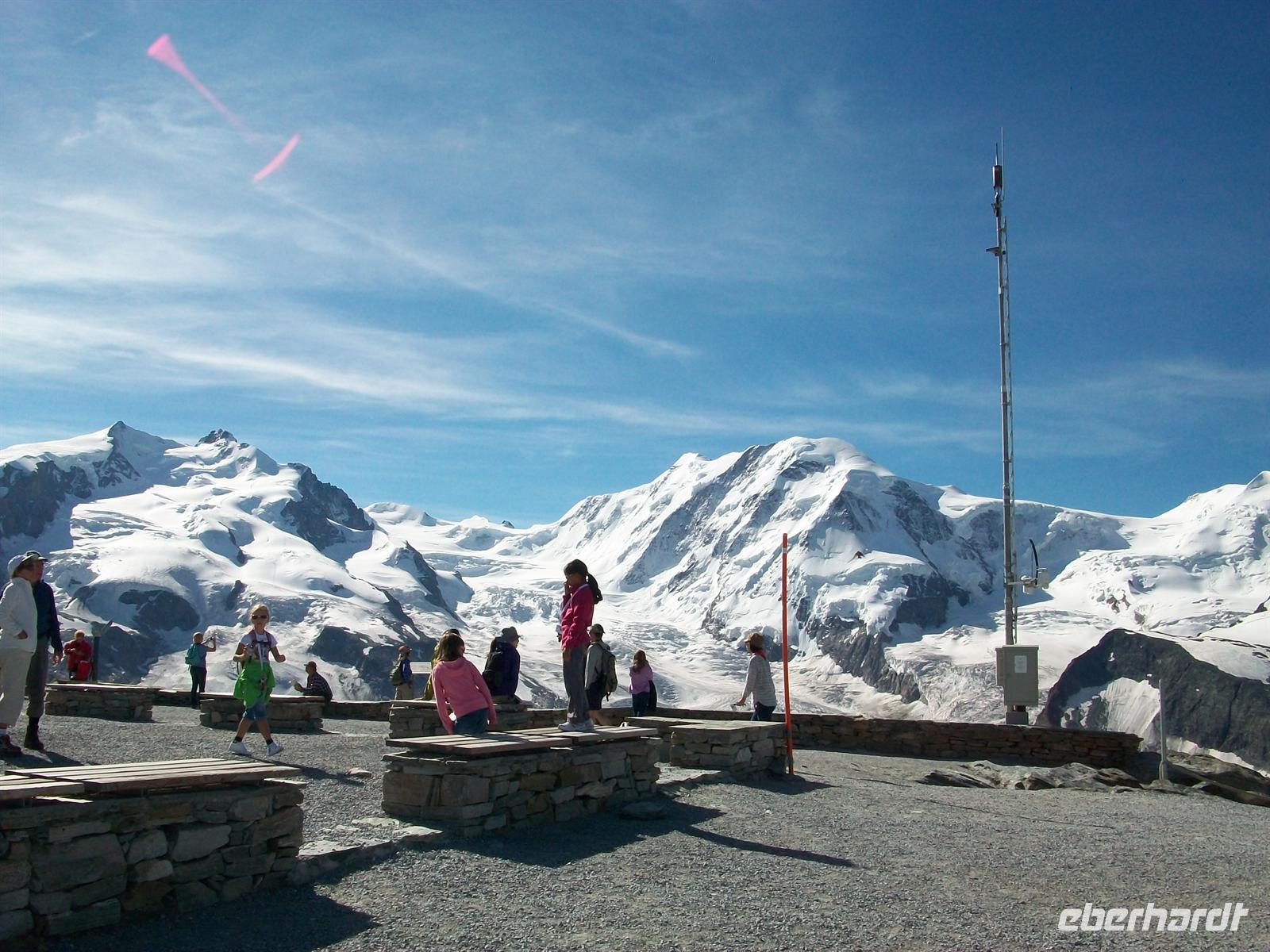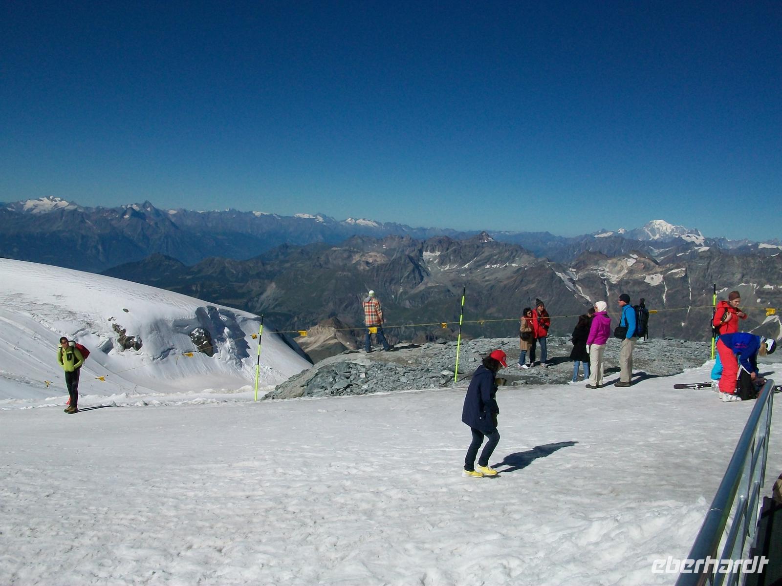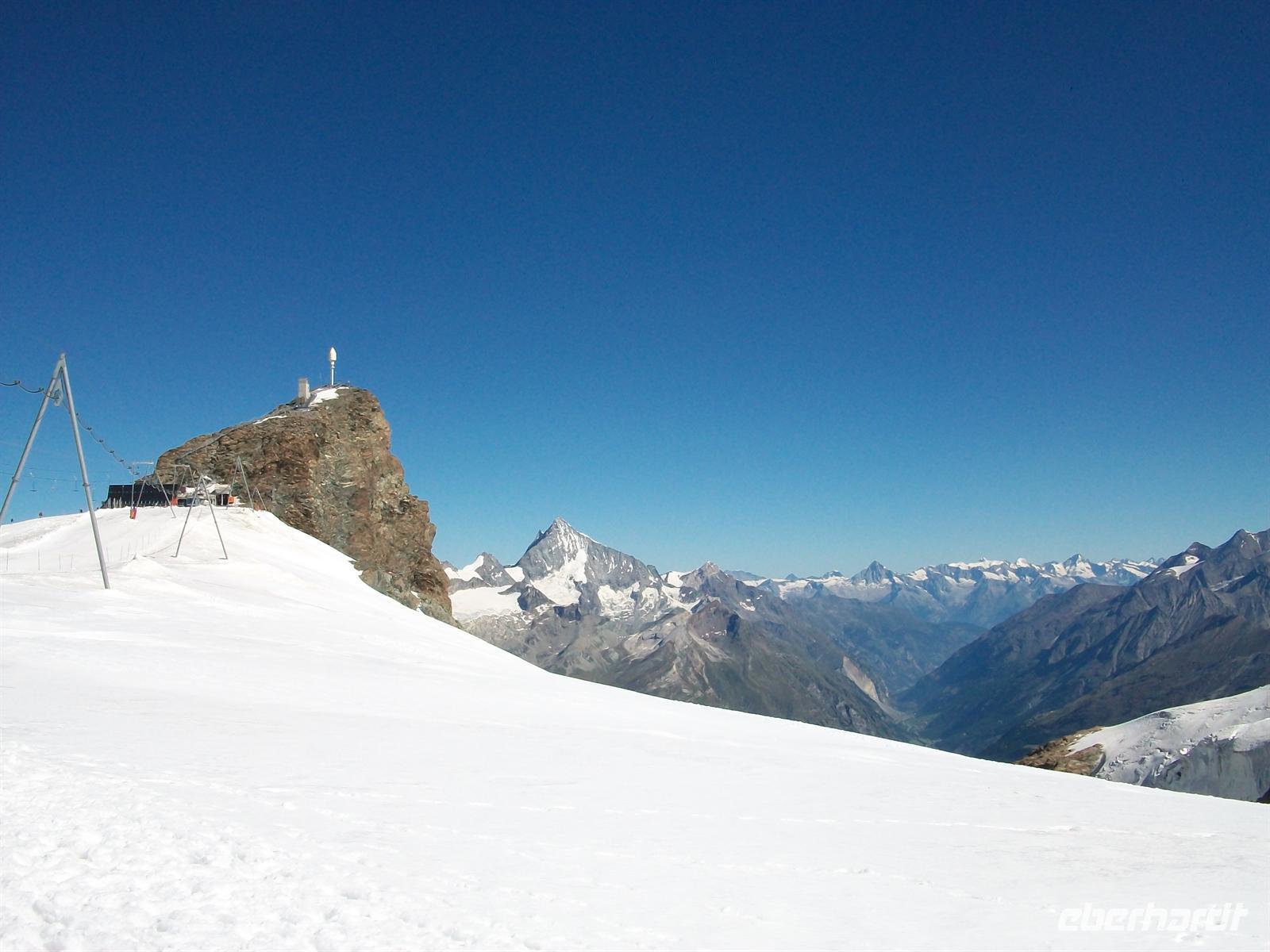 umrahmt von den unendlich vielen Bergspitzen hat sich ein dunkelblauer Himmel aufgespannt der keine Wolke trägt. Hier oben gibt es einen uneingeschränkten Panoramablick, das Matterhorn ist allerdings durch die verschobene Perspektive gar nicht so spektakulär. Gegenüber ist das Breithorn zu sehen, bedeckt mit einer dicken Schneedecke sind hier ameisenklein Wanderer zu sehen die diesen 4 000er besteigen. Vor uns eine lange Fläche auf denen Skilifte in Betrieb sind, etwas weiter unten sind Skifahrer unterwegs die lustig zu Tal wedeln. Interessant ist in dieser Höhe auch die Färbung des Himmels anzusehen, über den Bergen ist ein hellblauer Schimmer der bald einen dunkleren Farbton annimmt um dann direkt über unseren Köpfen dunkelblau wird, ein solch dunkles Blau gibt es, glaube ich, nur in diesen Höhen- faszinierend.