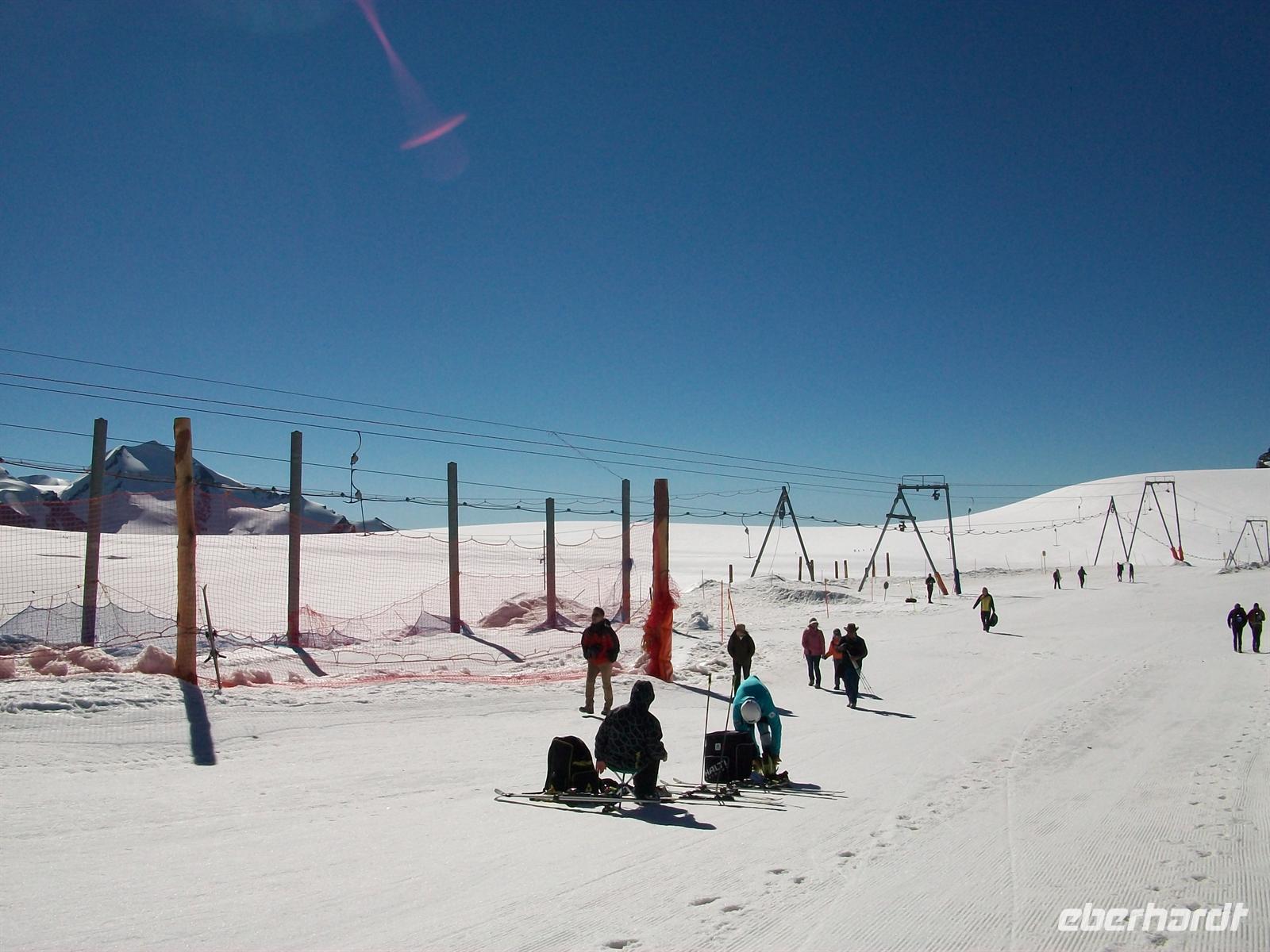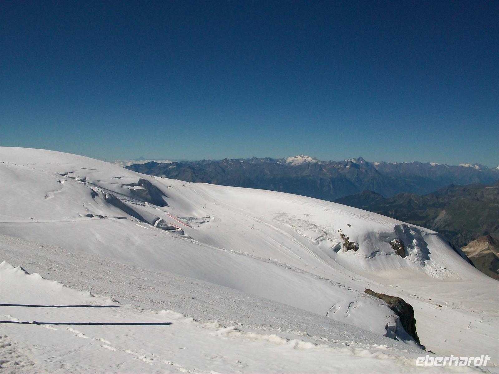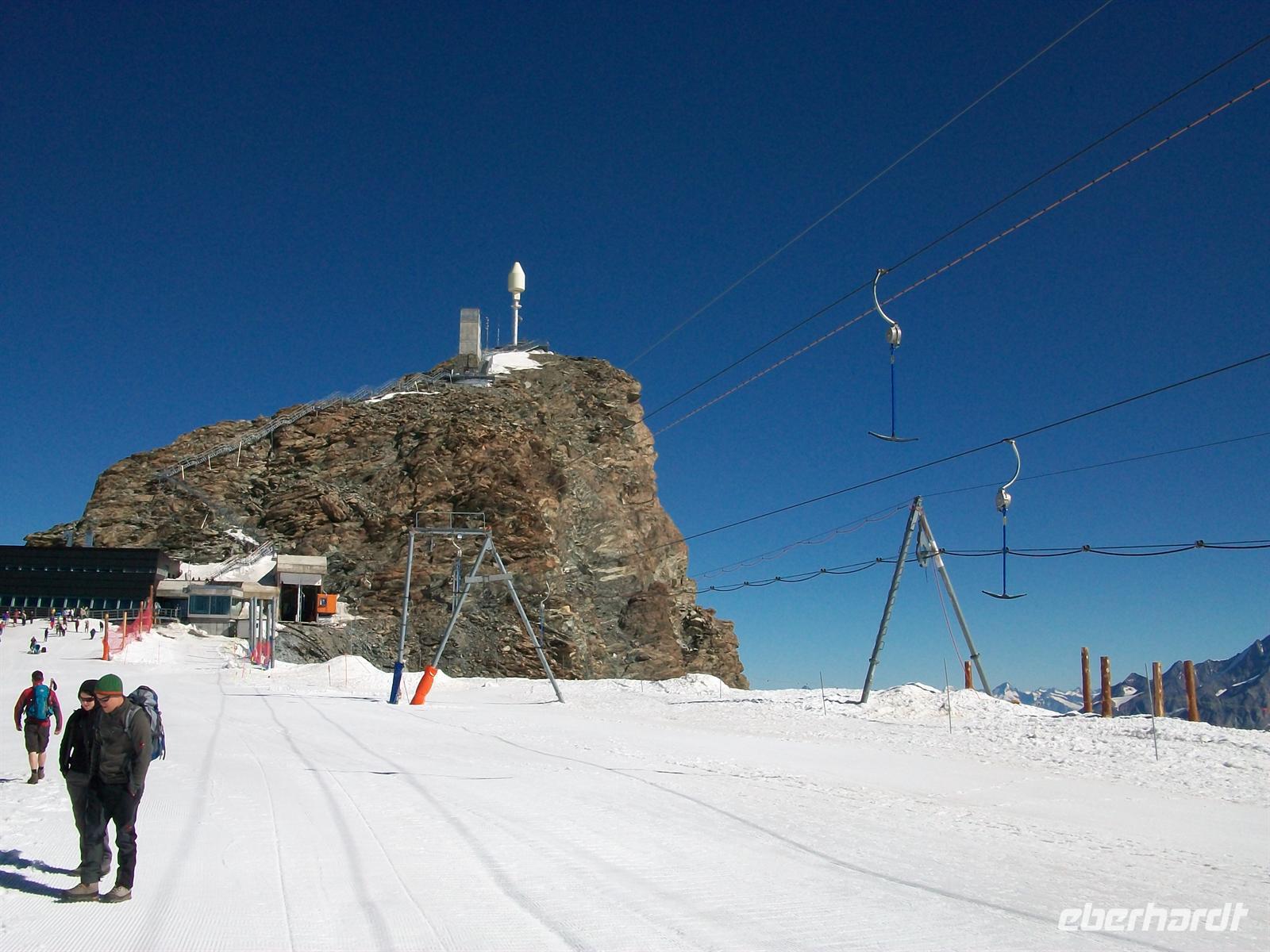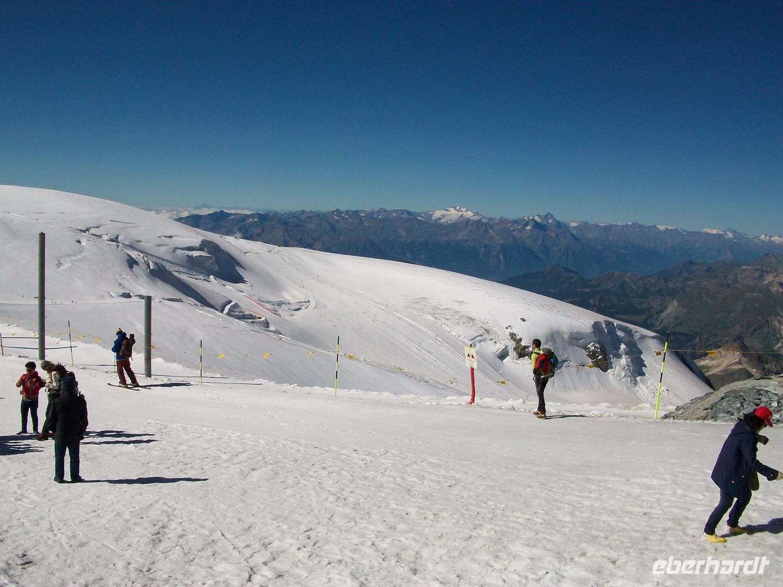 umrahmt von den unendlich vielen Bergspitzen hat sich ein dunkelblauer Himmel aufgespannt der keine Wolke trägt. Hier oben gibt es einen uneingeschränkten Panoramablick, das Matterhorn ist allerdings durch die verschobene Perspektive gar nicht so spektakulär. Gegenüber ist das Breithorn zu sehen, bedeckt mit einer dicken Schneedecke sind hier ameisenklein Wanderer zu sehen die diesen 4 000er besteigen. Vor uns eine lange Fläche auf denen Skilifte in Betrieb sind, etwas weiter unten sind Skifahrer unterwegs die lustig zu Tal wedeln. Interessant ist in dieser Höhe auch die Färbung des Himmels anzusehen, über den Bergen ist ein hellblauer Schimmer der bald einen dunkleren Farbton annimmt um dann direkt über unseren Köpfen dunkelblau wird, ein solch dunkles Blau gibt es, glaube ich, nur in diesen Höhen- faszinierend.