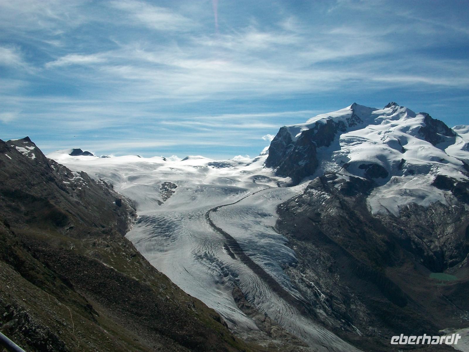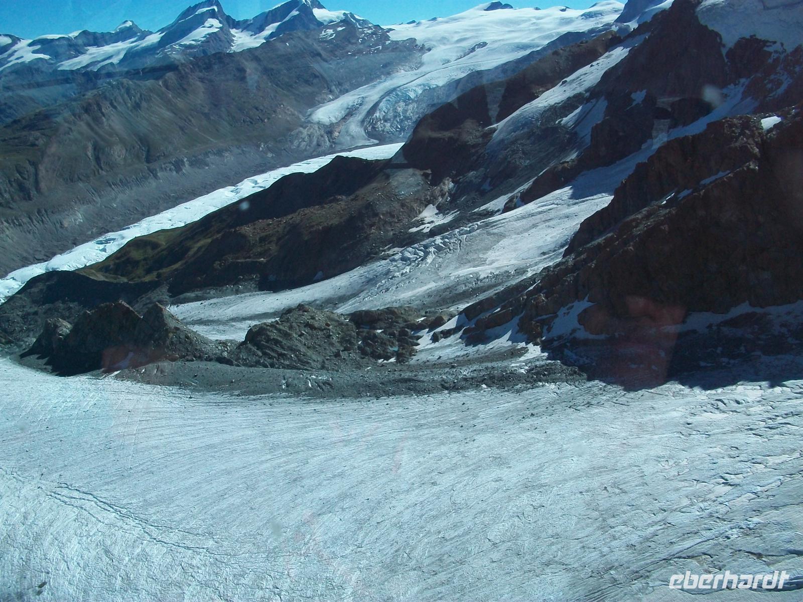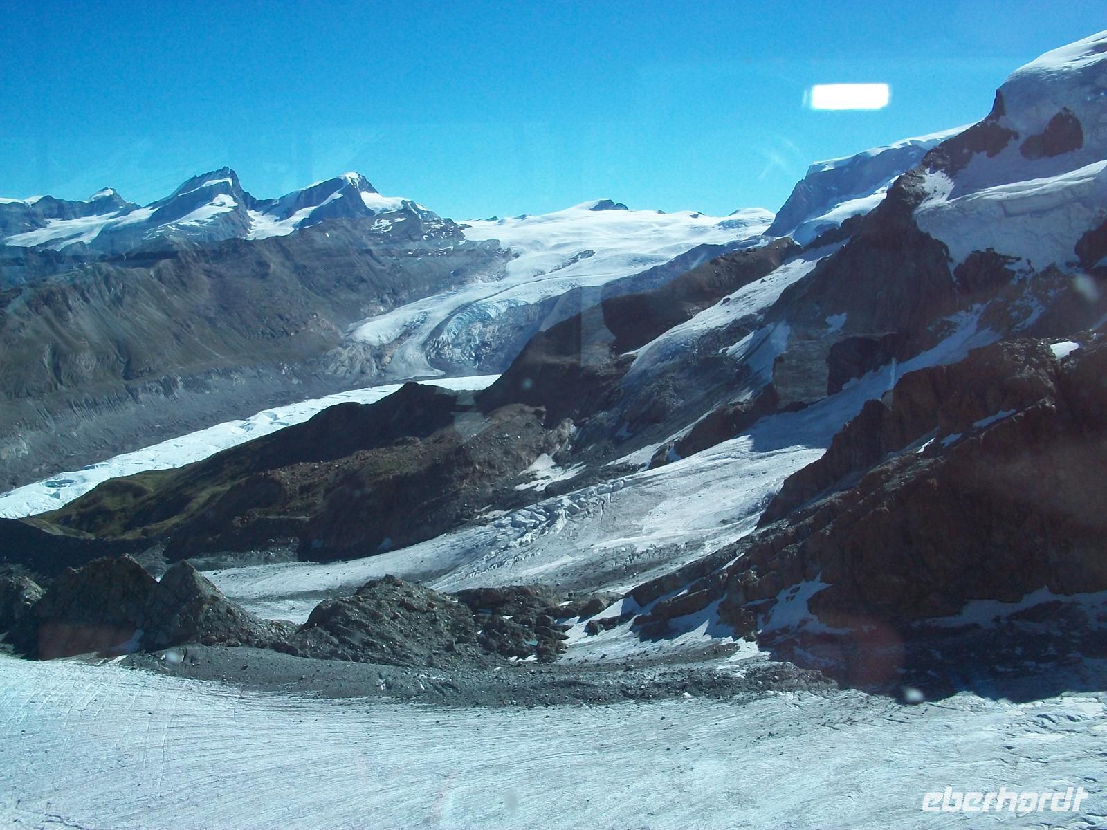 Vom Aussichtspunkt schweift der Blick hinauf zu den Spitzen der 4 000er, sie tragen das ewige Weiß und zu unseren Füßen gähnt der steile Abgrund mit seinem Gletscher. Über allem drehen die Bergdohlen ihre Kreise, wohlwissend dass manch ein Tourist Brot mit dabei hat. Vorsichtig nähern sich diese possierlichen Vögel und die Mutigsten holen sich das Futter direkt von der Hand. Hier