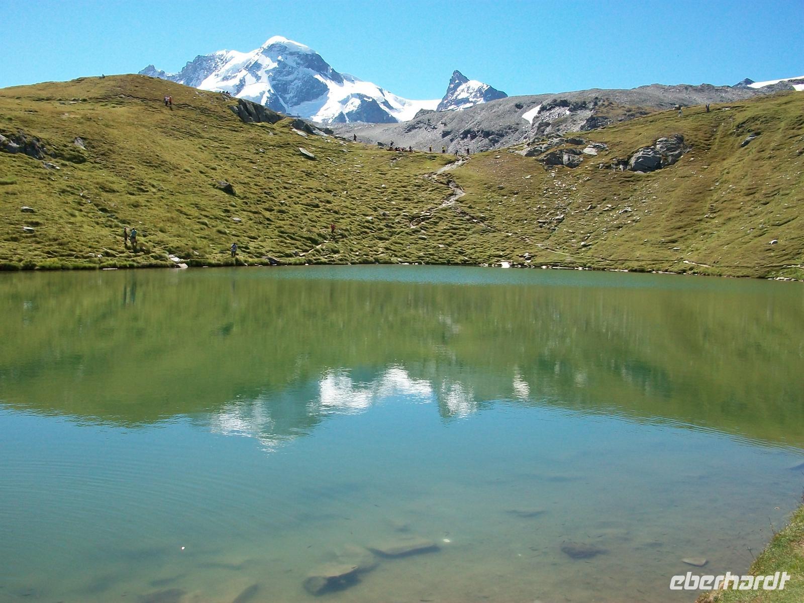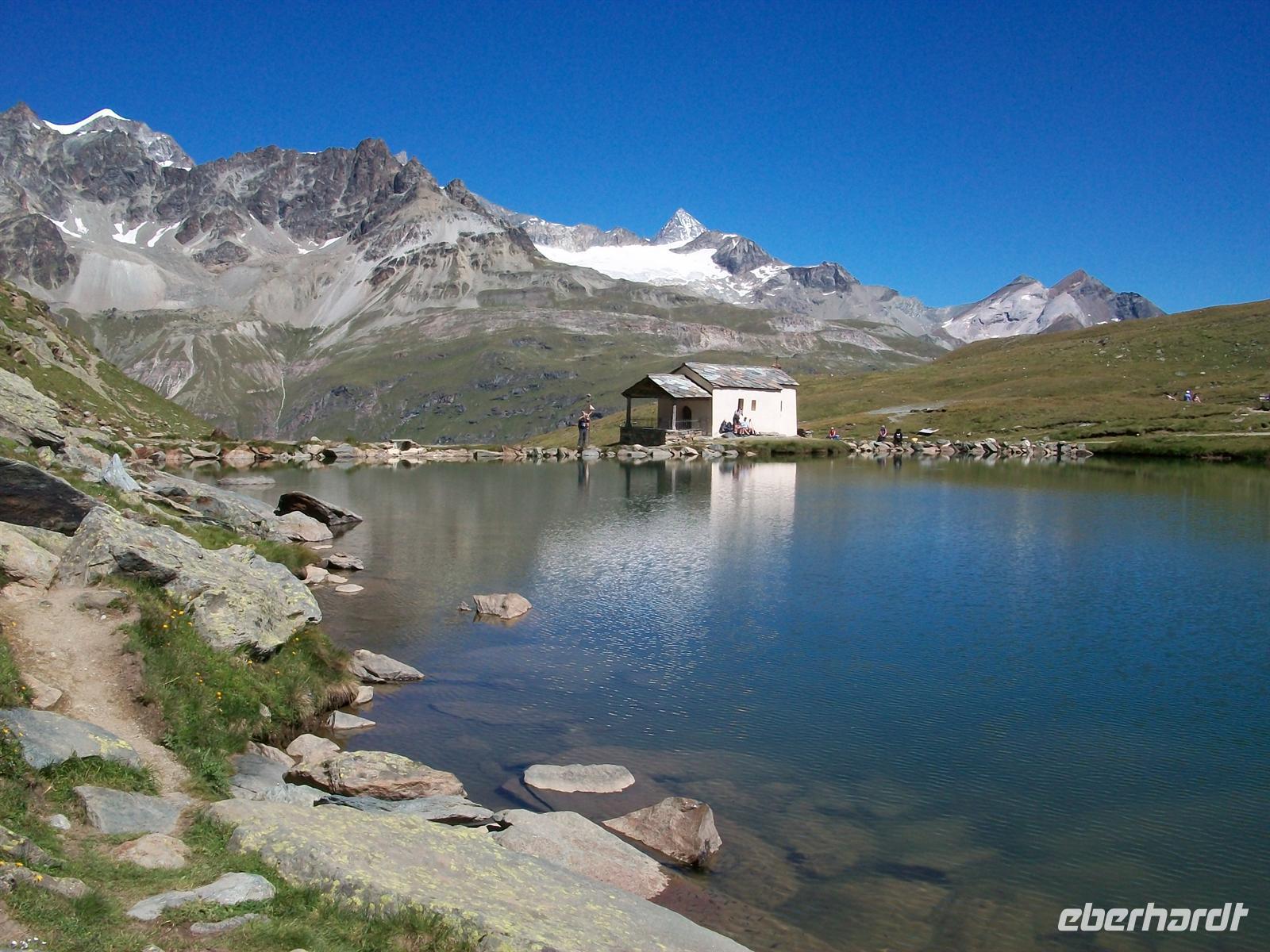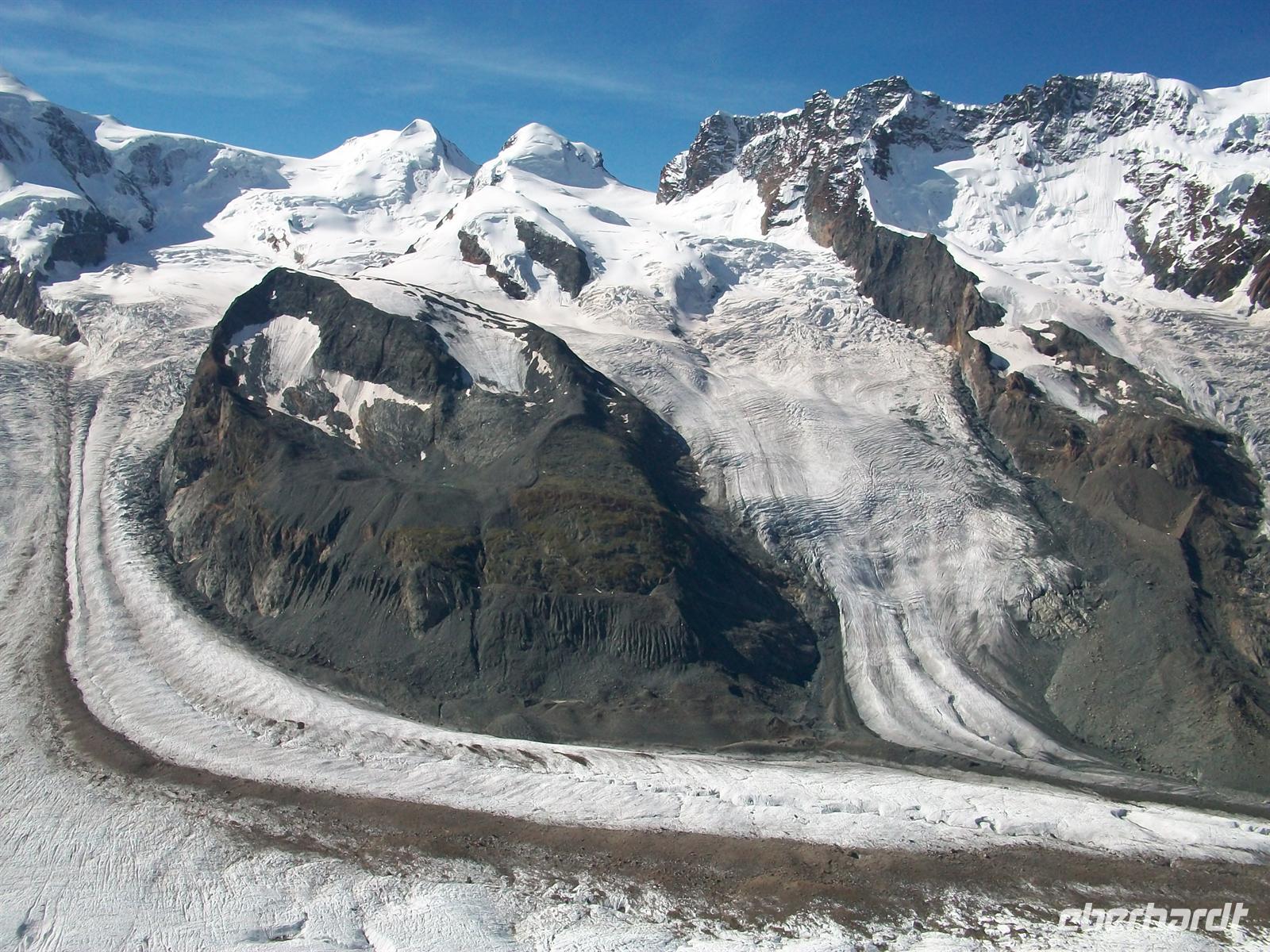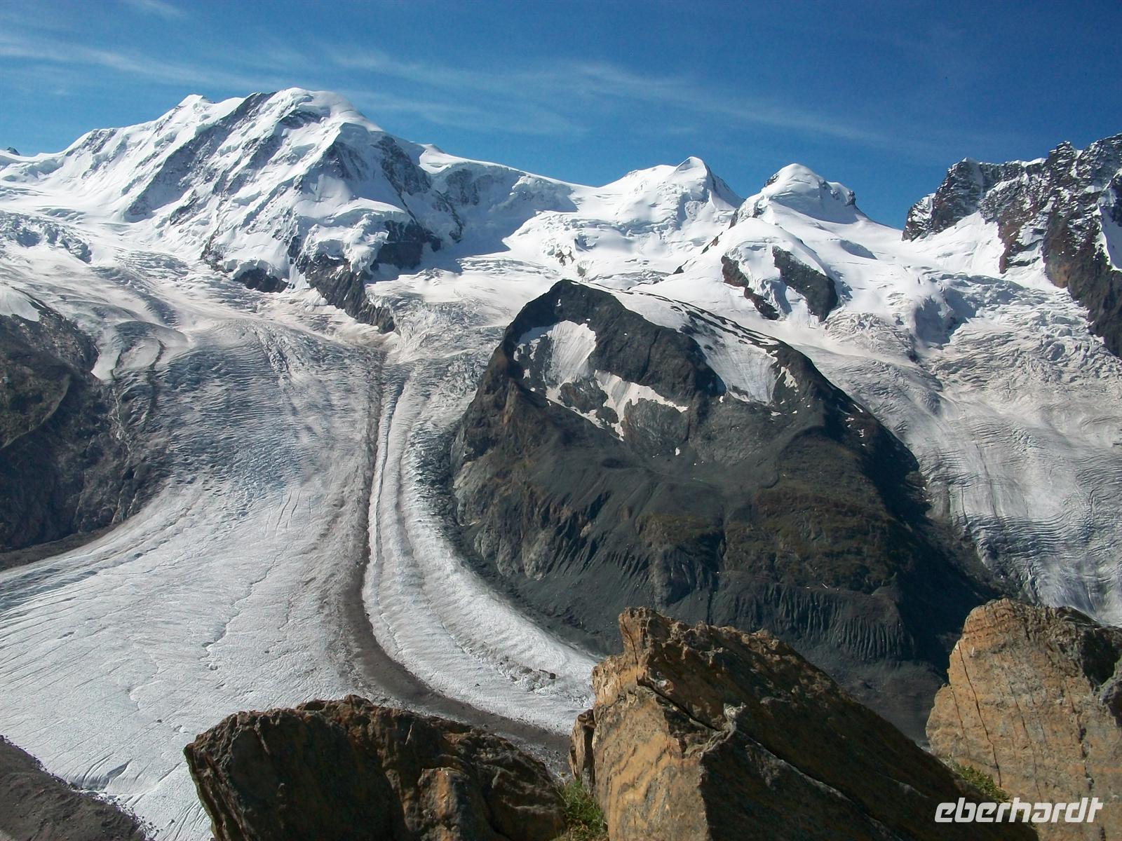 Vom Aussichtspunkt schweift der Blick hinauf zu den Spitzen der 4 000er, sie tragen das ewige Weiß und zu unseren Füßen gähnt der steile Abgrund mit seinem Gletscher. Über allem drehen die Bergdohlen ihre Kreise, wohlwissend dass manch ein Tourist Brot mit dabei hat. Vorsichtig nähern sich diese possierlichen Vögel und die Mutigsten holen sich das Futter direkt von der Hand. Hier