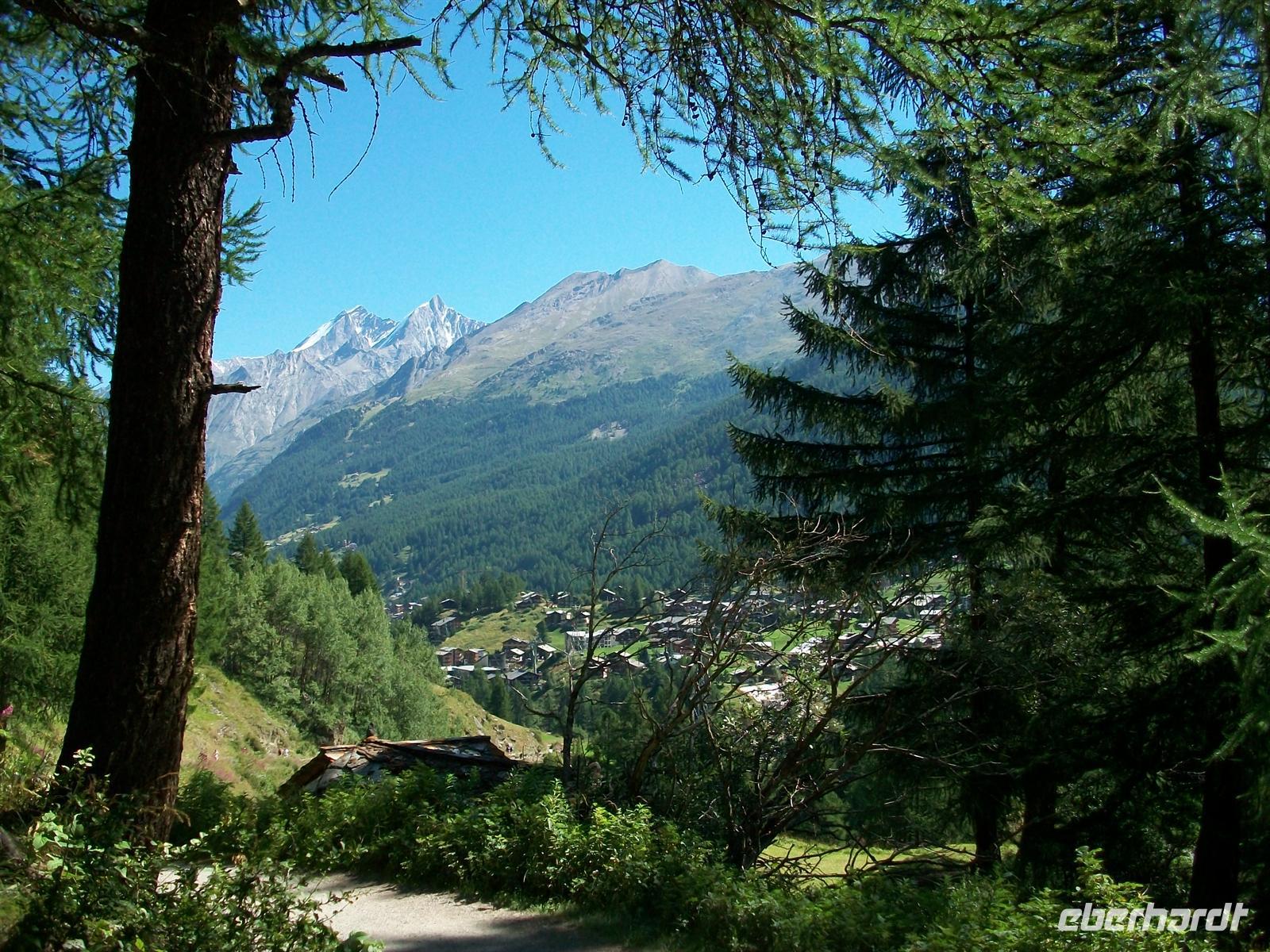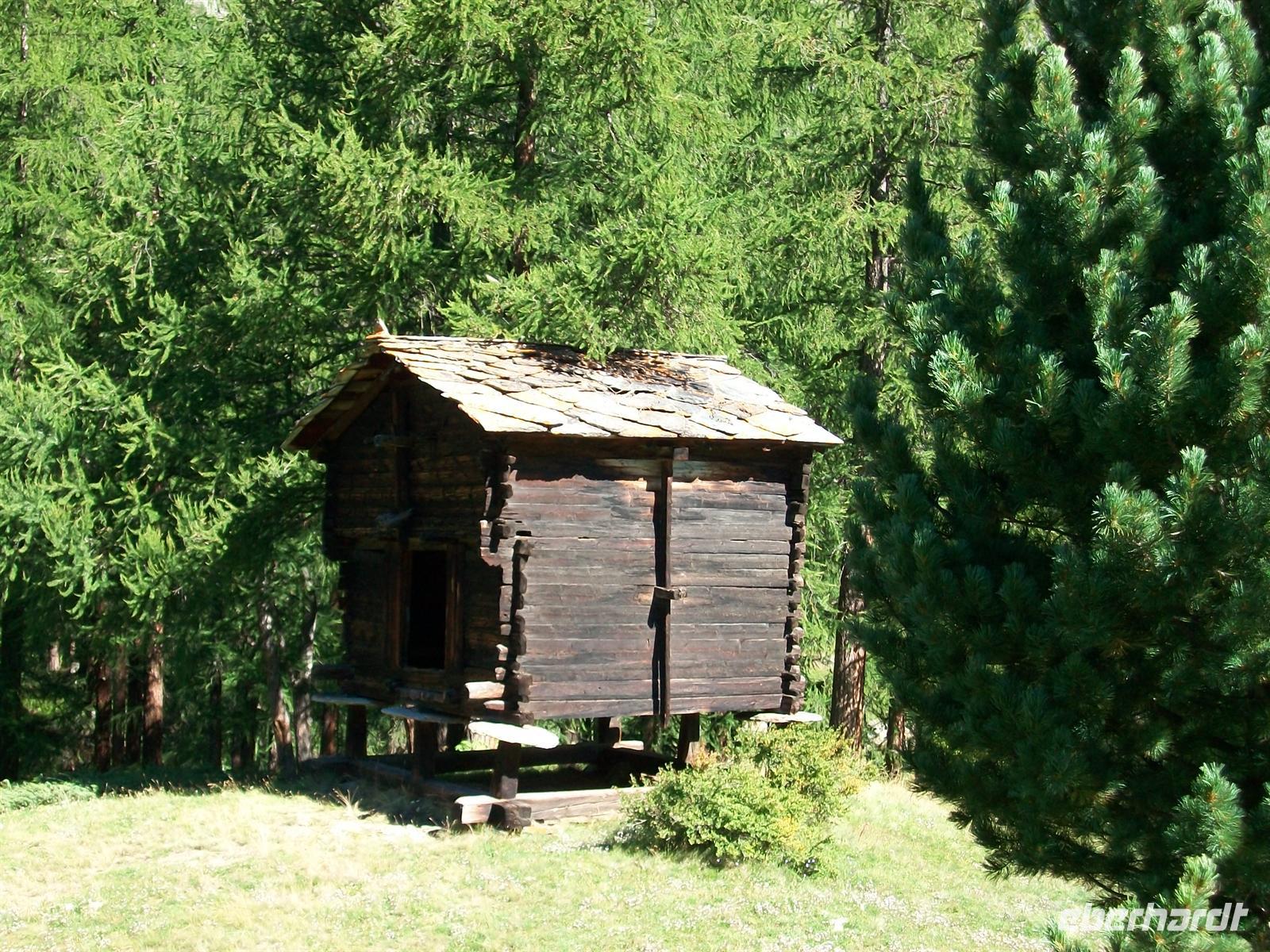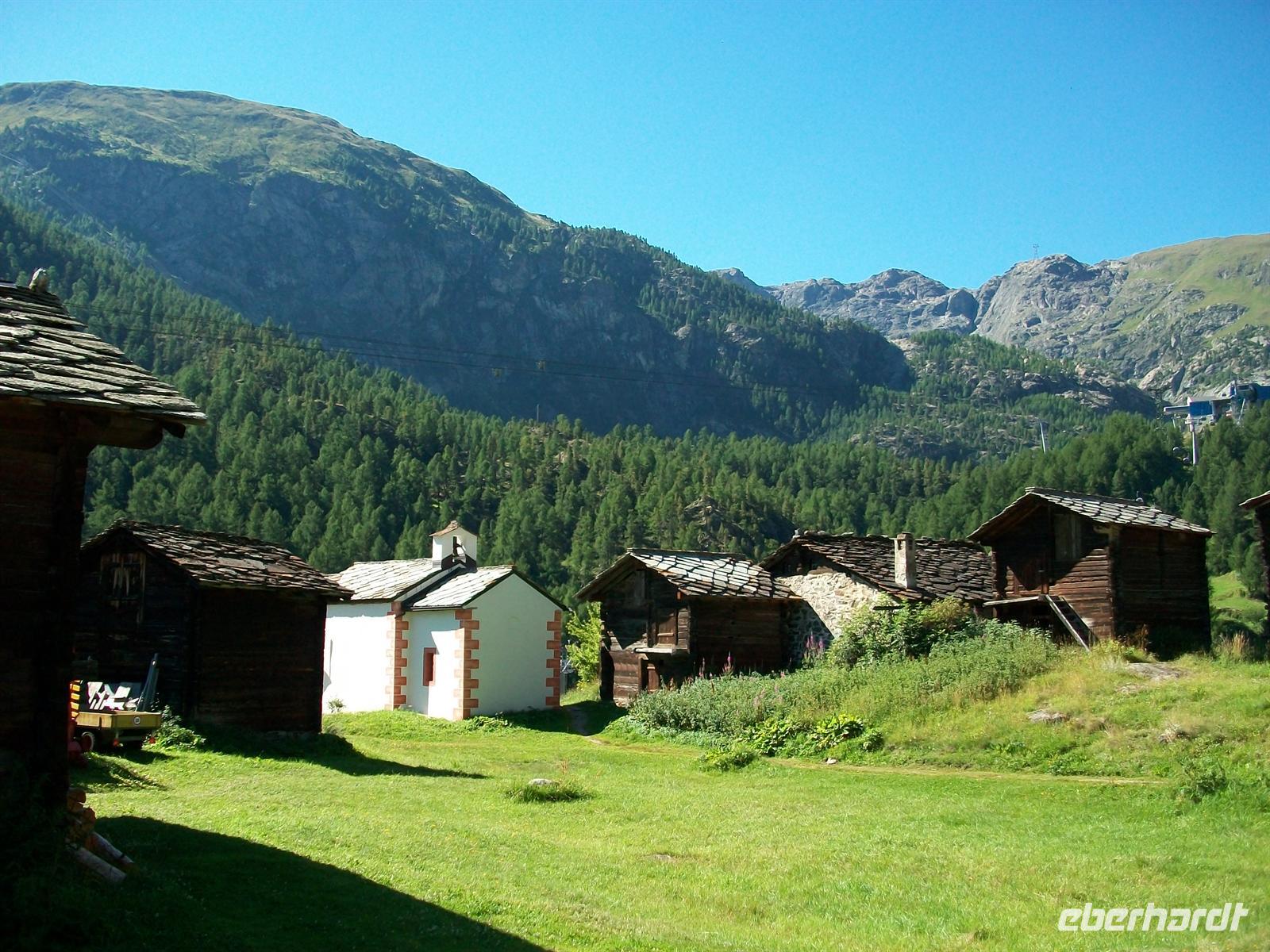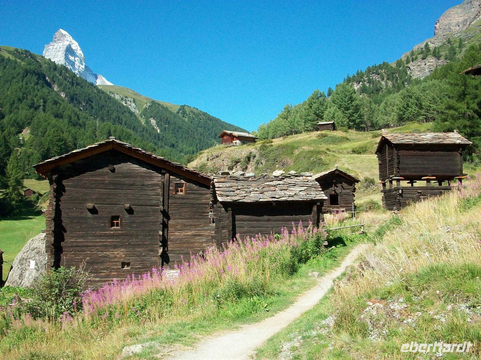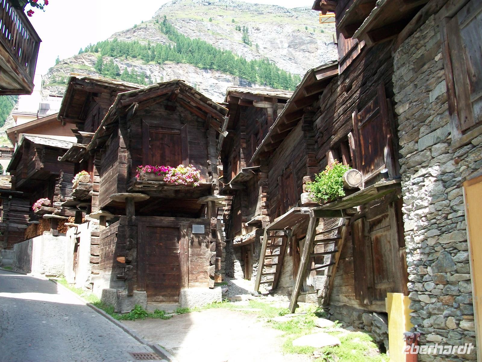 Es ist immer reizvoll diesen schönen Ort zu besuchen. Dabei spielt die Zeit keine Rolle da wir im Ort unser Hotel haben und uns die Zeit frei einteilen können. Gleich in der Nähe des Hotels überqueren wir das kleine Flüsschen Vispa und sind schon im ältesten Teil von Zermatt angekommen. Hier scheint die Zeit um Jahrhunderte zurückgedreht; die alten Walliser Häuser mit ihren wettergegerbten Fassaden aus Holz bringen uns in eine andere Lebenswirklichkeit. Damals, als es hier noch keinen Tourismus gab, ernährten sich die Menschen von Landwirtschaft und sie mussten für die rauen Bedingungen in den Bergen Vorsorge treffen. Auf Holzstützen stehen die Speicher und Stadel, geschützt mit Steinplatten um den Mäusen den Weg dorthin zu versperren. Etwas geheimnisvoll stehen die alten Häuser dicht gedrängt und dazwischen schlängeln sich schmale Pfade hindurch.
