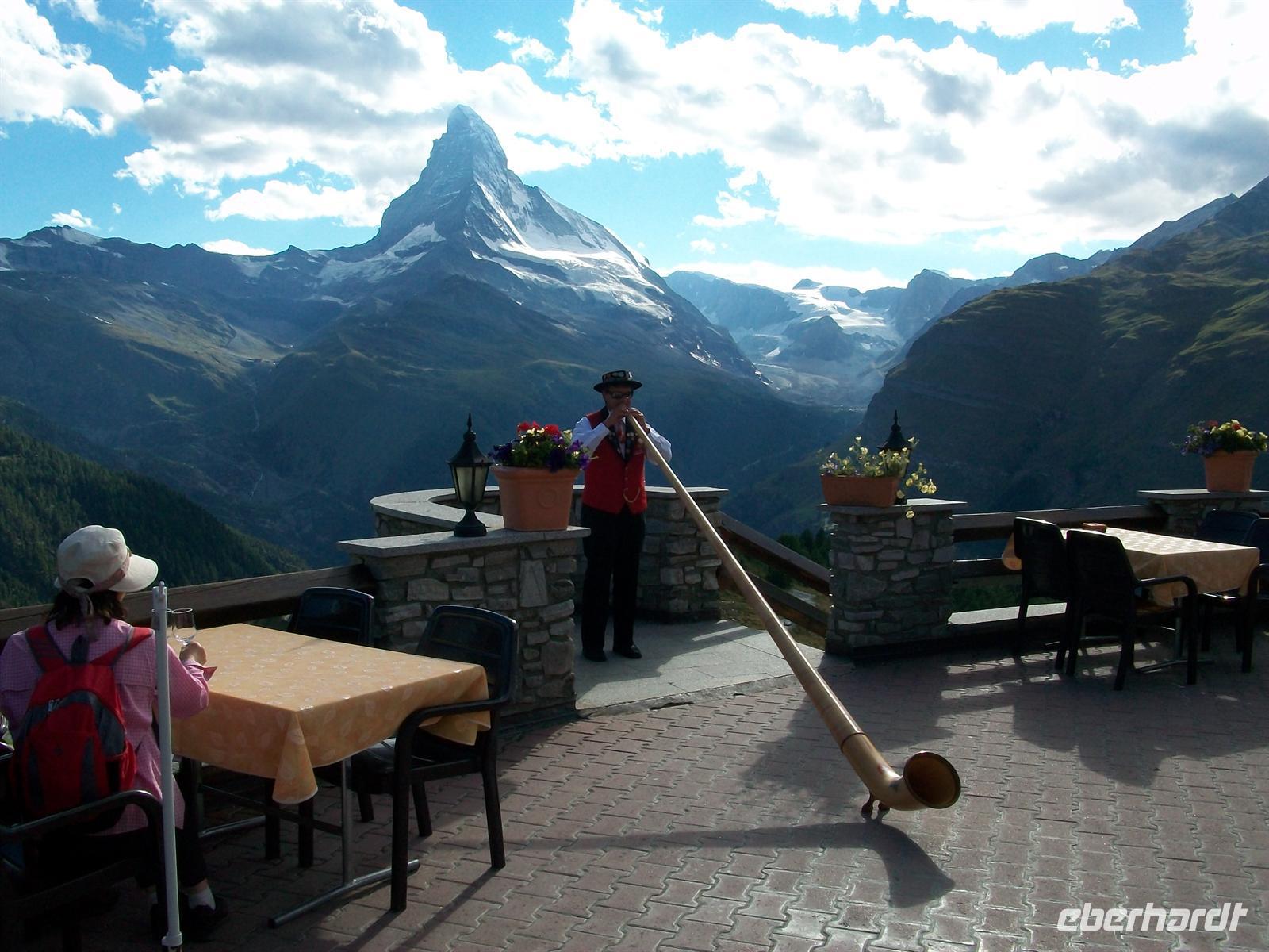 17.45 Uhr. Unsere Reisegruppe hat sich versammelt und gemeinsam gehen wir zur Talstation der unterirdischen Standseilbahn die uns hinauf zur Sunnega, der Sonnenterasse bringen wird. Erwartungsfroh sind die Gäste unserer Reisegruppe, schnell verläuft die Fahrt im Inneren des Berges nach etwa sieben Minuten sind wir oben angelangt. Schon beim Aussteigen hören wir die Klänge eines Alphornspielers. Beim Hinaustreten auf die Terrasse öffnet sich die schöne Naturkulisse, im Mittelpunkt steht das Matterhorn das heute einige Wolken gefangen hat. Jeder sucht sich ein Plätzchen und lauscht den etwas wehmütigen Klängen die doch so typisch sind für die Schweizer Berge. Dabei schweift der Blick zu den schneebedeckten 4 000ern, hinunter ins Tal und die Klänge entführen uns in eine längst vergangene Zeit.