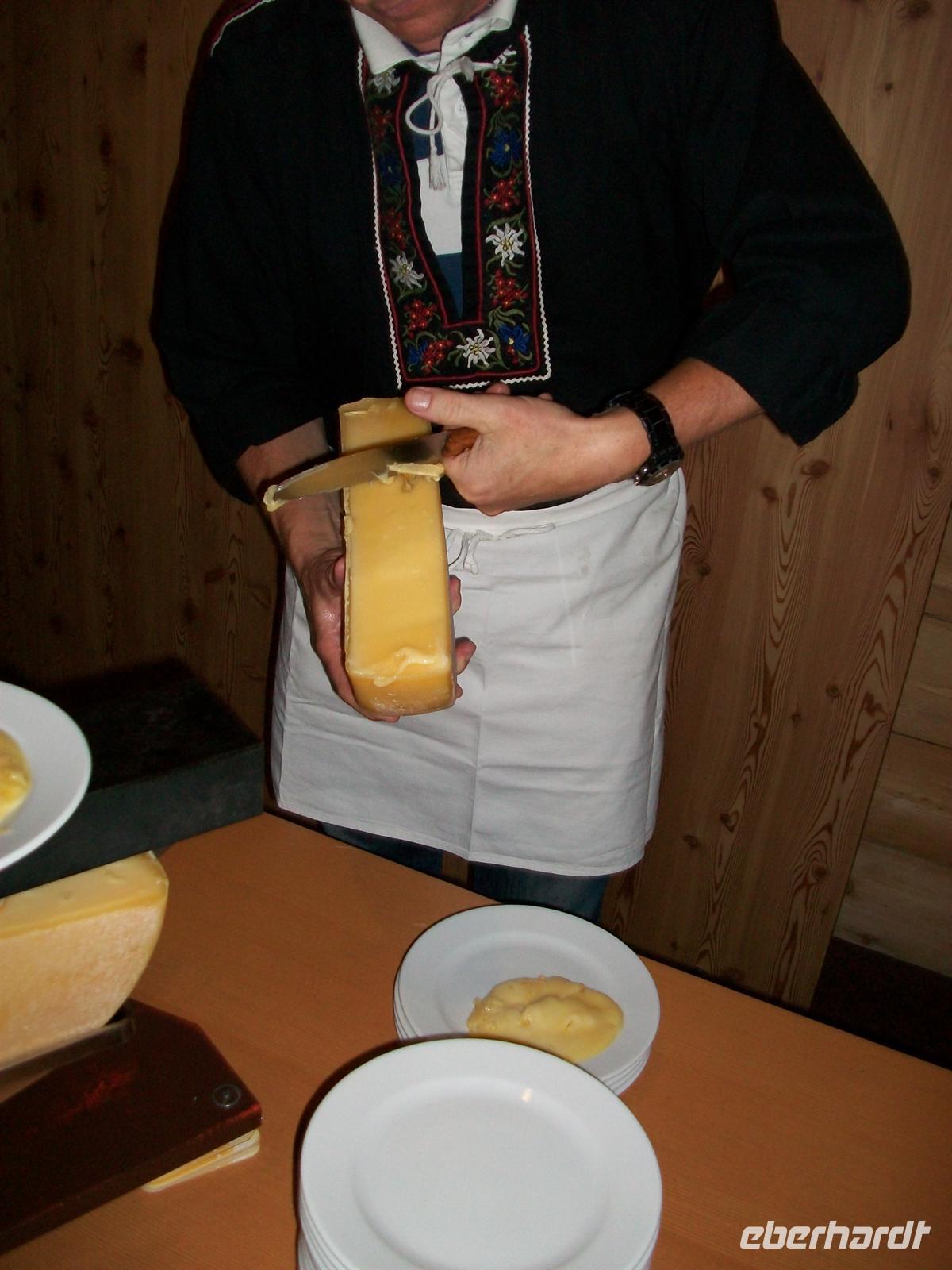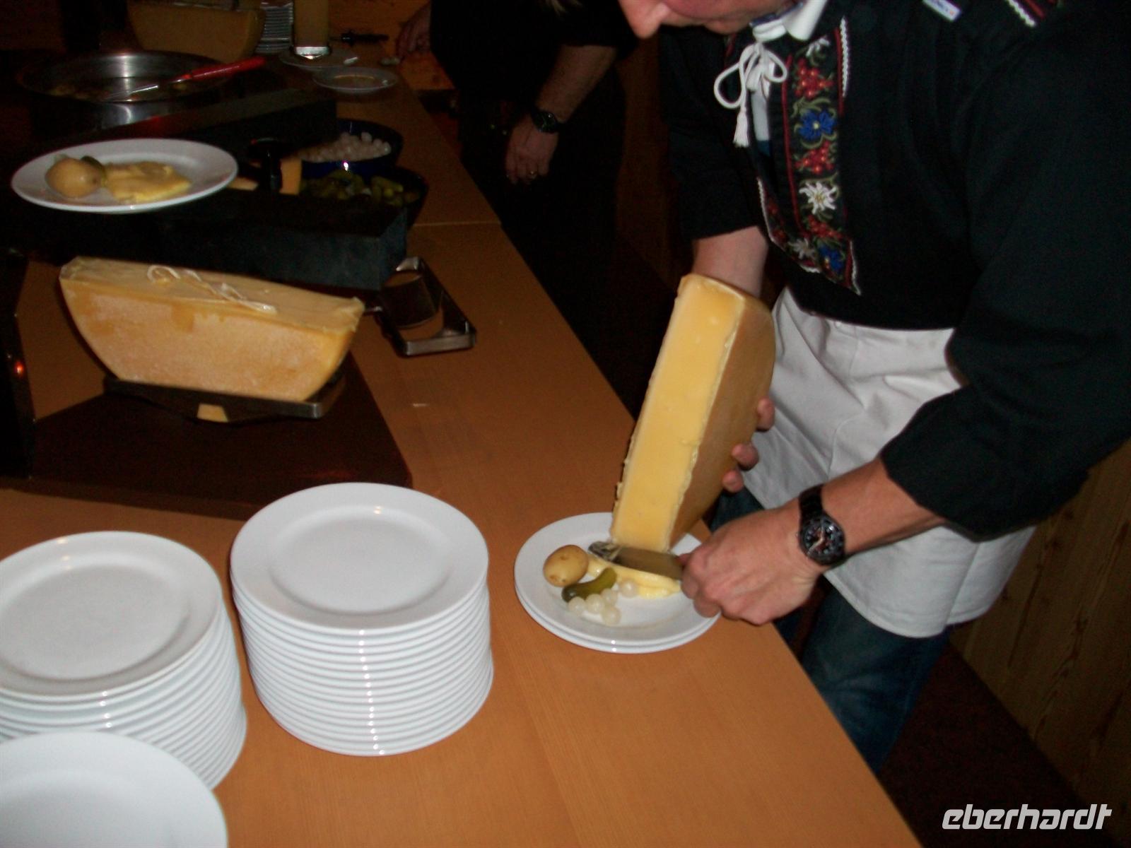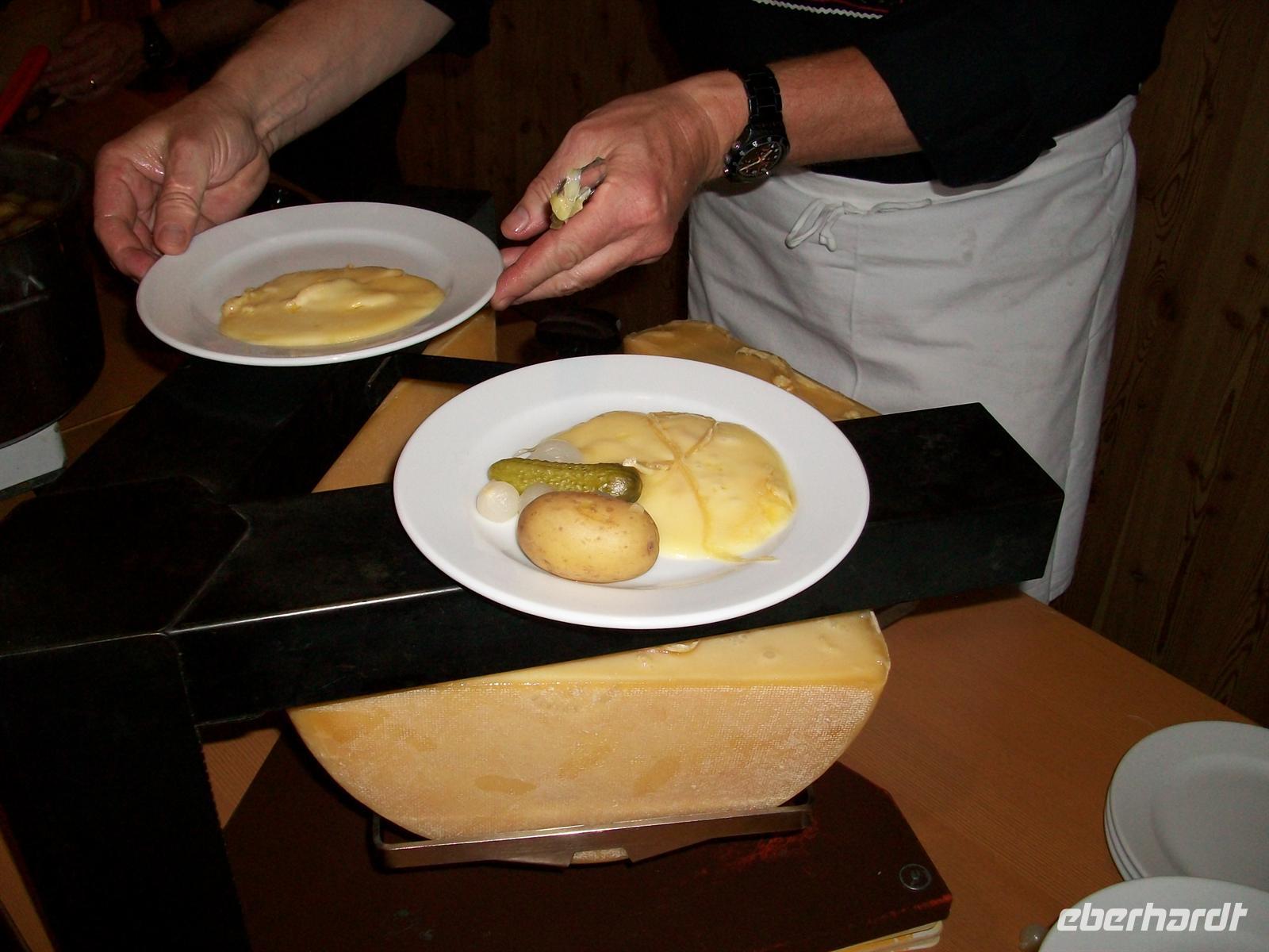 Nach dem Vorspeisenteller mit Schinken, Speck und Walliser Trockenfleisch kommt der Hauptgang an die Reihe- Raclette. Dazu wird würziger Käse geschmolzen, dessen Duft bald den ganzen Raum