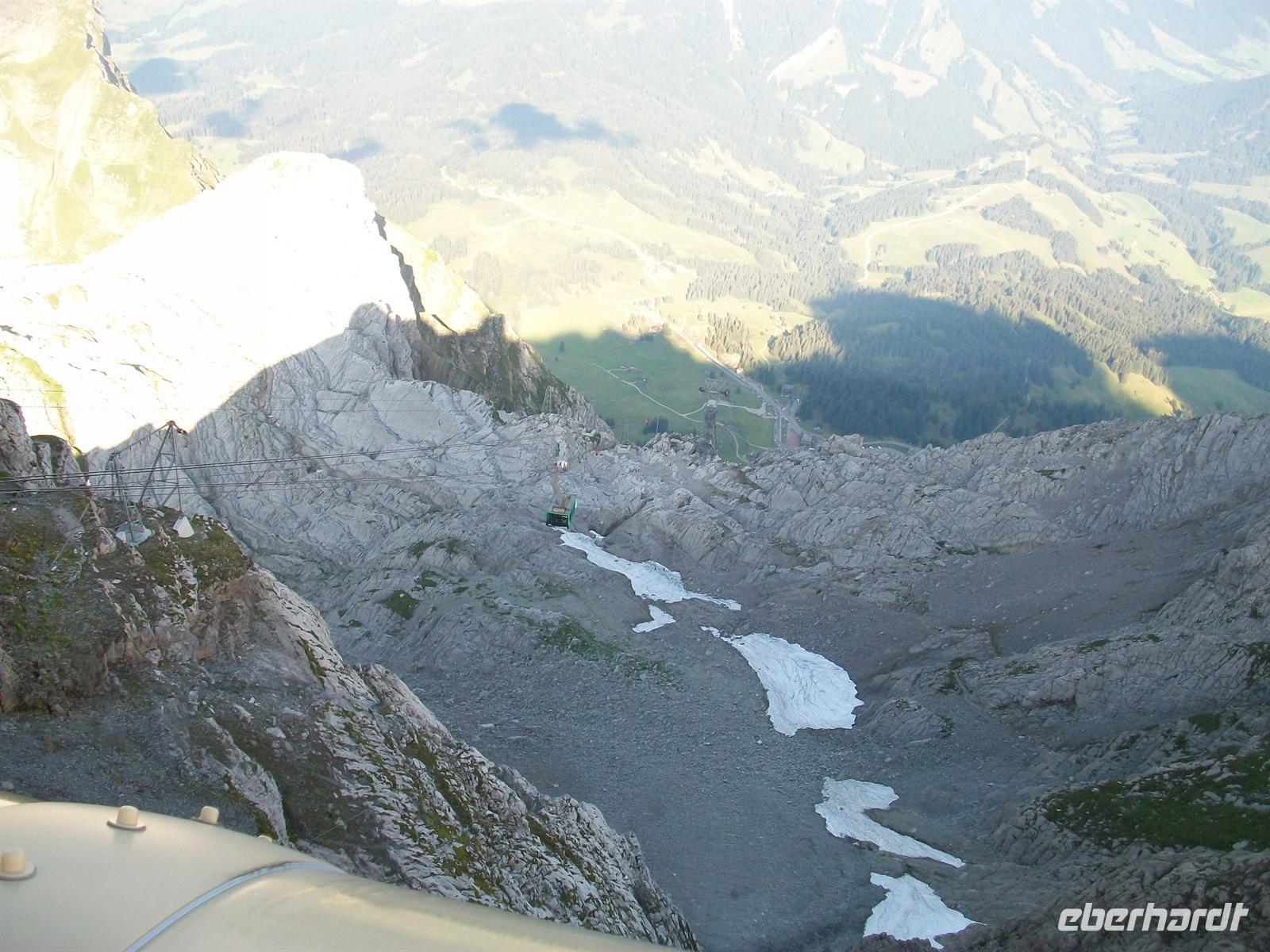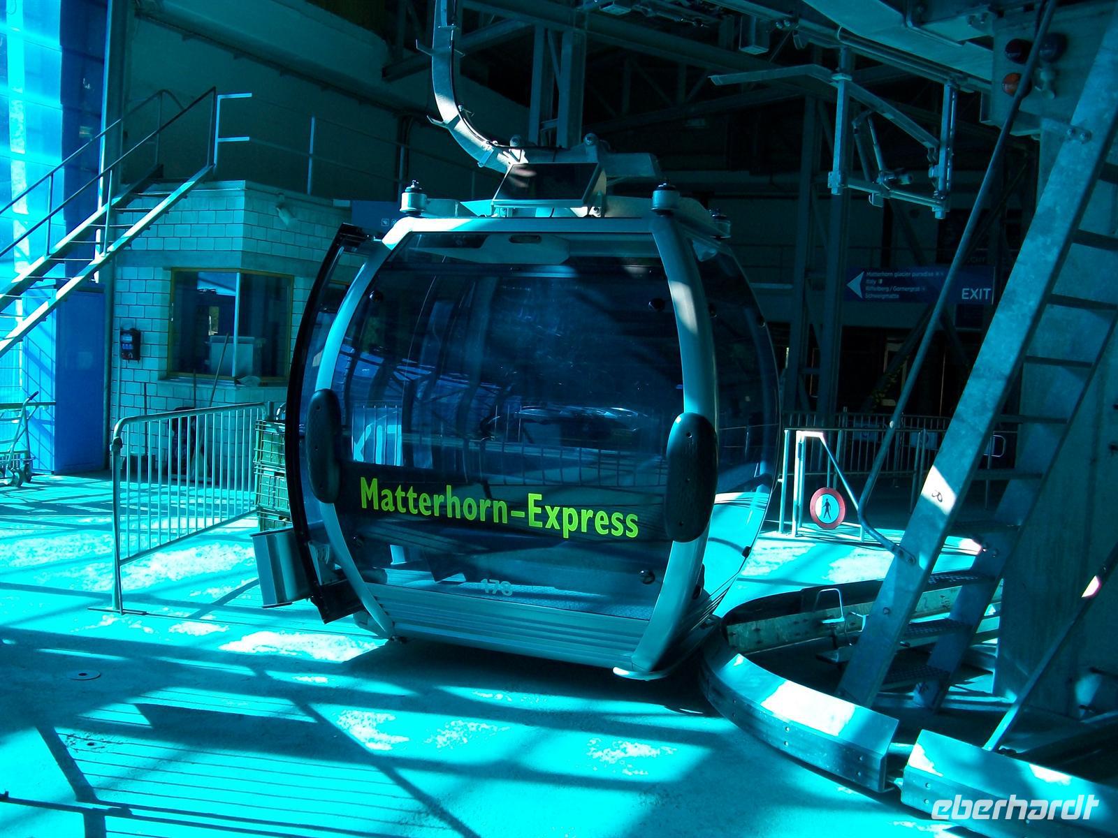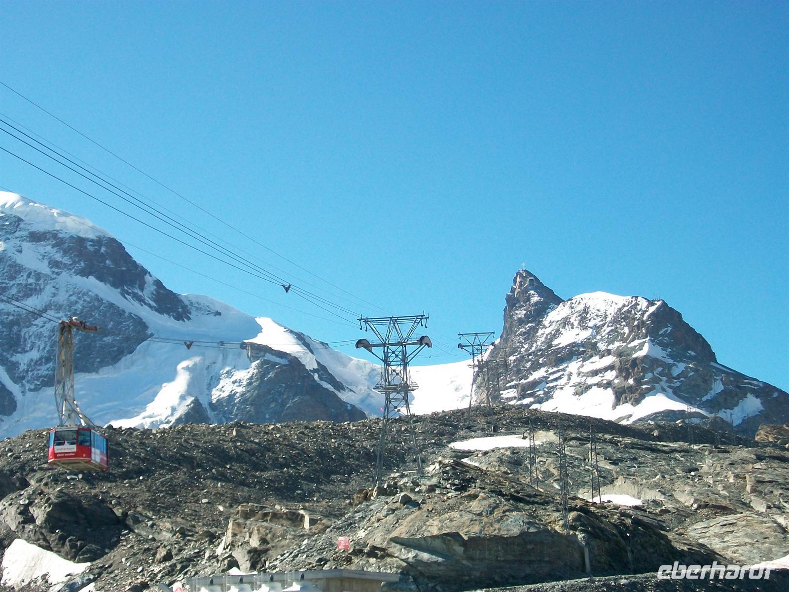Zu unserem fakultativen Ausflug hat sich ein kleines Grüppchen gefunden, kurz nach neun sieht uns die Morgensonne schon auf dem Weg zur Talstation der Luftseilbahn die uns hinauf zum Klein- Matterhorn bringen wird. Bald sind die Tickets geholt und wir haben in der kleinen Kabine platzgenommen. Leicht surrend zieht uns das Seil nach oben, schon hier haben wir einen wunderschönen Blick auf das Land und auf das Matterhorn welches vollkommen ohne Wolken mit weißen Schneeresten versehen ist und vom blauen Himmel umrahmt wird.
