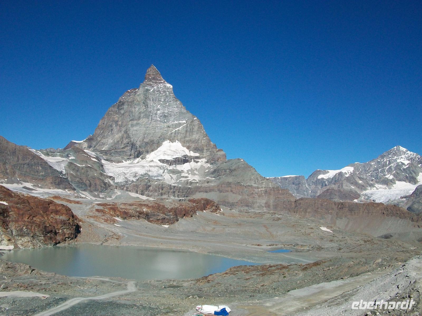 9.8.2012. Das Matterhorn erstrahlt in der Morgensonne, der leichte Schneebelag an den Flanken dieses faszinierenden Berges bildet einen glitzernden Kontrast zum tiefblauen Himmel der das Tal überspannt. Es ist das richtige Wetter um in die Berge zu gehen.