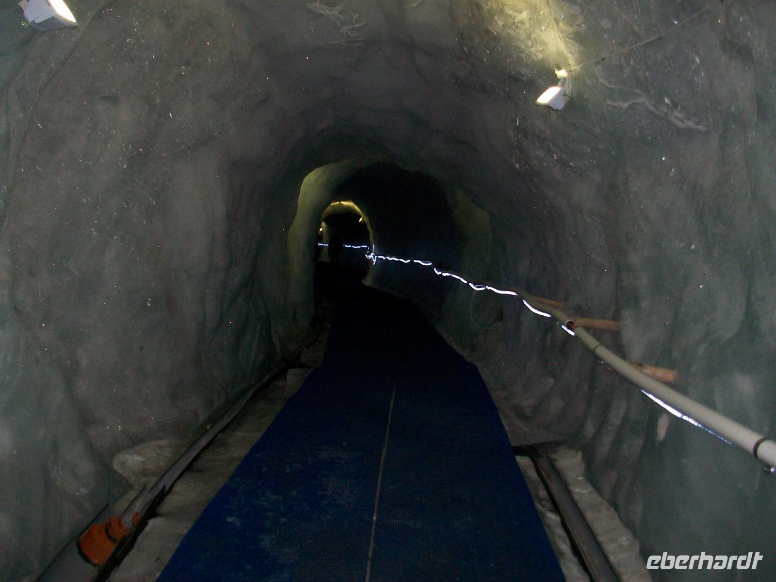 Zweimal müssen wir umsteigen, die letzte Etappe wird mit einer größeren Kabinenbahn bewältigt die dann auf etwa 3 900 Metern endet. Hier oben heißt es nun langsam gehen, der Luftmangel ist zu spüren. Durch einen langen Gang der unter dem Klein- Matterhorn hindurchführt, öffnet sich bald der Blick auf das ewige Eis. Greller Sonnenschein liegt auf dem Land, es glitzert und gleißt,