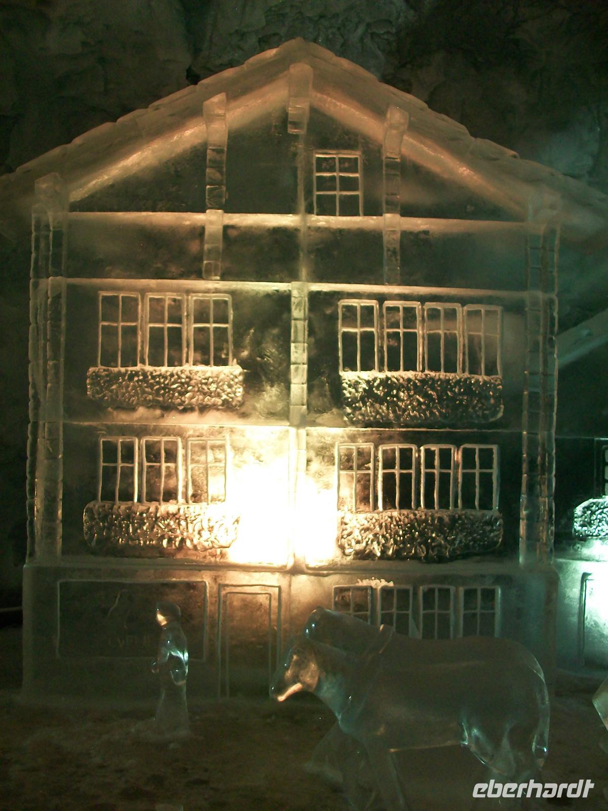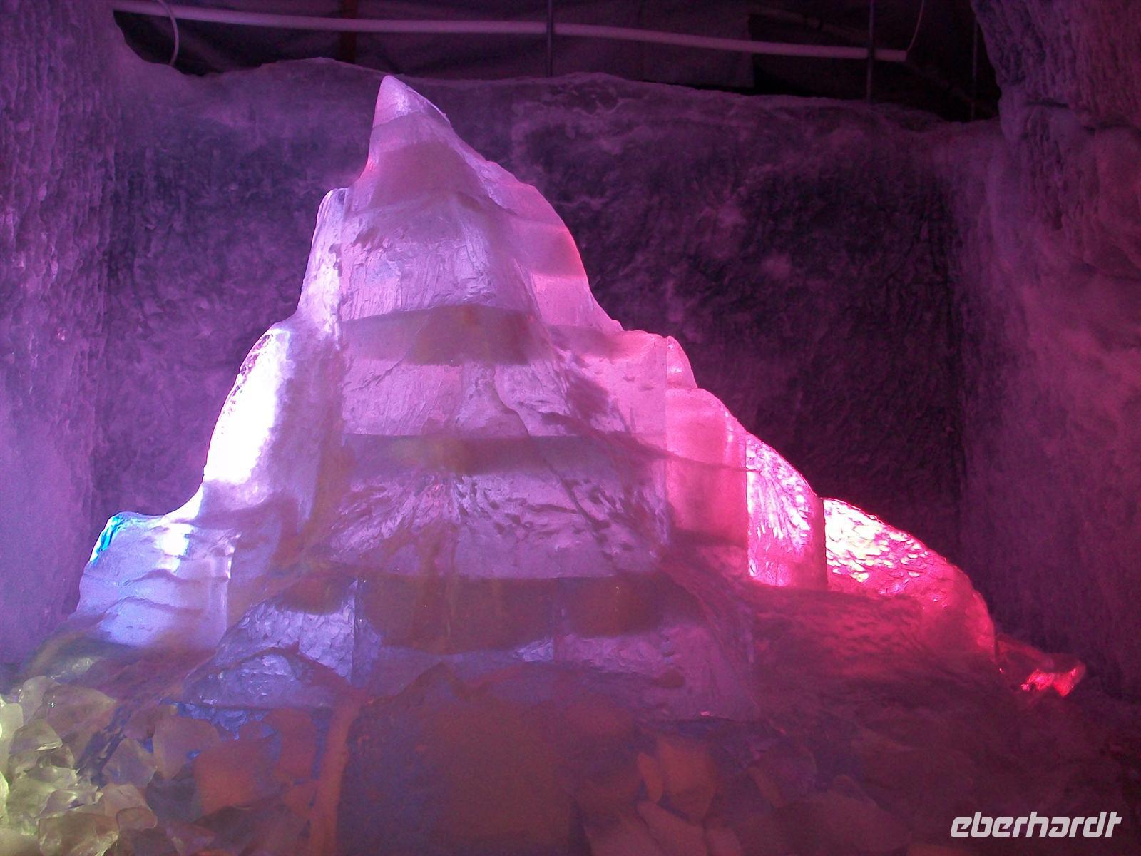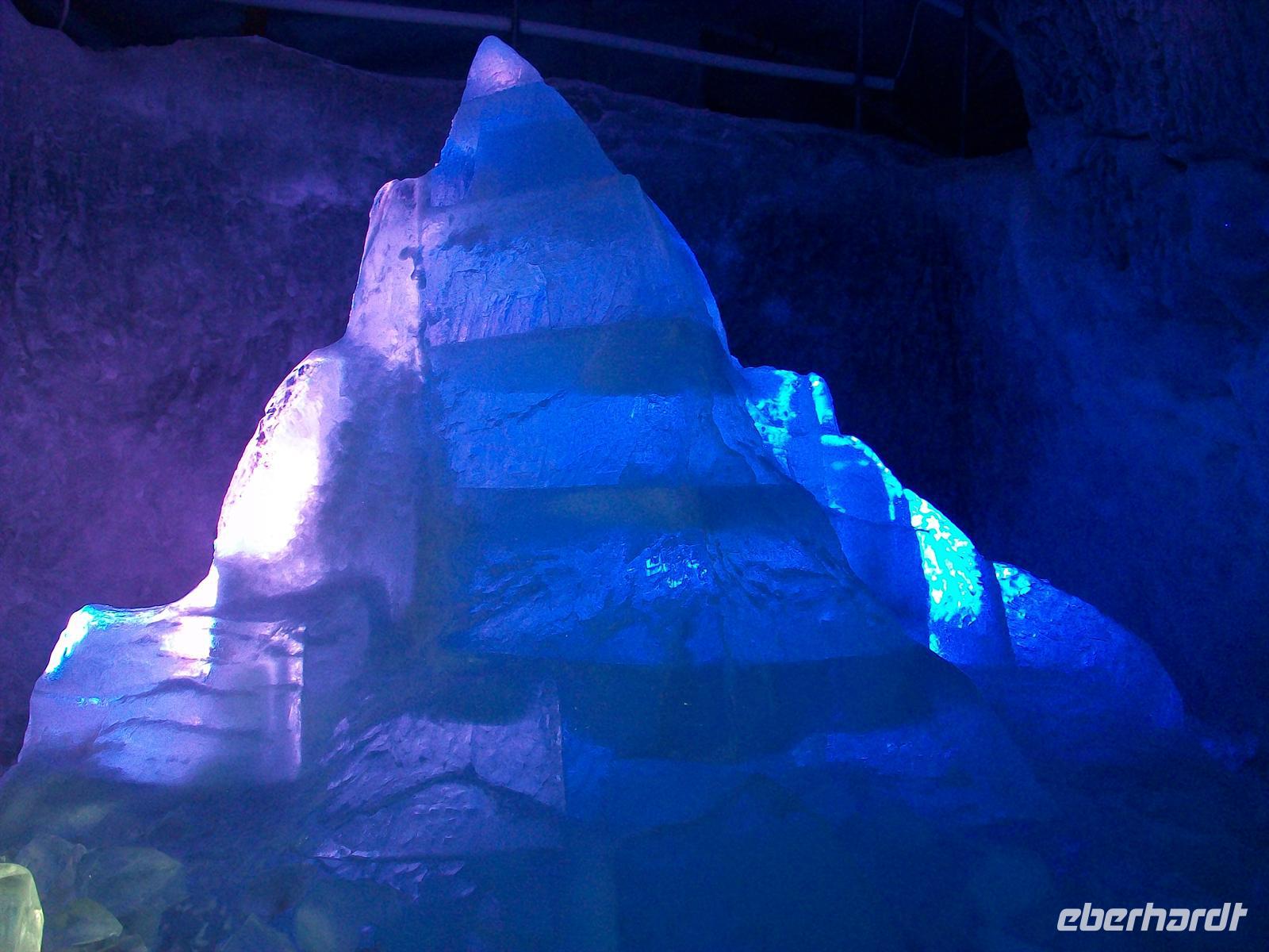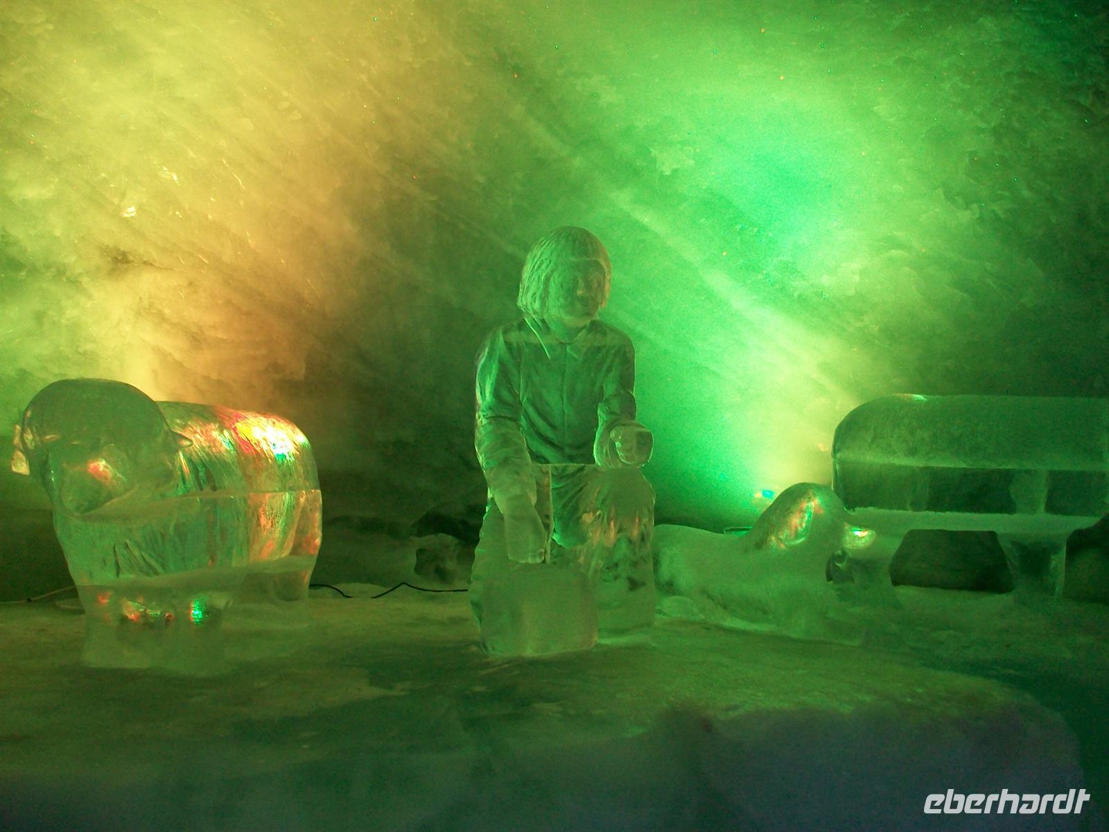 Nach dem Öffnen der Tür schlägt mir ein kalter Lufthauch entgegen, durch einen langen, von Menschenhand ins ewige Eis geschlagenen Gang gelange ich in die Grotte. Mit viel Phantasie, geschickten Händen und einer interessanten und wechselnden Beleuchtung sind hier unten zahlreiche Skulpturen in das Eis geschlagen, erstaunt steht der Betrachter vor diesen schönen Werken.