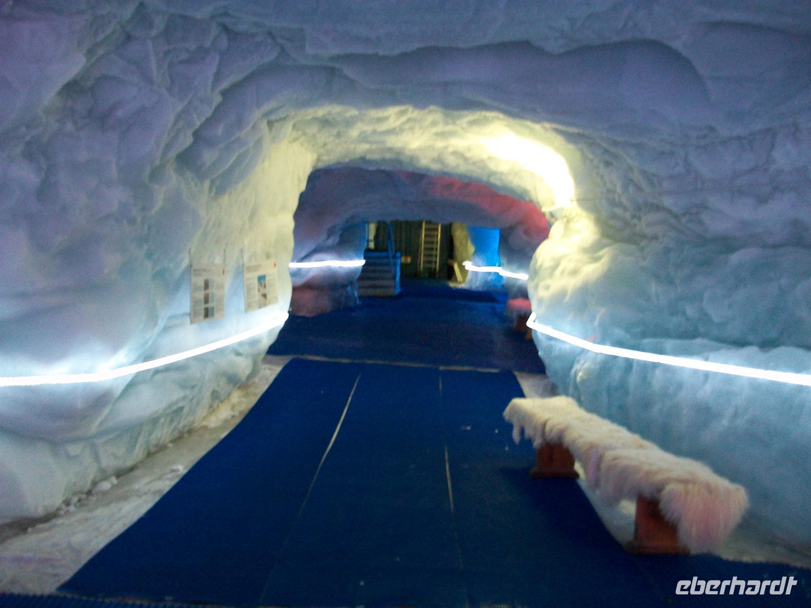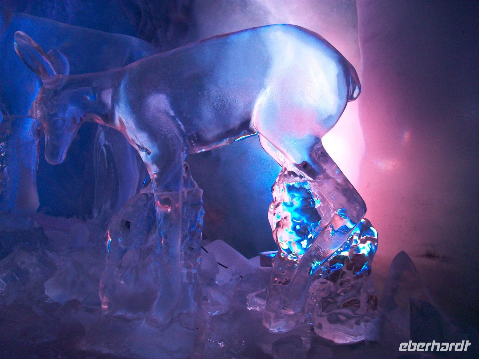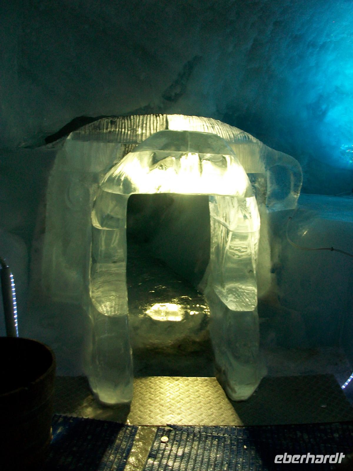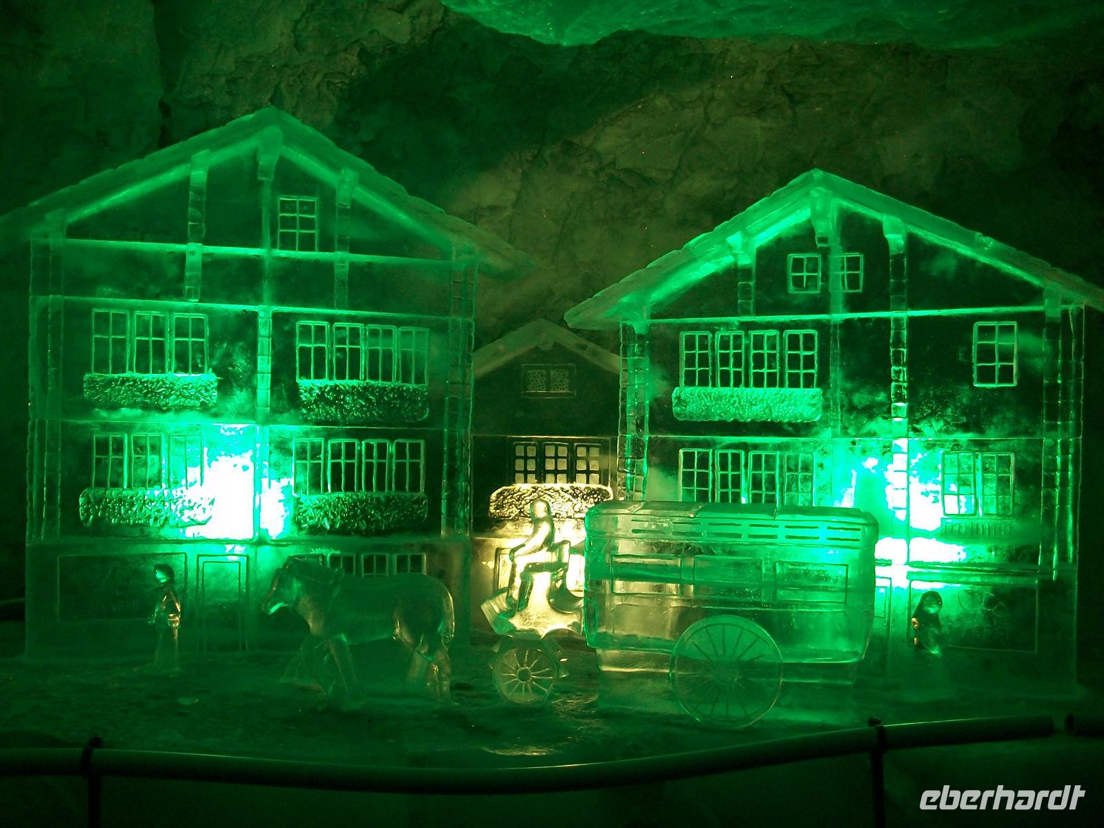 Nach dem Öffnen der Tür schlägt mir ein kalter Lufthauch entgegen, durch einen langen, von Menschenhand ins ewige Eis geschlagenen Gang gelange ich in die Grotte. Mit viel Phantasie, geschickten Händen und einer interessanten und wechselnden Beleuchtung sind hier unten zahlreiche Skulpturen in das Eis geschlagen, erstaunt steht der Betrachter vor diesen schönen Werken.
