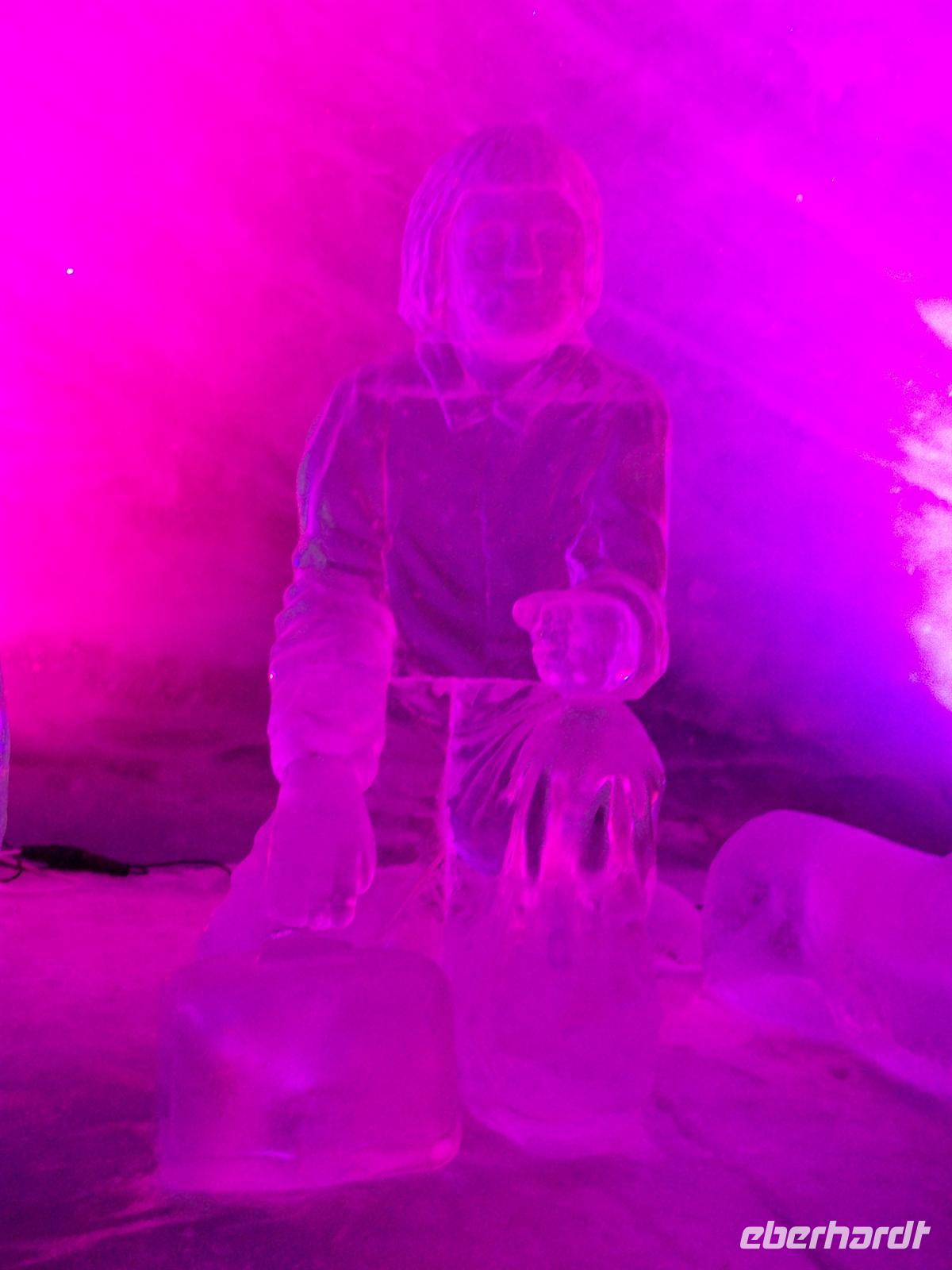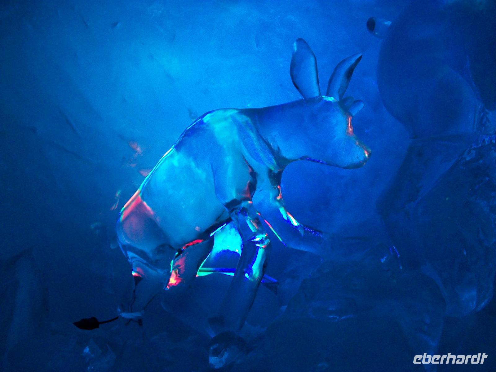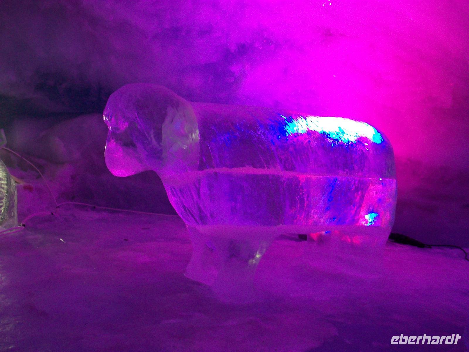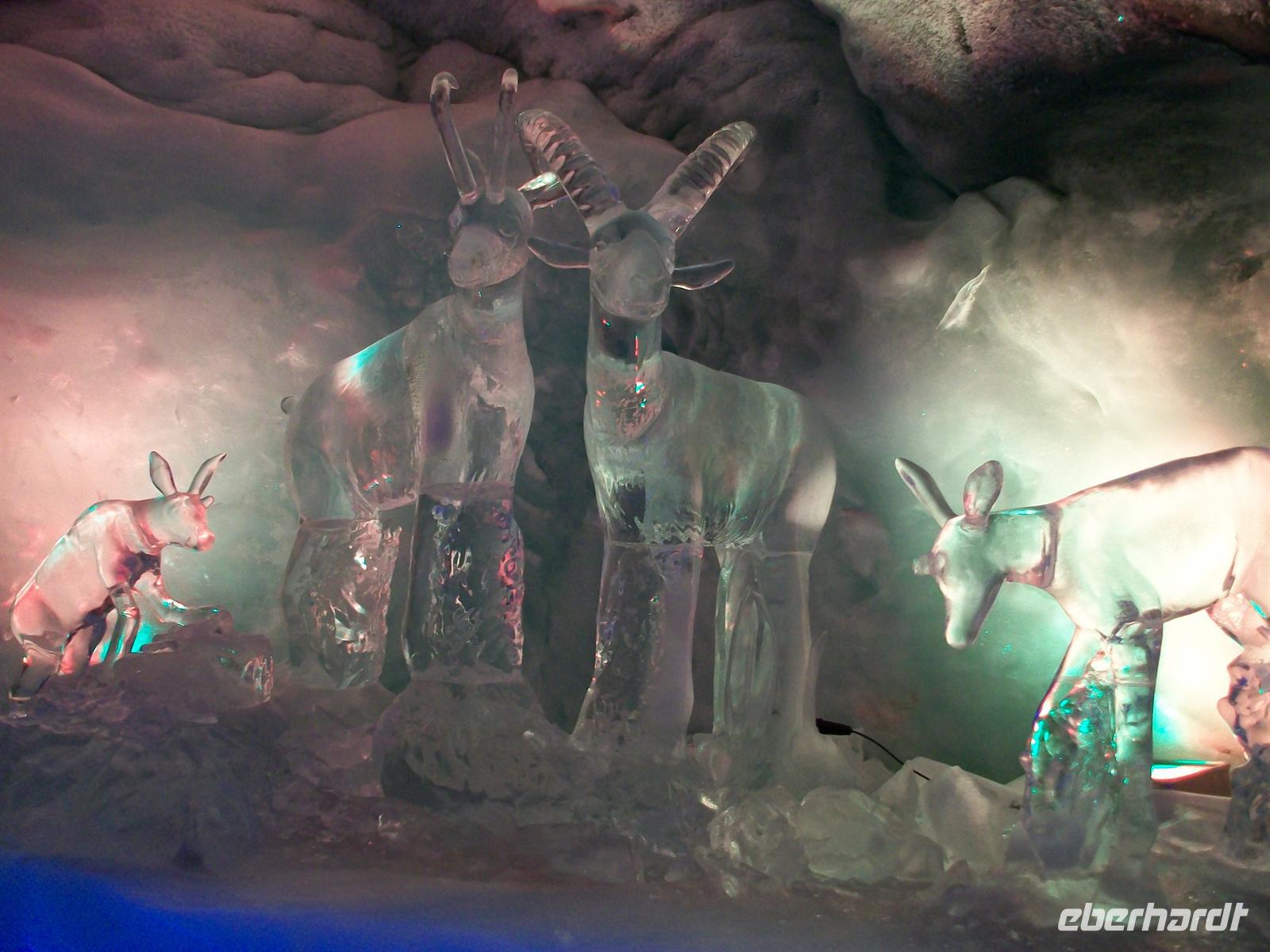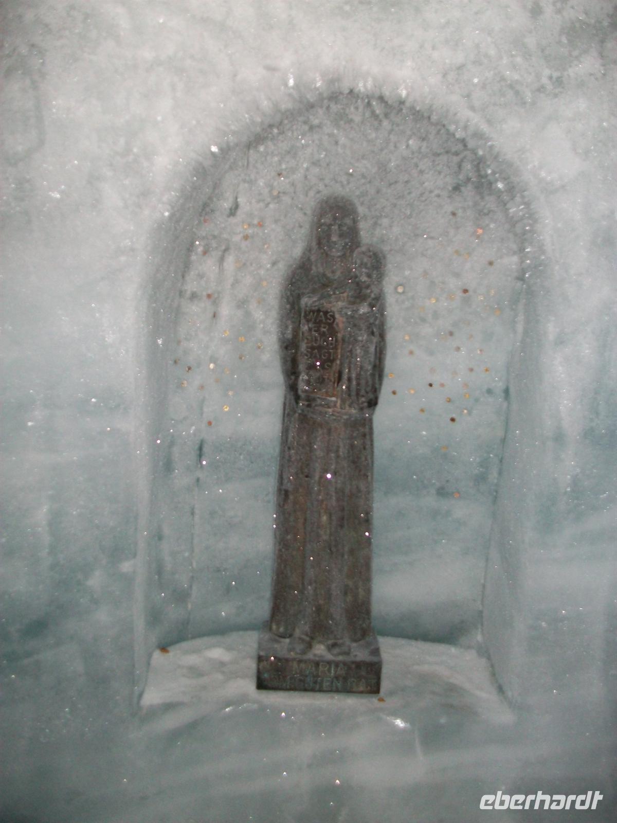 Nach dem Öffnen der Tür schlägt mir ein kalter Lufthauch entgegen, durch einen langen, von Menschenhand ins ewige Eis geschlagenen Gang gelange ich in die Grotte. Mit viel Phantasie, geschickten Händen und einer interessanten und wechselnden Beleuchtung sind hier unten zahlreiche Skulpturen in das Eis geschlagen, erstaunt steht der Betrachter vor diesen schönen Werken.