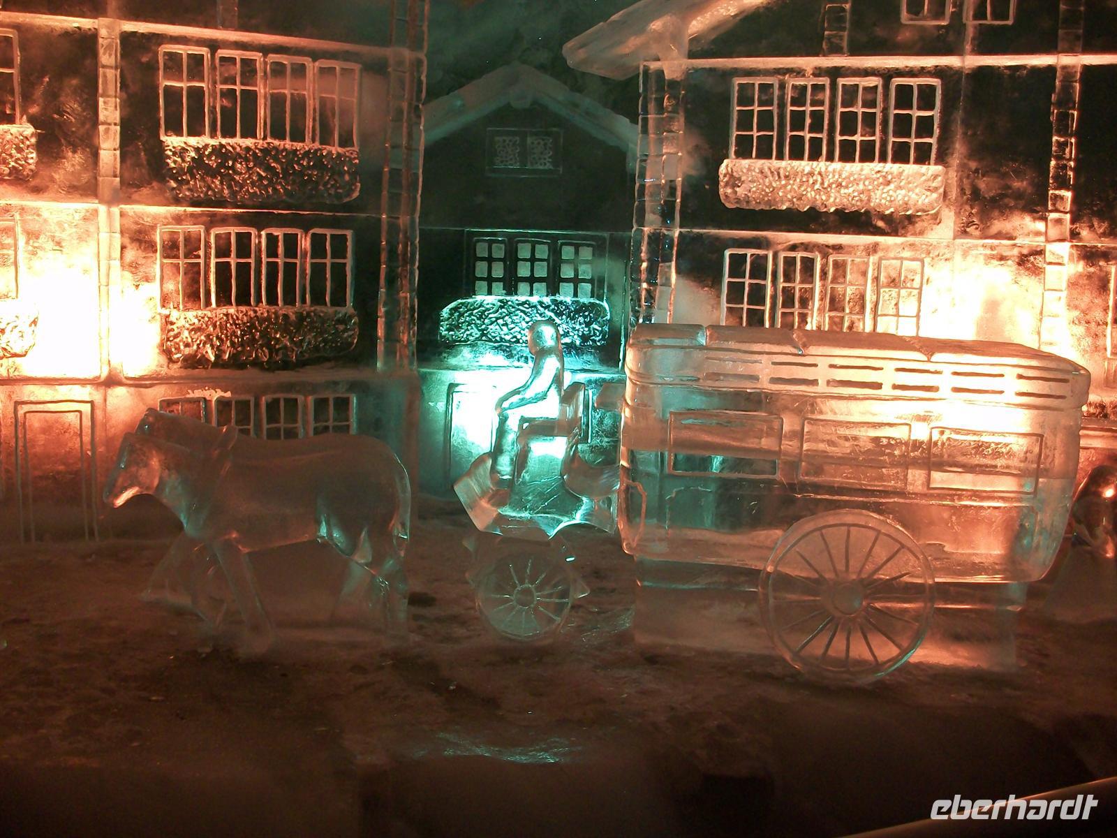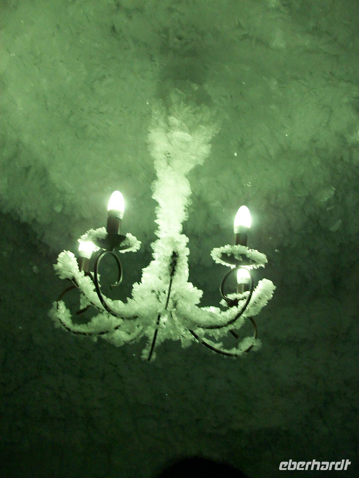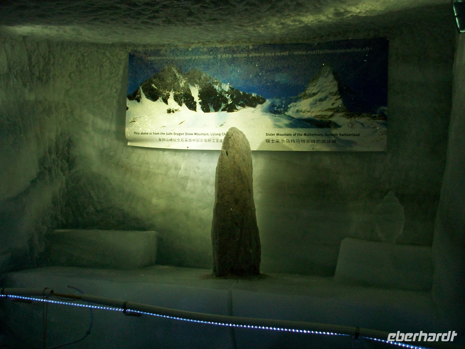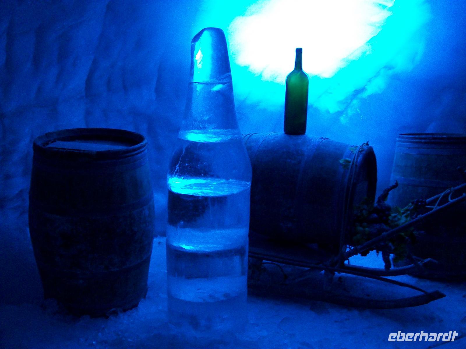 Nach dem Öffnen der Tür schlägt mir ein kalter Lufthauch entgegen, durch einen langen, von Menschenhand ins ewige Eis geschlagenen Gang gelange ich in die Grotte. Mit viel Phantasie, geschickten Händen und einer interessanten und wechselnden Beleuchtung sind hier unten zahlreiche Skulpturen in das Eis geschlagen, erstaunt steht der Betrachter vor diesen schönen Werken.