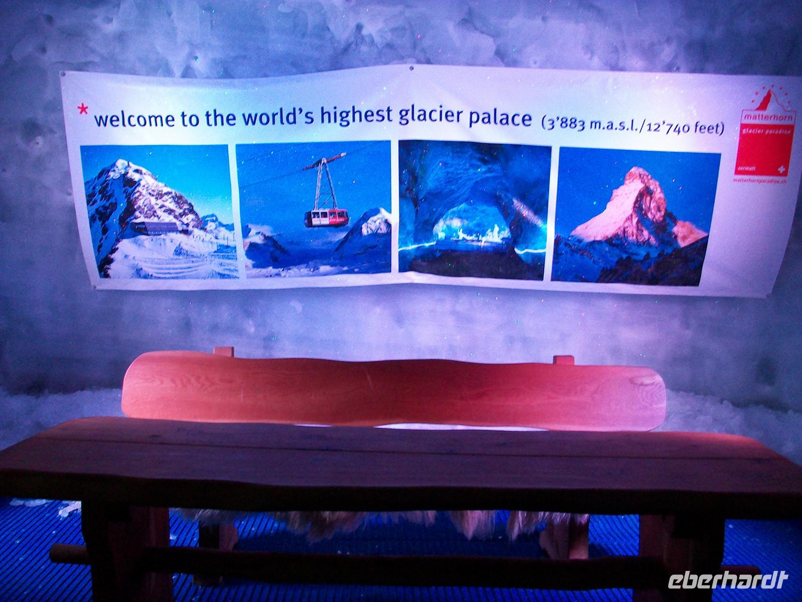 Nach einer kleinen Wanderung auf dem glitzernden Schnee schaue ich noch in den Gletscherpalast hinein, um zu ihm zu gelangen fahre ich mit dem Lift ein Stockwerk hinunter.