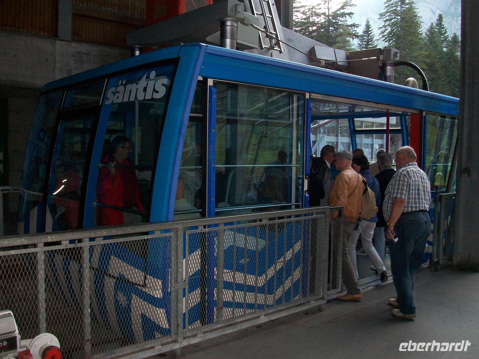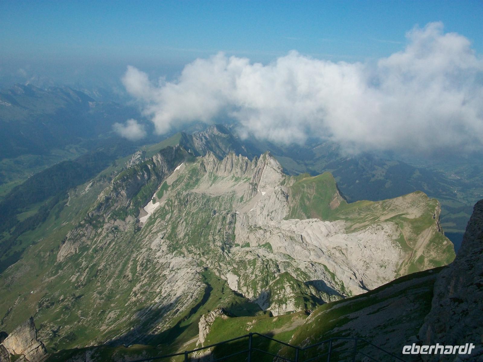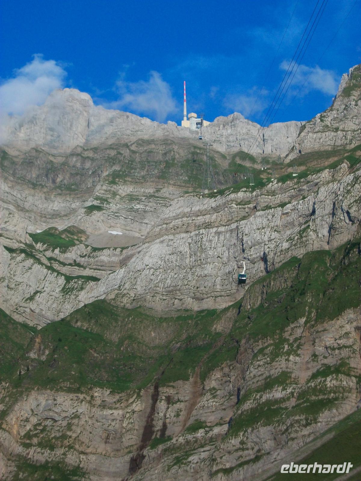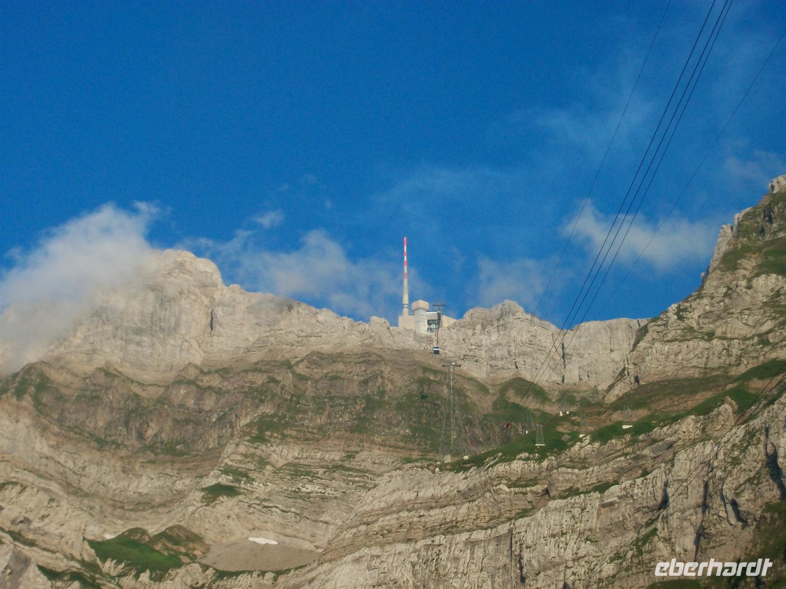 13.8.2012. Es ist 7.00 Uhr und mein Bick geht hinauf zur Säntisspitze, auch wenn dort oben einige Wolken zu sehen sind der Blick ist frei. Schon eine halbe Stunde später hat sich unsere Reisegesellschaft in der Kabine der Säntisbahn versammelt und wartet gespannt auf die Auffahrt. Dann geht es los, schnell werden die Häuser der Schwägalp kleiner und die Felswand kommt immer näher. Das ist immer wieder beeindruckend, auch der Panoramablick oben auf dem Berg. Das Frühstücksbuffet ist schon aufgebaut und bei dieser reichhaltigen Mahlzeit schweift der Blick immer wieder hinaus auf eine grandiose Bergwelt. Es ist noch einmal ein ganz großer Höhepunkt zum Abschluss einer schönen Reise; nach dem Frühstück verbleibt unseren Gästen noch Zeit die verschiedenen Aussichtspunkte zu besuchen die dem Betrachter immer neue Perspektiven eröffnen und diesen Vormittag mit Blicken weit hinaus ins schöne Land beschließen.