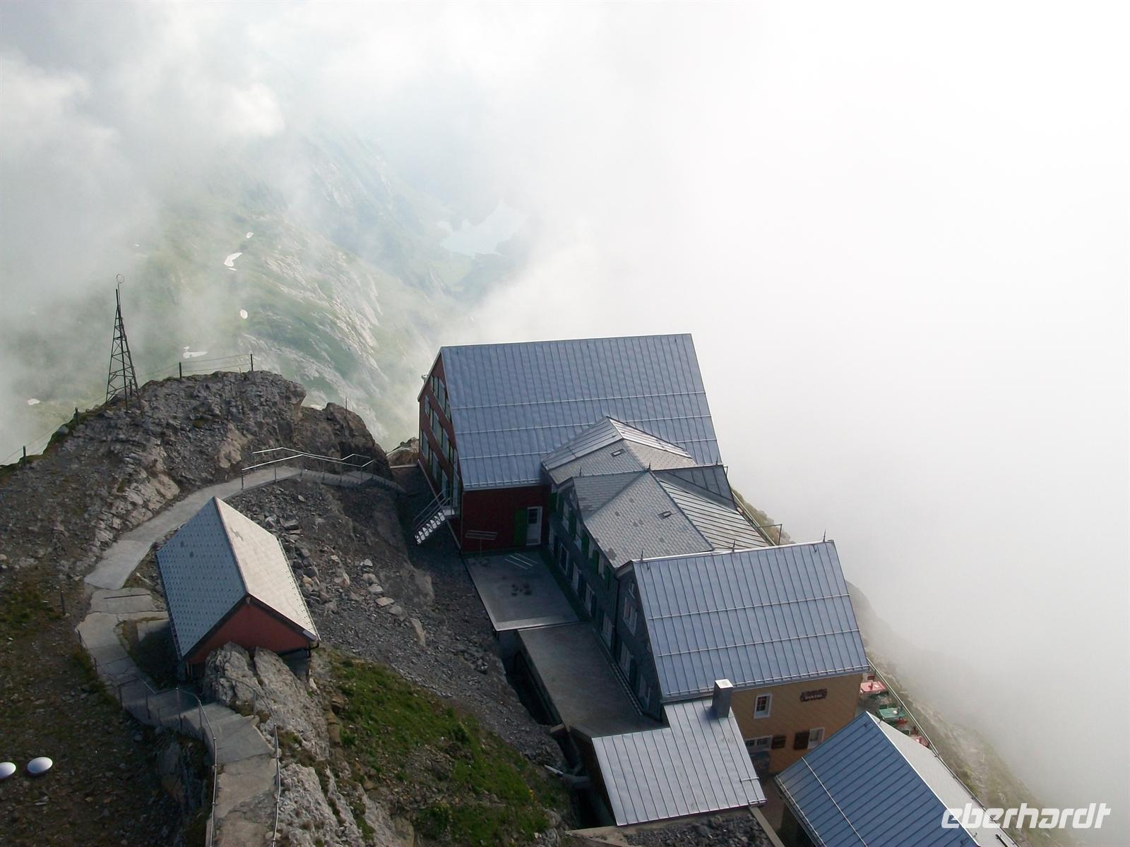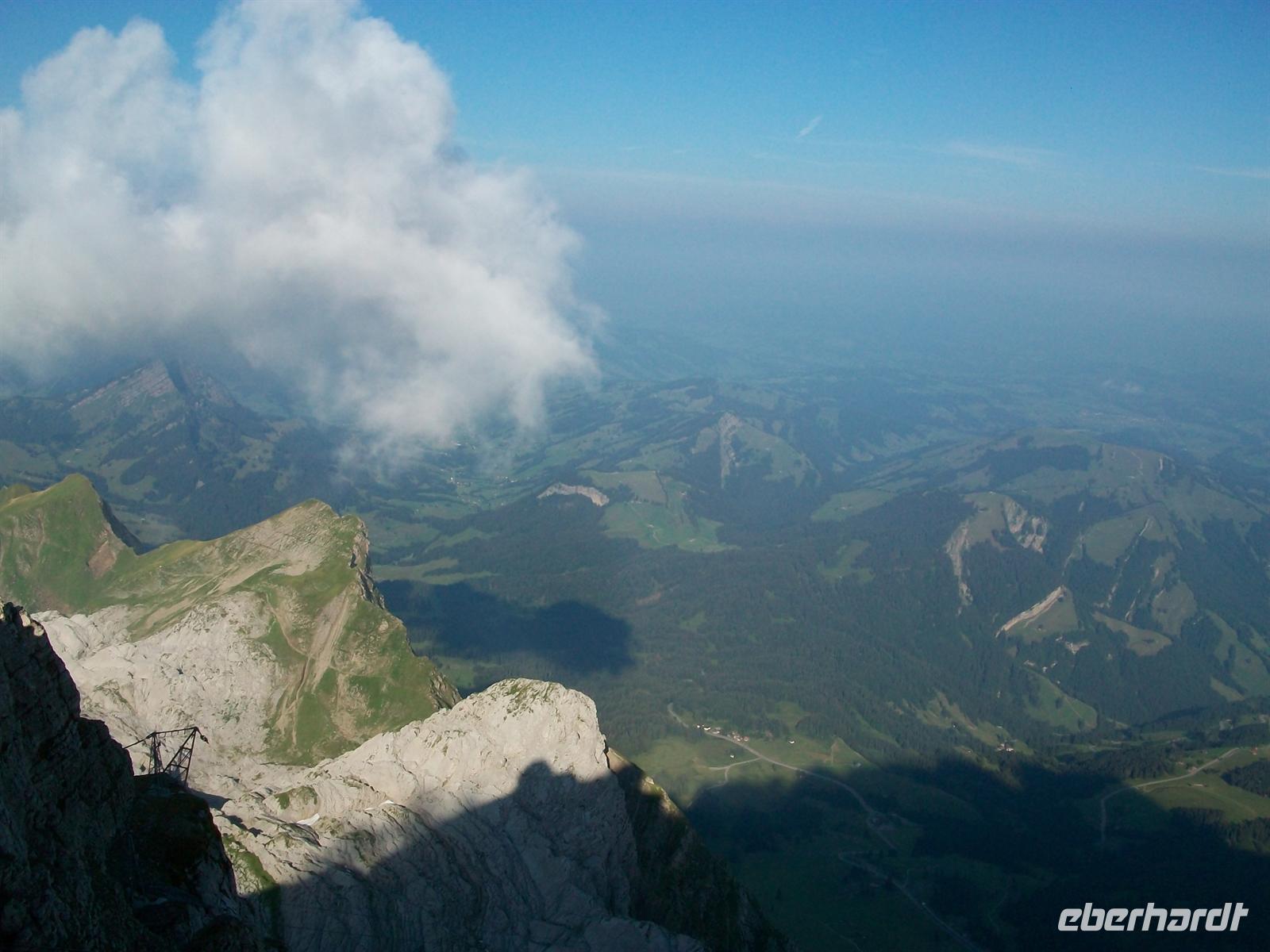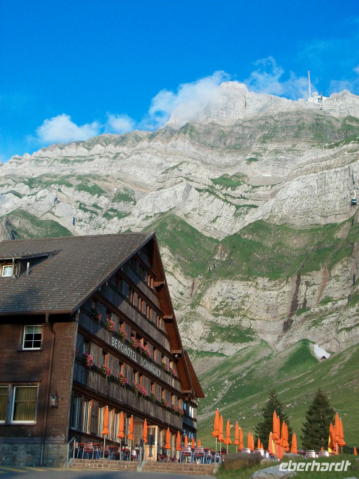 13.8.2012. Es ist 7.00 Uhr und mein Bick geht hinauf zur Säntisspitze, auch wenn dort oben einige Wolken zu sehen sind der Blick ist frei. Schon eine halbe Stunde später hat sich unsere Reisegesellschaft in der Kabine der Säntisbahn versammelt und wartet gespannt auf die Auffahrt. Dann geht es los, schnell werden die Häuser der Schwägalp kleiner und die Felswand kommt immer näher. Das ist immer wieder beeindruckend, auch der Panoramablick oben auf dem Berg. Das Frühstücksbuffet ist schon aufgebaut und bei dieser reichhaltigen Mahlzeit schweift der Blick immer wieder hinaus auf eine grandiose Bergwelt. Es ist noch einmal ein ganz großer Höhepunkt zum Abschluss einer schönen Reise; nach dem Frühstück verbleibt unseren Gästen noch Zeit die verschiedenen Aussichtspunkte zu besuchen die dem Betrachter immer neue Perspektiven eröffnen und diesen Vormittag mit Blicken weit hinaus ins schöne Land beschließen.