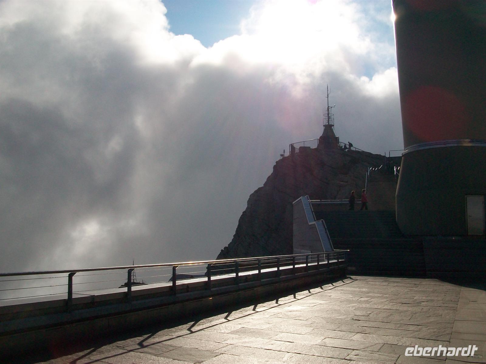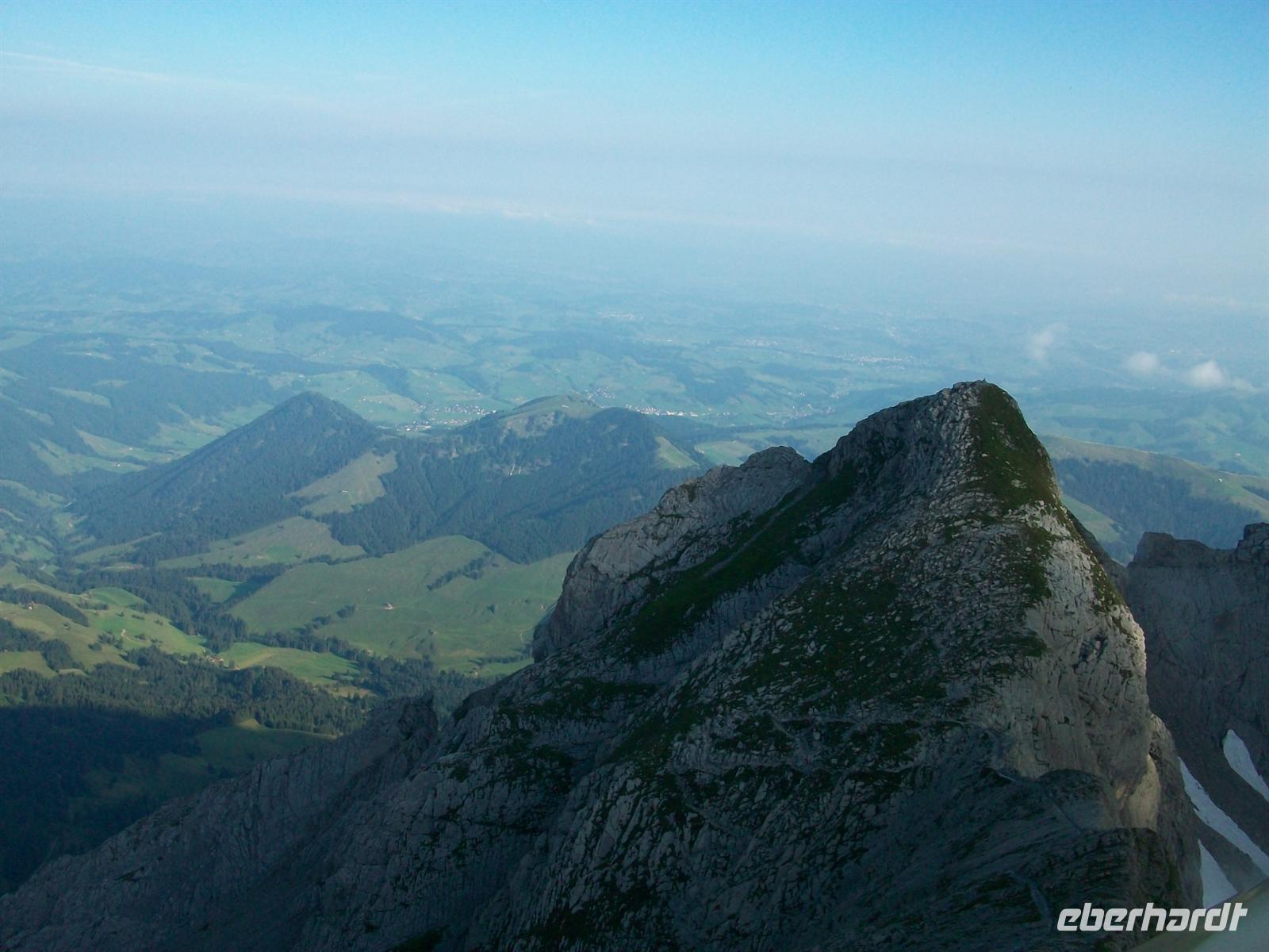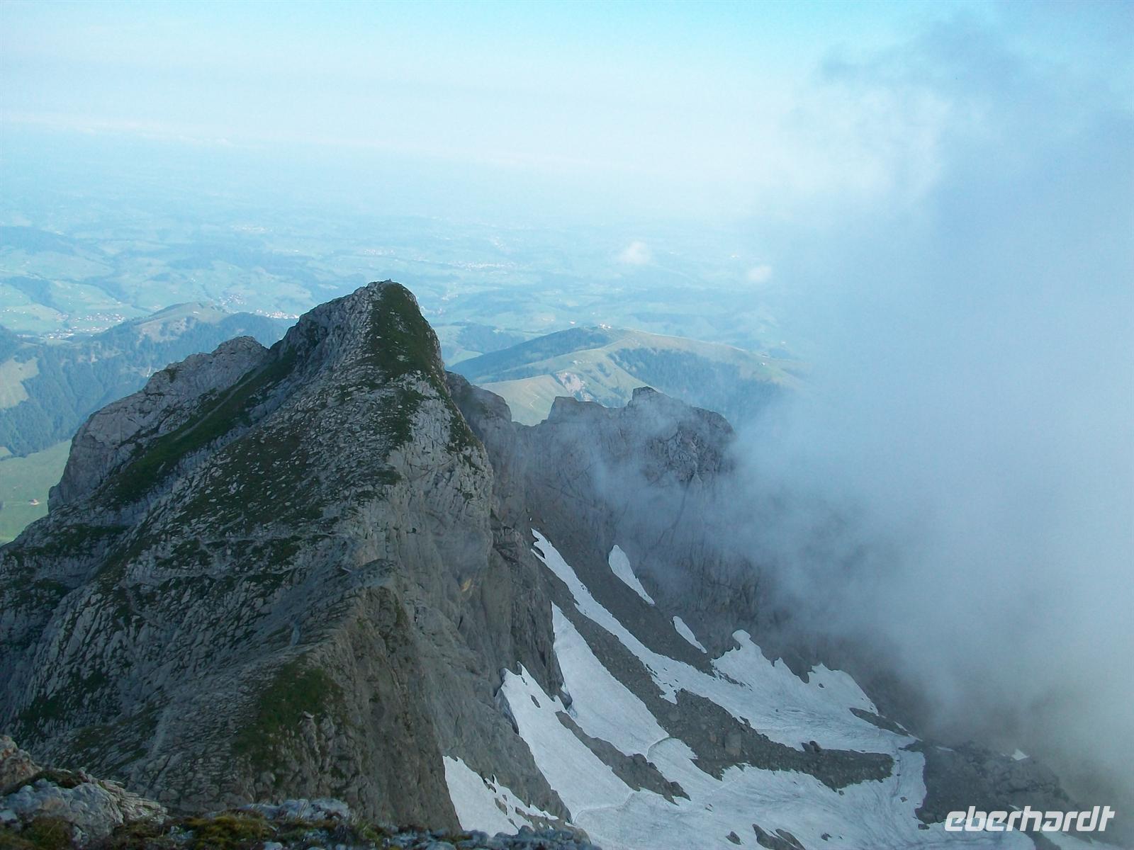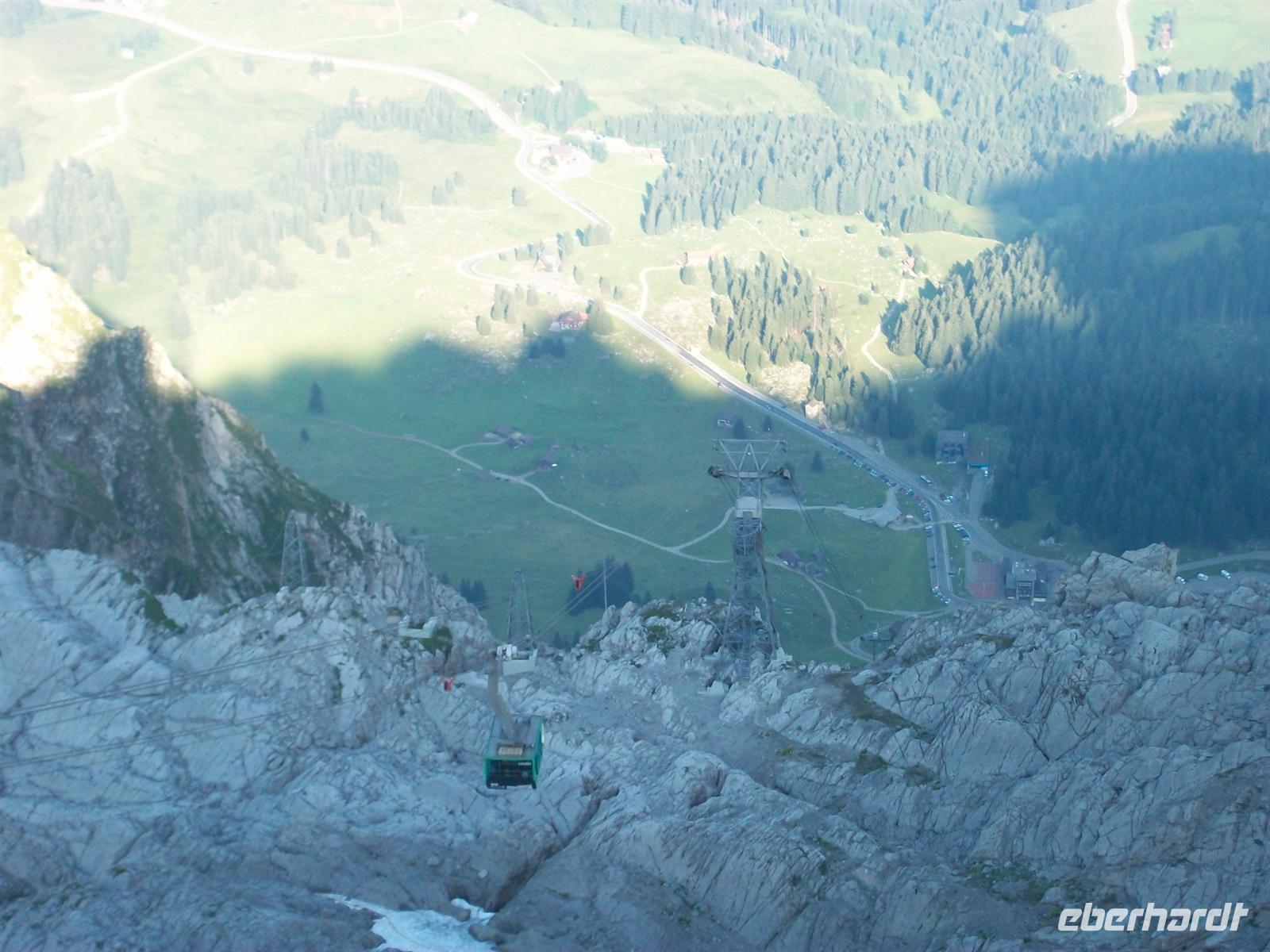 13.8.2012. Es ist 7.00 Uhr und mein Bick geht hinauf zur Säntisspitze, auch wenn dort oben einige Wolken zu sehen sind der Blick ist frei. Schon eine halbe Stunde später hat sich unsere Reisegesellschaft in der Kabine der Säntisbahn versammelt und wartet gespannt auf die Auffahrt. Dann geht es los, schnell werden die Häuser der Schwägalp kleiner und die Felswand kommt immer näher. Das ist immer wieder beeindruckend, auch der Panoramablick oben auf dem Berg. Das Frühstücksbuffet ist schon aufgebaut und bei dieser reichhaltigen Mahlzeit schweift der Blick immer wieder hinaus auf eine grandiose Bergwelt. Es ist noch einmal ein ganz großer Höhepunkt zum Abschluss einer schönen Reise; nach dem Frühstück verbleibt unseren Gästen noch Zeit die verschiedenen Aussichtspunkte zu besuchen die dem Betrachter immer neue Perspektiven eröffnen und diesen Vormittag mit Blicken weit hinaus ins schöne Land beschließen.