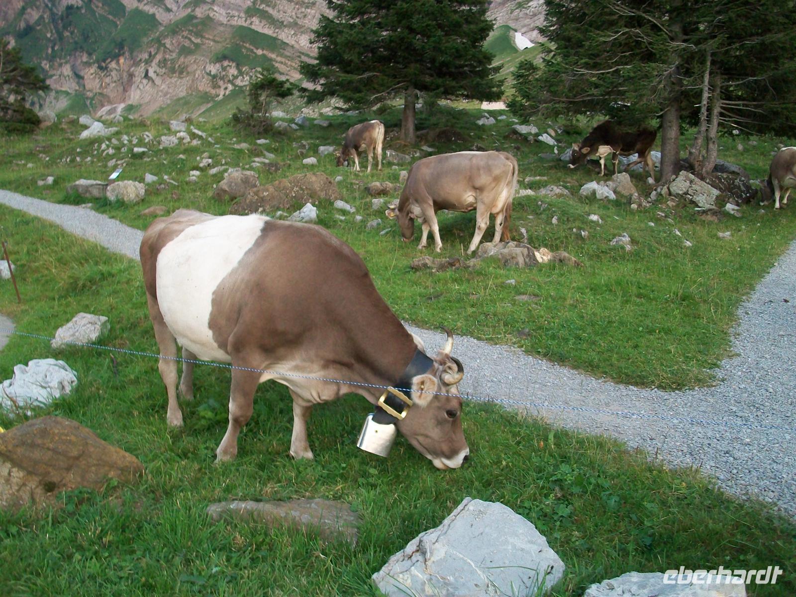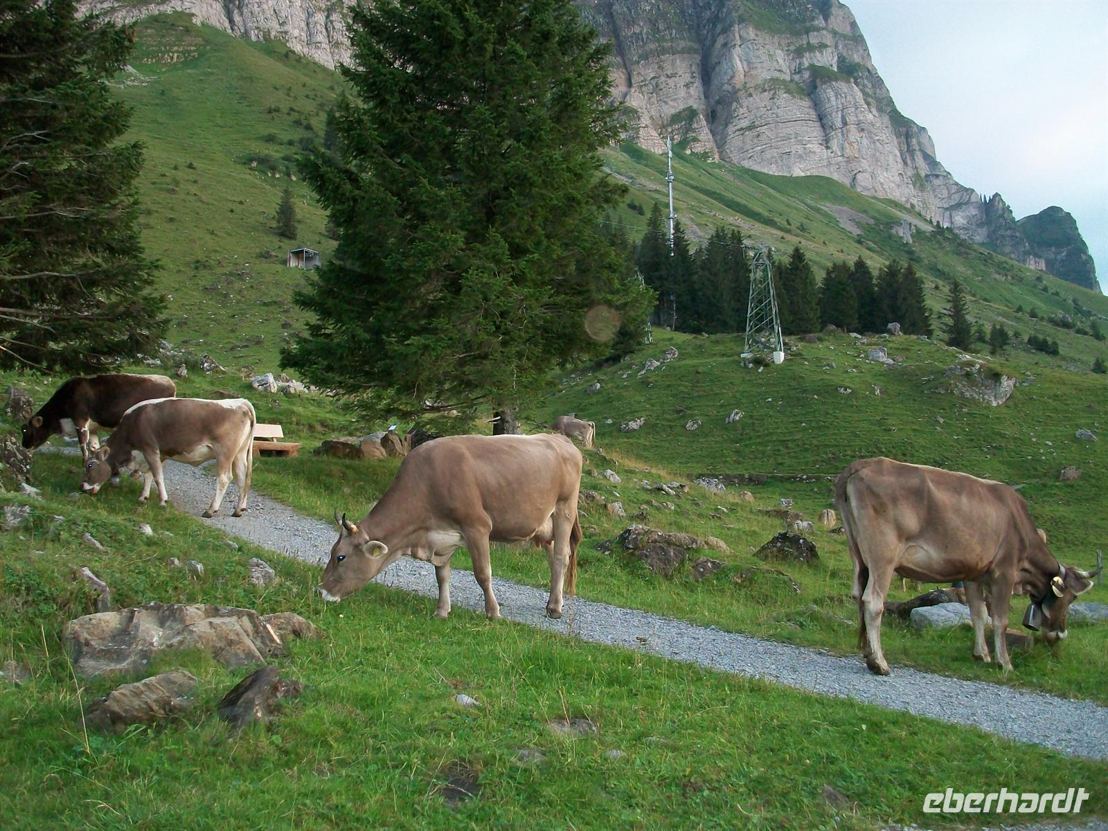 Gegen halb vier setzen wir unseren Weg fort, hinter Hirzel haben wir einen schönen Blick auf die große Wasserfläche des Zürichsees und bei Rapperswil überqueren wir ihn über einen Damm. Dann geht es weiter durch das schöne Toggenburg, ein sanftes Hügelland das geprägt ist von Landwirtschaft, altertümlichen Häusern und es macht einen sehr gepflegten Eindruck. Bald sehen wir auch schon von weitem die mächtige Wand des Säntisgebirges- unser heutiges Ziel. Wie so oft hat die Spitze einige Wolken gefangen, die aber bald verschwunden sind. Als wir gegen halb sechs an unserem Hotel Schwägalp anlangen, werden wir schon von den vierbeinigen Bewohnern der saftigen Wiesen, den Milchkühen, mit einem Konzert von zahlreichen Kuhglocken empfangen. Schnell sind die Zimmer verteilt, zum Abendessen kommt auch nochmal die Sonne heraus und zaubert uns schöne Farben an die Säntiswand. Auch dieser schöne Tag neigt sich dem Ende entgegen, ein letzter Spaziergang in sauberer Gebirgsluft ist wohltuend, ich genieße die Stille der Natur, doch es ist etwas frisch geworden, kündigt sich schon der Herbst an?