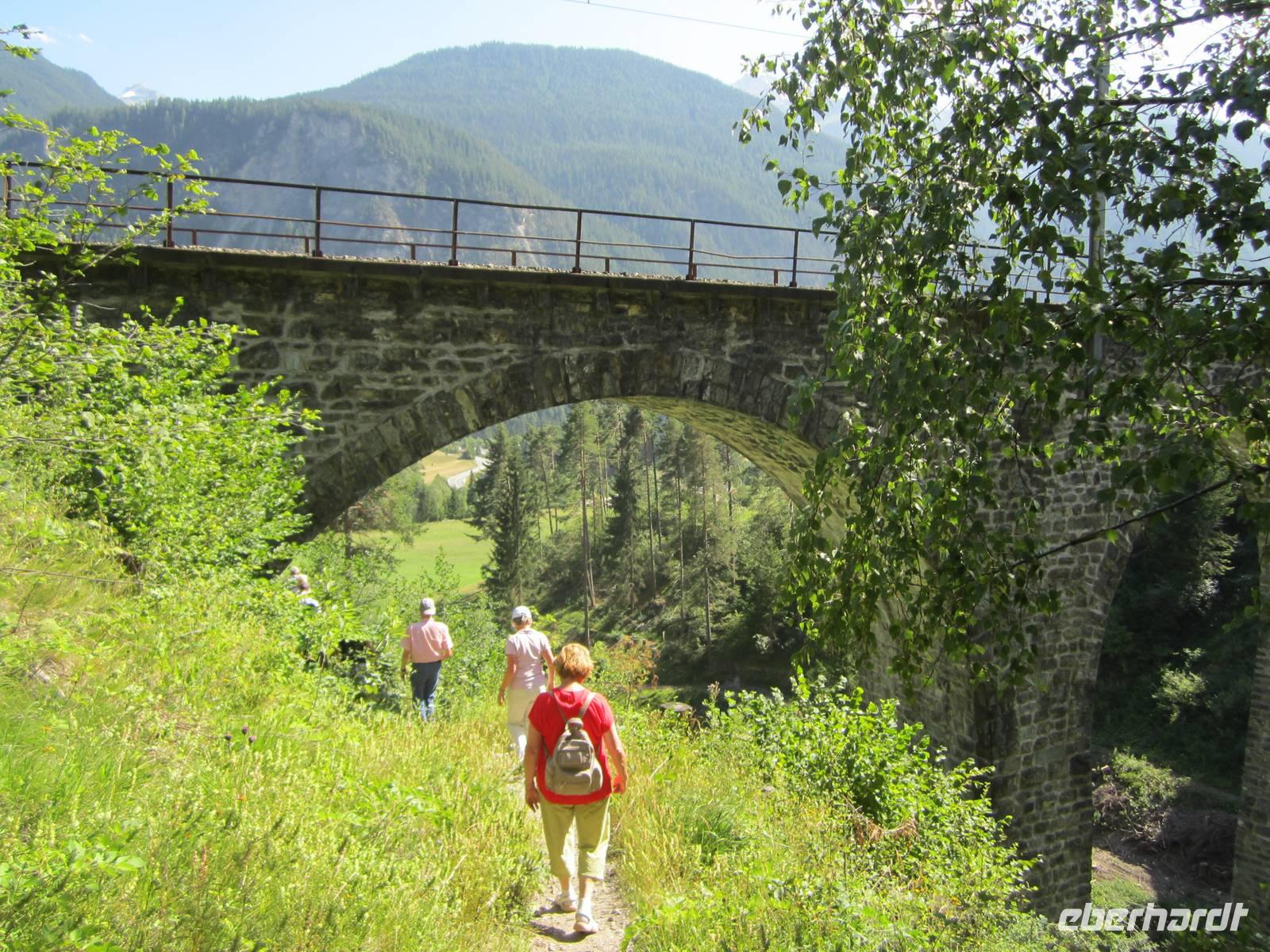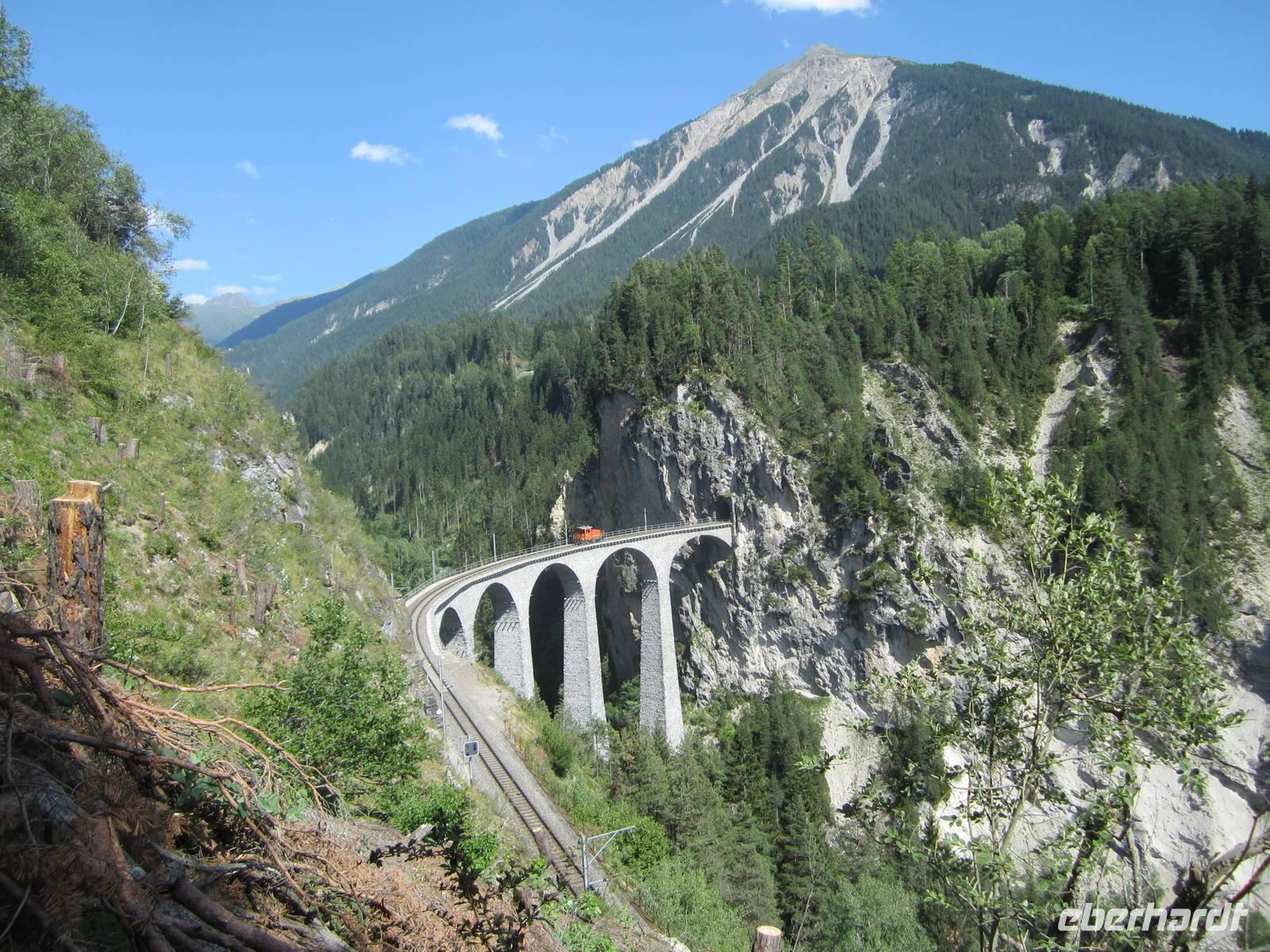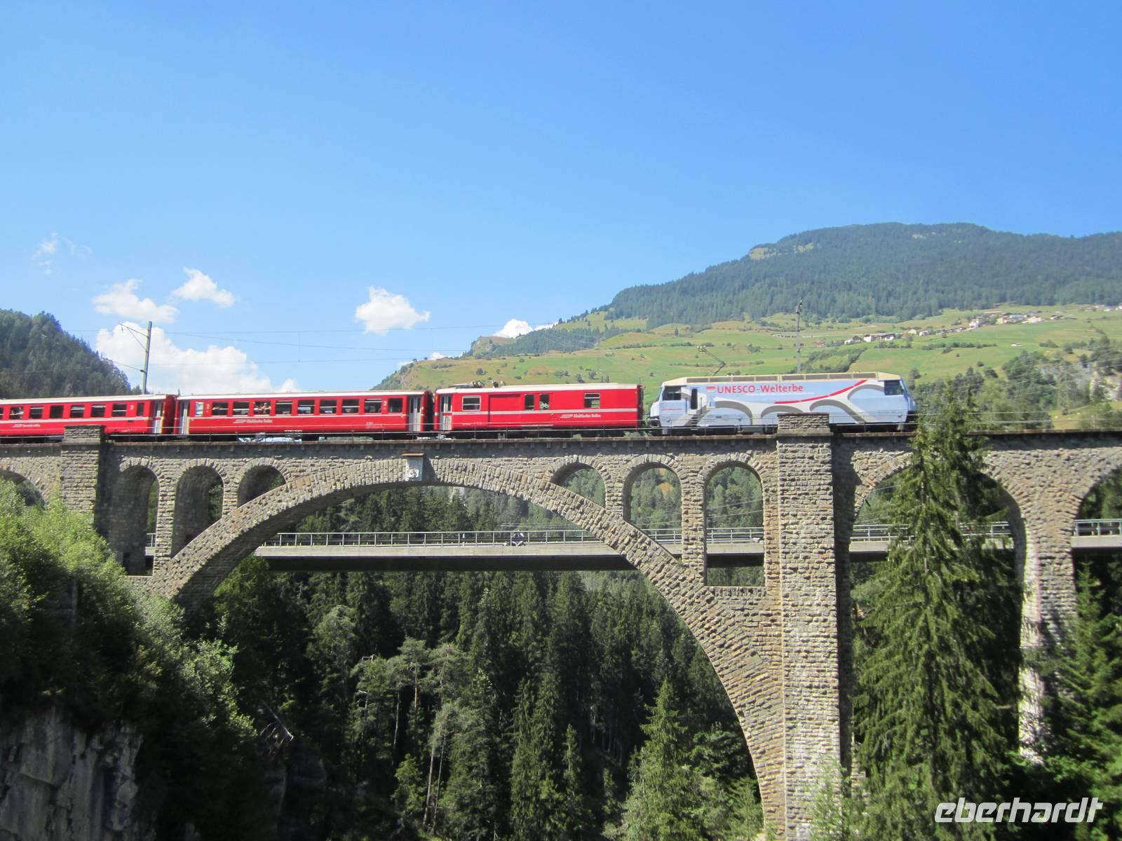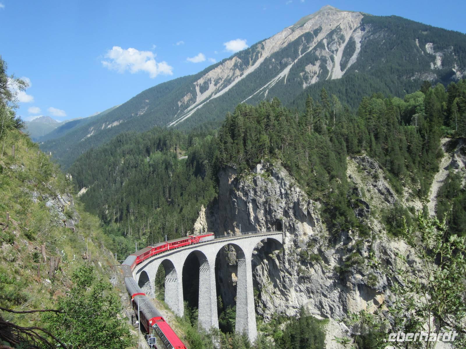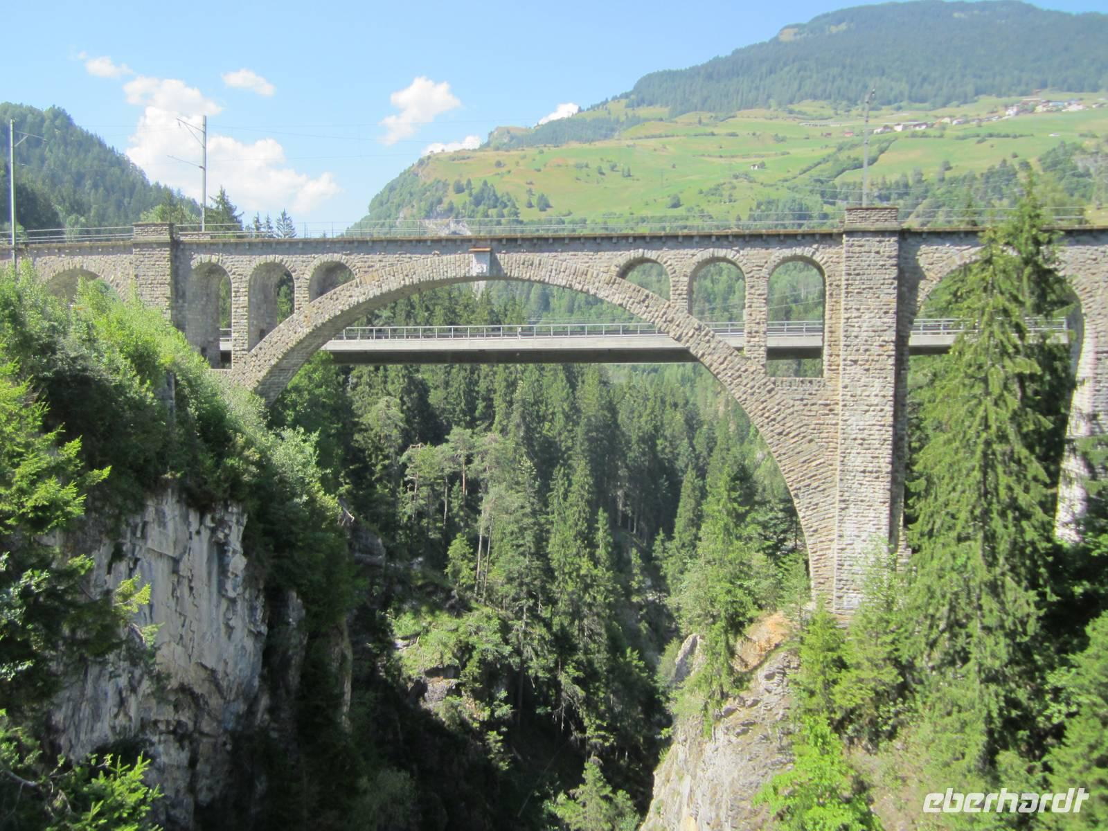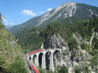 Sonne pur auch heute. Wir erleben die heißen Sonnentage und sind dabei sehr zufrieden, dass es nicht regnet. Fast alle Gäste sind wieder im Bus. Der fakultative Ausflug in das Engadin hat einige Höhepunkte parat. Das Engadin steht für eine harmonische Berglandschaft mit einem ganz besonderen Licht, klarem Himmel, leuchtenden Farben und vielen Sonnentagen. Unsere besondere Aufmerksamkeit richtet sich natürlich auf St. Moritz. Und somit fahren wir wieder über den Flüelapass in das Engadin nach Susch (Unterengadin), weiter in das Oberengadin mit den Orten Zernez, Zuoz, Samedan dem Hauptort des Oberengardin. Bei der Fahrt bewundern wir immer wieder die weiß gekalkten Steinhäuser mit Sgraffito-Schmuck, aber auch die schönen Erker und die kunstvollen Fenstergitter. Nun geht es aber nach St. Moritz als „Top of The World" der in aller Welt berühmte exklusivste und teuerste Wintersportort der Alpen. Zwei Stunden nehmen wir uns Zeit den Ort zu erkunden. Die Hotelpaläste und Geschäfte sind zum großen Teil noch geschlossen. Wir erleben St. Moritz bei schönem Wetter und Einzelne schaffen in der Zeit den See zu "umrunden".Weiter führt uns unsere Fahrt über den Julierpass (2.284 m), der seinen Namen von Julius Cäsar hat nach Tiefenkastel. Bevor wir das Landwassertal wieder nach Davos fahren, erlauben wir uns einen Abstecher. Wir fahren zur Schinschlucht mit dem Soliser Viadukt. Die den Fluss Albula überspannende Brücke ist 89 m hoch und 164 m lang und ist damit die höchste Brücke der RhB. Geplant war natürlich auch hier, dass wir zur richtigen Zeit am richtigen Ort waren. Das Foto natürlich mit dem Zug auf dem Solis Viadukt.Nun aber weiter nach Davos. Entlang des Landwassertals. Bei schönem Wetter gönnen wir uns noch eine kleine Wanderung. Das Landwasserviadukt ist unser Ziel. In der Nähe von Filisur parken wir mit dem Bus und die trainierten Wanderer erreichen einen gekennzeichneten Fotostopp oberhalb der Brücke. Die Sonne meint es gut mit uns und ein großer Teil der Gruppe wartet auf dem Aussichtspunkt auf den Zug. Die Fotografen haben die Züge aus beiden Richtungen im "Kasten". Der Weg hat sich gelohnt. Einen besseren Blick auf die Brücke kann man sich nicht wünschen.Unsere weitere Fahrt führt uns durch Schmitten und Wiesen wieder nach Davos.