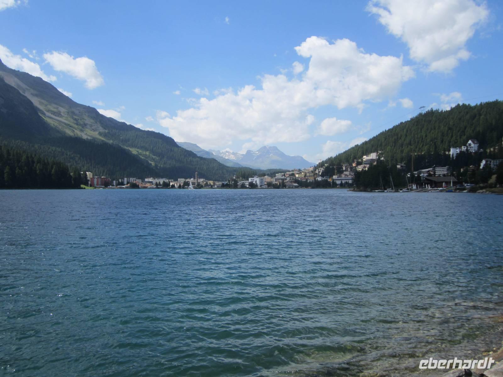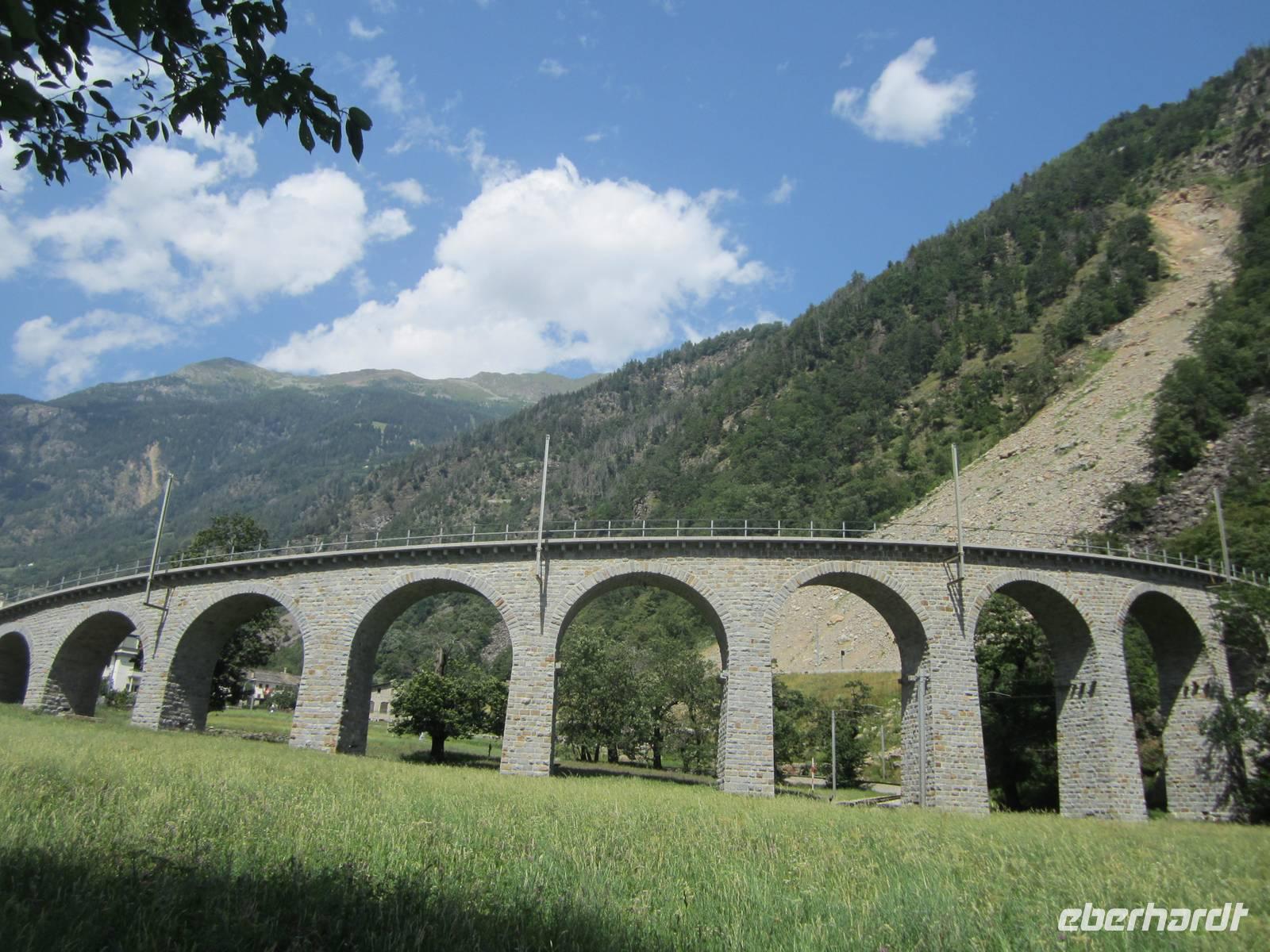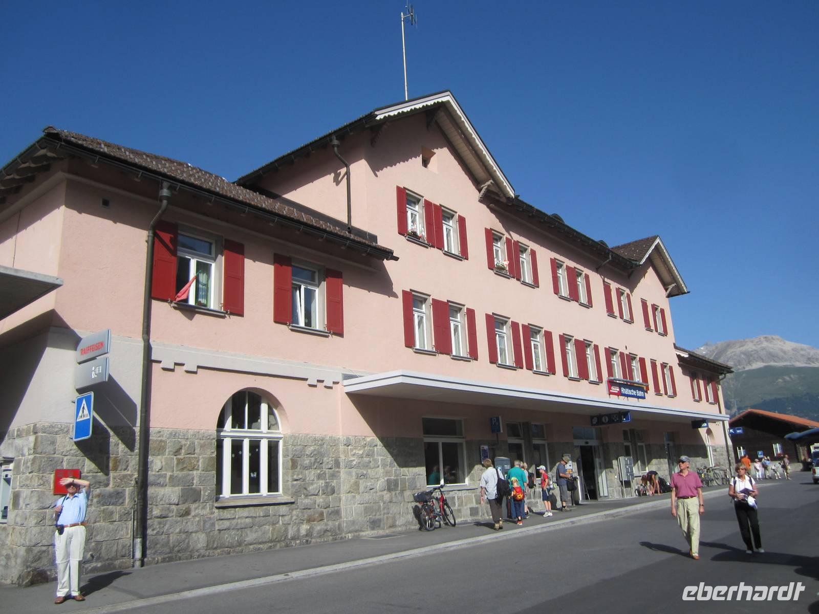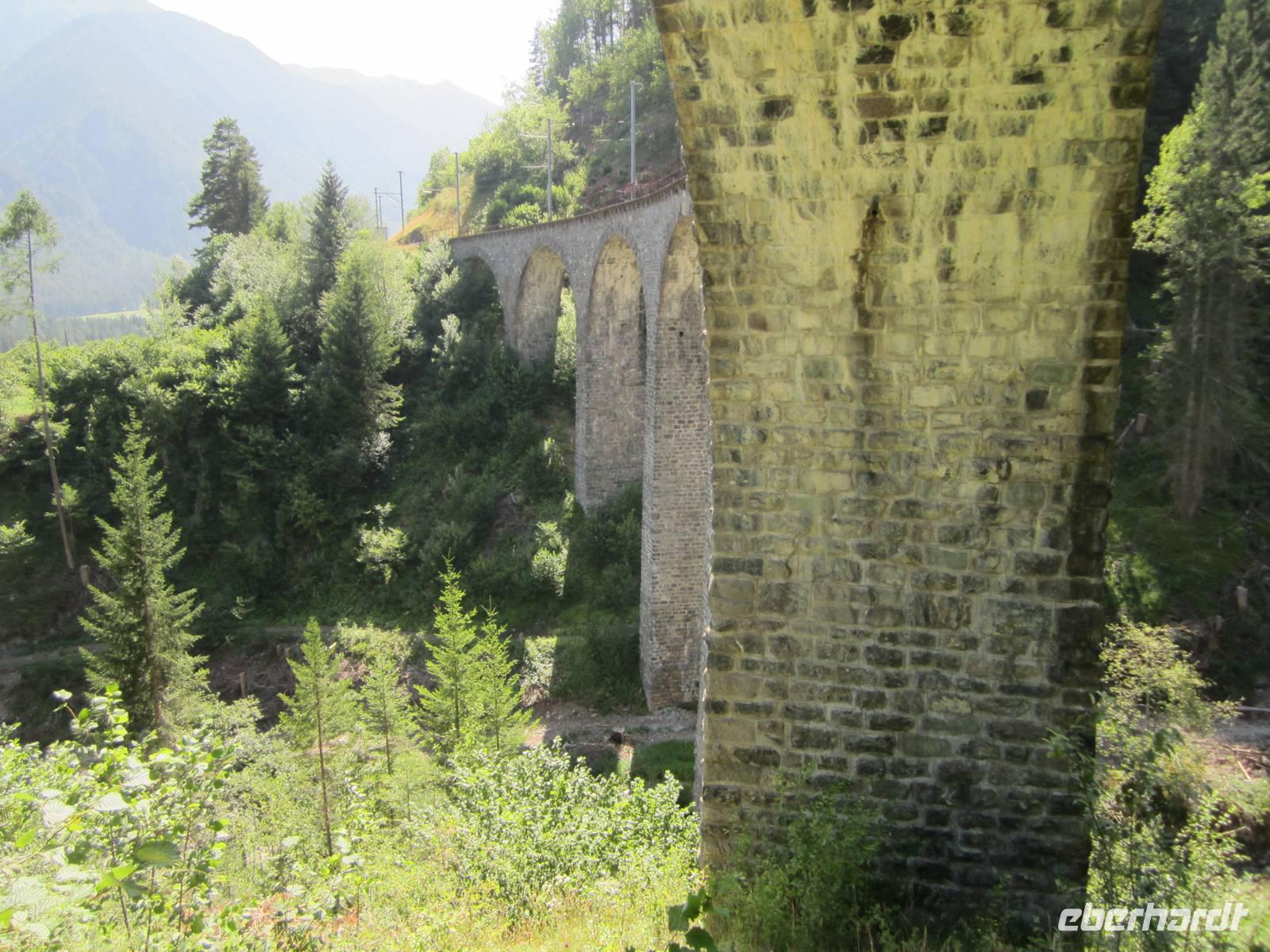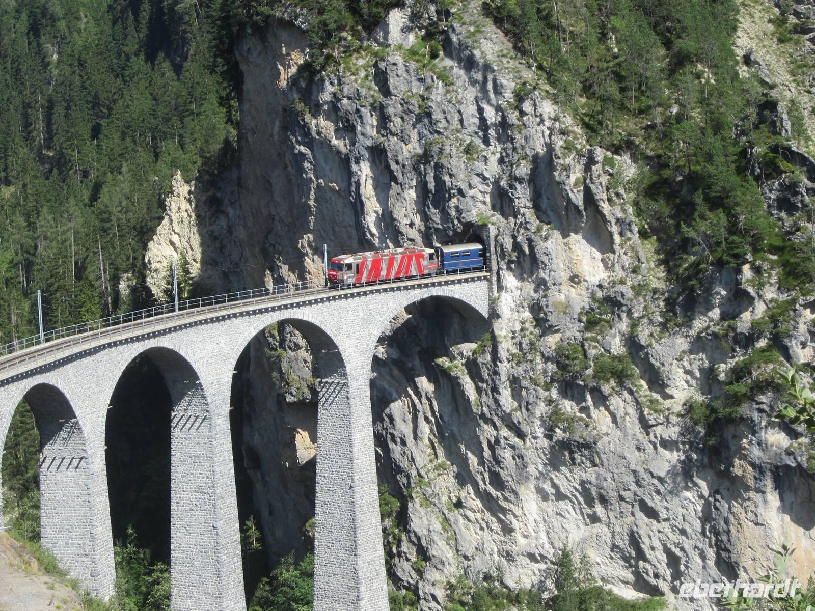 Sonne pur auch heute. Wir erleben die heißen Sonnentage und sind dabei sehr zufrieden, dass es nicht regnet. Fast alle Gäste sind wieder im Bus. Der fakultative Ausflug in das Engadin hat einige Höhepunkte parat. Das Engadin steht für eine harmonische Berglandschaft mit einem ganz besonderen Licht, klarem Himmel, leuchtenden Farben und vielen Sonnentagen. Unsere besondere Aufmerksamkeit richtet sich natürlich auf St. Moritz. Und somit fahren wir wieder über den Flüelapass in das Engadin nach Susch (Unterengadin), weiter in das Oberengadin mit den Orten Zernez, Zuoz, Samedan dem Hauptort des Oberengardin. Bei der Fahrt bewundern wir immer wieder die weiß gekalkten Steinhäuser mit Sgraffito-Schmuck, aber auch die schönen Erker und die kunstvollen Fenstergitter. Nun geht es aber nach St. Moritz als „Top of The World" der in aller Welt berühmte exklusivste und teuerste Wintersportort der Alpen. Zwei Stunden nehmen wir uns Zeit den Ort zu erkunden. Die Hotelpaläste und Geschäfte sind zum großen Teil noch geschlossen. Wir erleben St. Moritz bei schönem Wetter und Einzelne schaffen in der Zeit den See zu "umrunden".Weiter führt uns unsere Fahrt über den Julierpass (2.284 m), der seinen Namen von Julius Cäsar hat nach Tiefenkastel. Bevor wir das Landwassertal wieder nach Davos fahren, erlauben wir uns einen Abstecher. Wir fahren zur Schinschlucht mit dem Soliser Viadukt. Die den Fluss Albula überspannende Brücke ist 89 m hoch und 164 m lang und ist damit die höchste Brücke der RhB. Geplant war natürlich auch hier, dass wir zur richtigen Zeit am richtigen Ort waren. Das Foto natürlich mit dem Zug auf dem Solis Viadukt.Nun aber weiter nach Davos. Entlang des Landwassertals. Bei schönem Wetter gönnen wir uns noch eine kleine Wanderung. Das Landwasserviadukt ist unser Ziel. In der Nähe von Filisur parken wir mit dem Bus und die trainierten Wanderer erreichen einen gekennzeichneten Fotostopp oberhalb der Brücke. Die Sonne meint es gut mit uns und ein großer Teil der Gruppe wartet auf dem Aussichtspunkt auf den Zug. Die Fotografen haben die Züge aus beiden Richtungen im "Kasten". Der Weg hat sich gelohnt. Einen besseren Blick auf die Brücke kann man sich nicht wünschen.Unsere weitere Fahrt führt uns durch Schmitten und Wiesen wieder nach Davos.