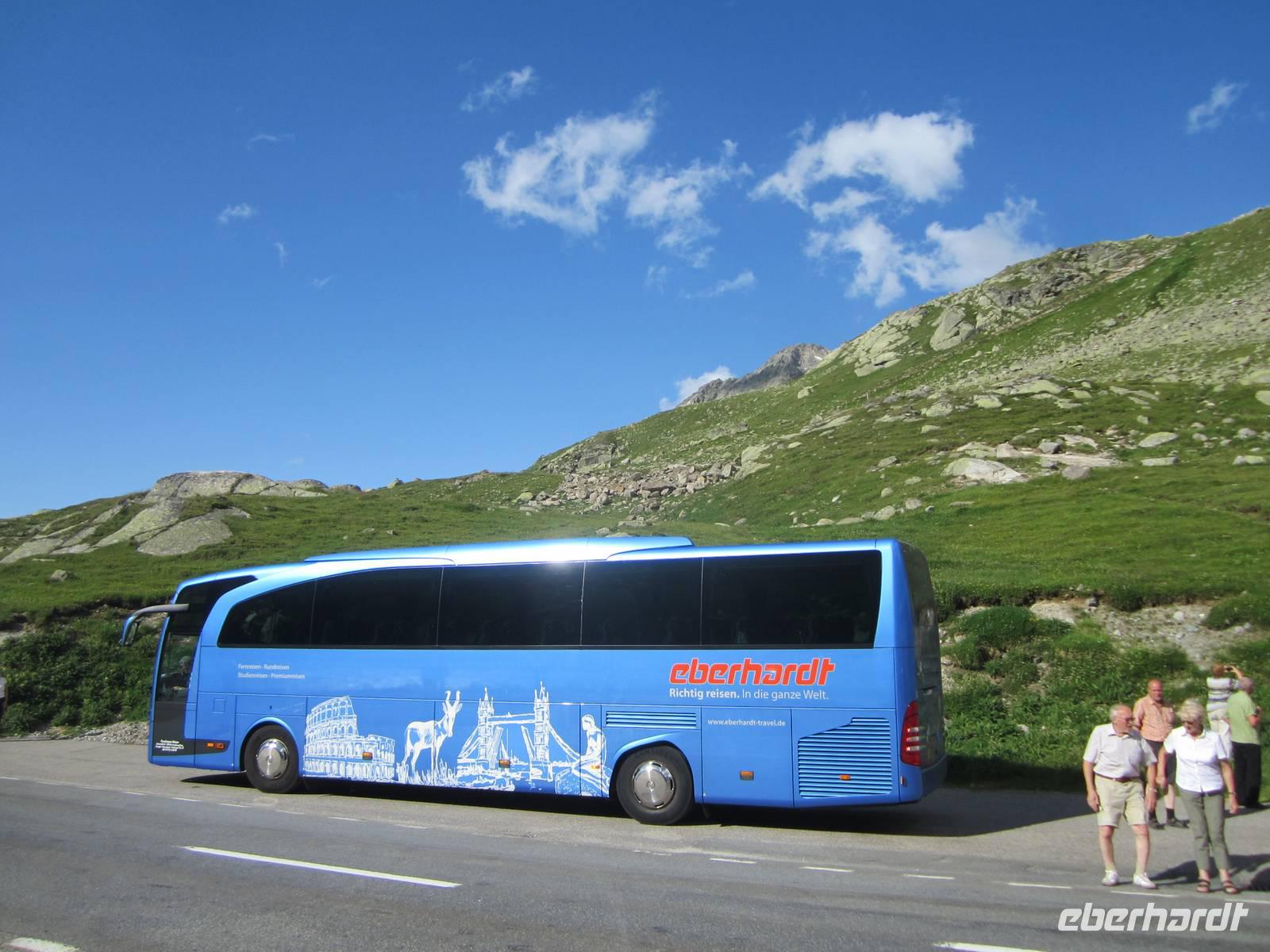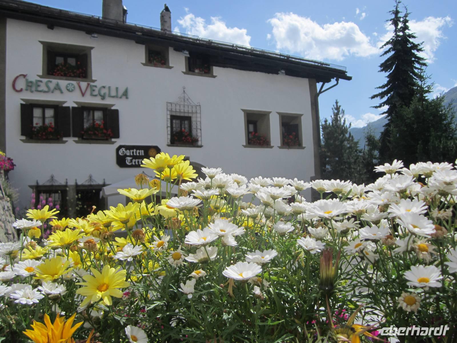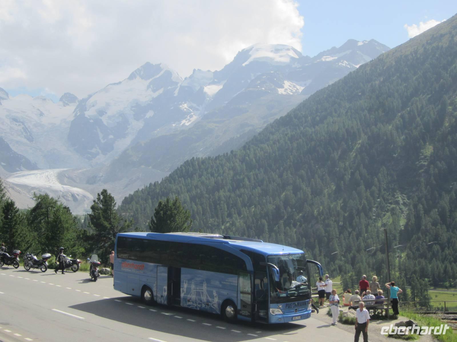 Nach dem Frühstück geht es nach Pontresina. Auf der Strecke fahren wir unseren ersten Pass den Flüela, (2383 m) Unser Fahrer Dietmar bewältigt die Kehren sicher und perfekt. Somit können wir uns voll und ganz auf die Bergwelt konzentrieren. Die Berge, die Blumenvielfalt der Bergwiesen und die Fahrt am Inn entlang ist schon ein Erlebnis. Wir wollen aber nach Pontresina, um mit dem Bernina- Express, der höchsten Bahnverbindung, die offen - ohne Scheiteltunnel - über die Alpen führt, nach Tirano. Begeisterung bei allen Gästen, vor allem natürlich bei den Fotografen. In Tirano bei sommerlichen 39 Grad angekommen, probieren wir erst einmal die italienische Küche im Restaurant „Al Portici". Es bleibt noch Zeit für die Kirche Madonna di Tirano, oder auch für einen kurzen Besuch der Altstadt. Die Strecke zurück nach Pontresina mit dem Bus zu erleben hat einen besonderen Reiz. Die Fotografen können noch einmal in vollen Zügen die unterschiedlichen Sehenswürdigkeiten fotografieren. Eines der beliebten Motive ist natürlich der Kreisviadukt in Brusio. Nach ein paar Minuten warten, kommt die Bahn aus Tirano und fährt über den Viadukt. Natürlich war alles bestellt. Weitere schöne Fotomotive sind der Berninapass, der Morteratsch - Gletscher (hier wollte es der Zufall das noch eine Bahn auf das Foto kommt) und auch der Flüela Pass.Sehr zufrieden mit dem heutigen Progamm beenden wir den Tag bei einem gemütlichen Essen im Hotel.