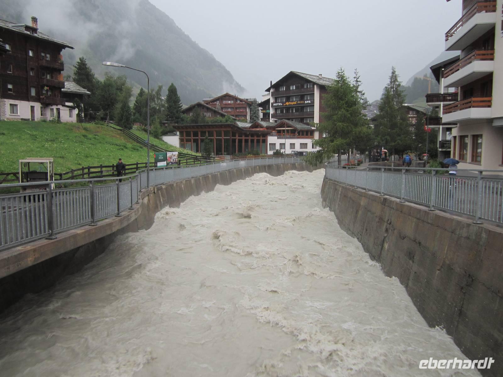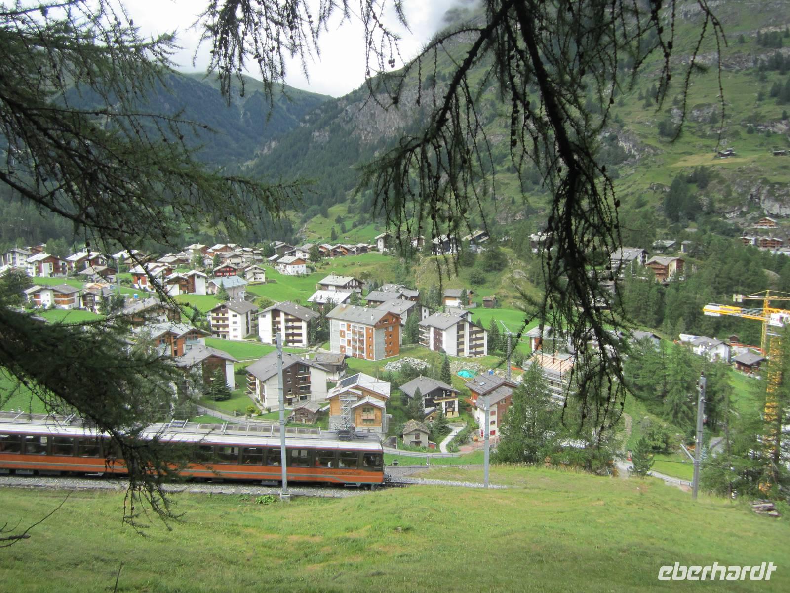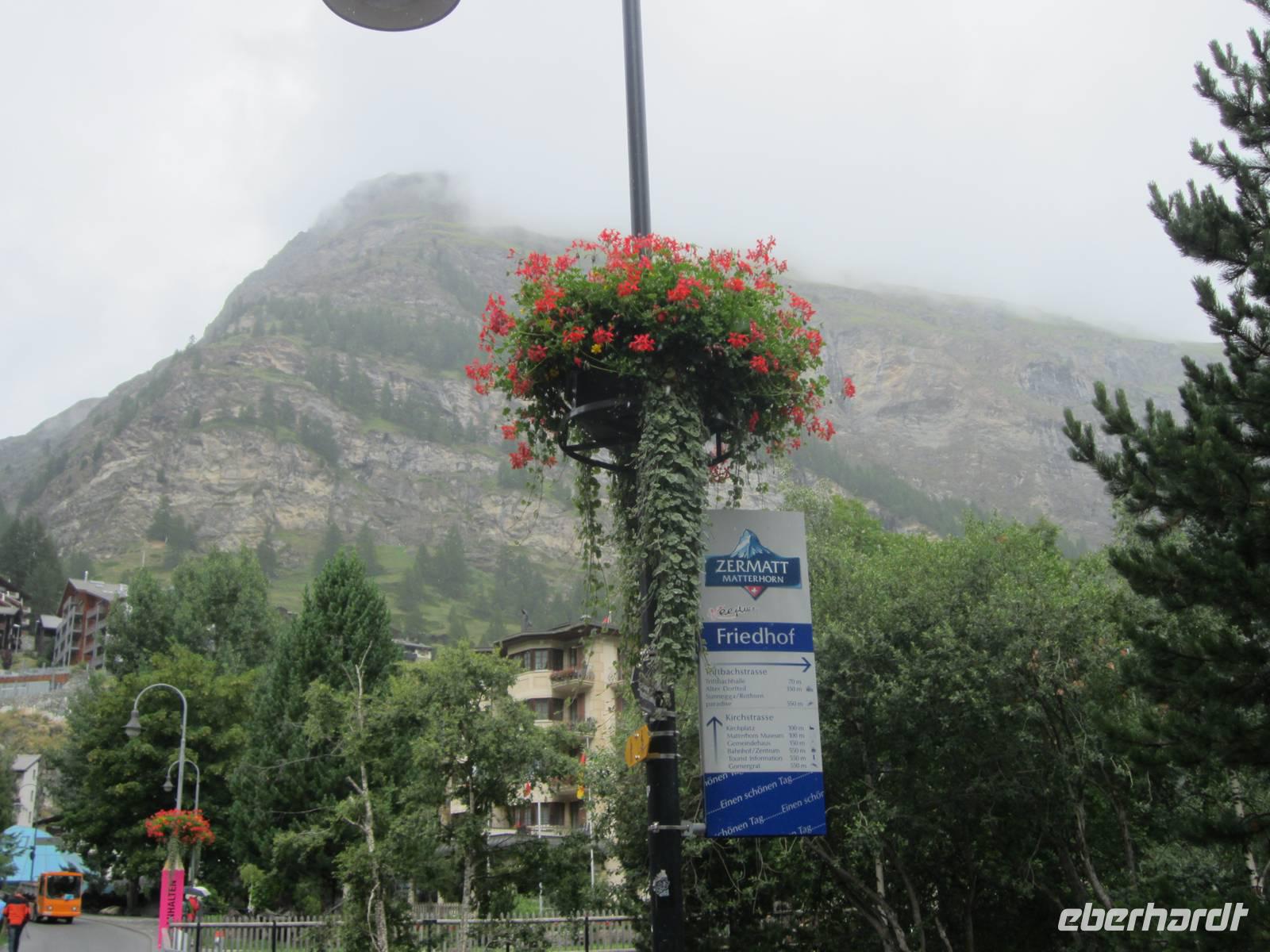 Unser Ziel sollte heute der Gornergrat sein. Das Wetter spielt nicht mit. Die Berge sind nicht zu sehen und es regnet. Wir ändern das Programm und bummeln durch Zermatt. Entlang der 600 m langen Bahnhofstraße erleben wir das Ziegentreiben. In den Ferien werden die Ziegen von den Ferienkindern durch den Ort getrieben. Für die Touristen immer ein besonderes Erlebnis. Weiter führt uns unser Weg zur Englichen Kirche mit Bergsteigergräbern, durch das alte Zermatt mit den schönen Häusern und einigen Speichern aus Lärchenholz im Walliser Baustil, mit den Mäuseplatten.Weiter geht es zum Markt mit dem reizvollen Murmeltierbrunnen, dem Museum und der Kirche St. Mauritius und Bergsteigerfriedhof. Nach dem Rundgang besuchen wir das Matterhornmuseums. Im Museum sehen wir nicht nur das alte Zermatt, sondern auch den Kampf um das Matterhorn.Am Nachmittag lässt der Regen nach und die Wolken reisen etwas auf. Eine Wanderung z.B. durch die Gornerschlucht ist somit möglich.Am Abend sind wir uns sicher wir hatten das richtige Programm für den trüben Tag.