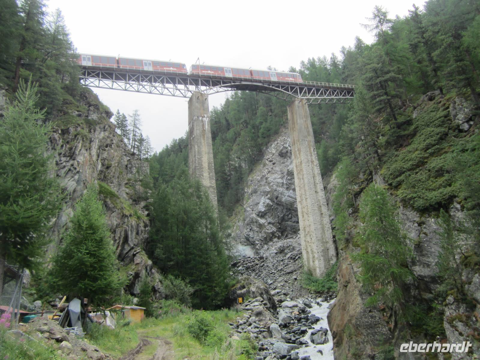 Wir können ausschlafen. Erst 9.00 Uhr werden die Koffer geladen. Der Bus fährt heute ohne uns. Wir werden Dietmar erst heute Abend in Zermatt wieder sehen.10.00 Uhr treffen wir uns am Bahnhof in Davos. Der „langsamste Schnellzug der Welt" steht bereit. Eine Reservierung für Eberhardt Gäste zeigt uns unseren Waggon. Die Fotografen wollen natürlich ans Fenster. Aber die Panoramawagen des Glacier Expresses bieten allen Gästen eine allerbeste Aussicht auf die Umgebung. Unsere Panoramafahrt kann beginnen.Von Davos aus geht es durchs schöne Landwassertal, der Zügenschlucht nach Filisur. Heute überqueren wir das Landwasserviadukt. Unseren Fotostopp sehen wir heute vom Zug aus.Weiter geht es durch die wilde Schynschlucht, vorbei an Burgen und Schlössern, bis nach Chur. Den mit 600 m tiefsten Punkt der Reise. Nach den lieblichen Tälern und grünen Landschaften Graubündens wird es jetzt wieder spannend. In der Rheinschlucht sehen wir den „Grand Canyon der Schweiz". Zwischenzeitlich haben wir die Waggons gewechselt. Wir nehmen unser Mittagessen in historischen Speisewagen ein.Weitere schöne Eindrücke erhalten wir auf der Fahrt nach Zermatt. Dazu gehört Disentis mit der ältesten Benediktinerabtei der Schweiz. Aber auch der Bahnhof ist ein wichtiger Punkt der Reise. Die folgenden Strecken werden teilweise so steil, dass der Zug auf die Hilfe einer Zahnstange angewiesen ist. Nun erklimmen wir den höchsten Punkt der Reise, den 2033 m hohen Oberarlpass. Etwas Aufregung hatten wir auf dieser Strecke schonund nicht nur wegen der interessanten Streckenführung. Ein Teil der Gruppe war in Disentis in den vorderen Waggons der Bahn eingestiegen. Die Waggons wurden aber von unserer Bahn abgekoppelt. Somit vermissten einige Männer und Frauen ihre Partner. Aber die Angst hielt sich in Grenzen. In Andermatt wurde die Gruppe mit einem "Hallo" wieder zusammen geführt.. Auf der weiteren Strecke durchfahren wir den Furka - Basis - Tunnel. 15 km lang und 20 min Fahrzeit. Der Bau des Tunnels (1982) macht es möglich, dass die Bahn das ganze Jahr betrieben werden kann. Weiter geht unsere Fahrt durch das reizvolle Rhonetal hinunter nach Brig. Von hieraus beginnt nun unser Endspurt hinauf in das Mattertal. Tiefe Schluchten säumen den Weg und die uralten Steinbrücken zeugen von regen Handel in vergangenen Zeiten. Vorbei am gewaltigen Bergsturz von 1991 fahren wir nach Zermatt, wo unsere Fahrt mit dem Gacier -Express endet. Der Berg der Berge zeigt sich uns aber nicht. Wir laufen nach der langen Fahrt zum Hotel "Perren". Dietmar und die Koffer sind schon da. Schnell sind die Zimmer bezogen und wir lassen bei einem guten Abendessen den Tag ausklingen.