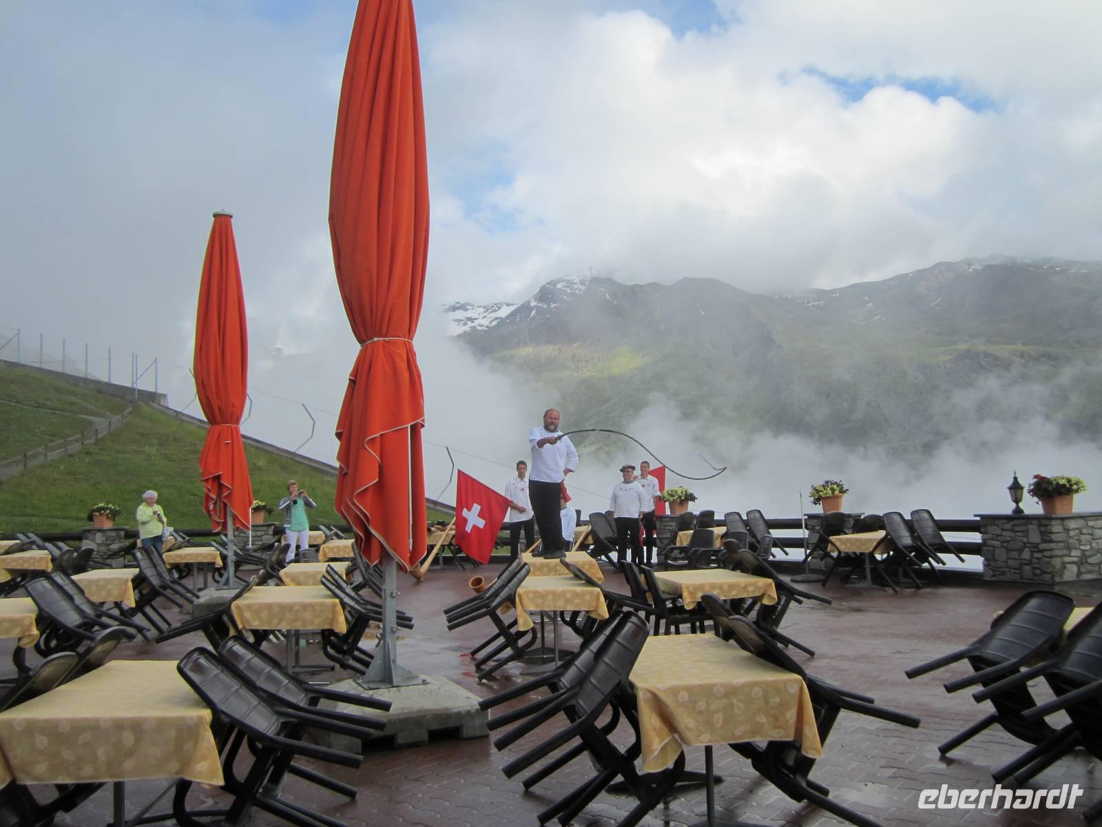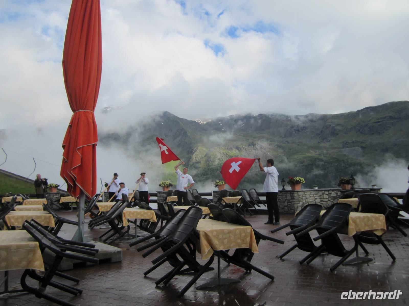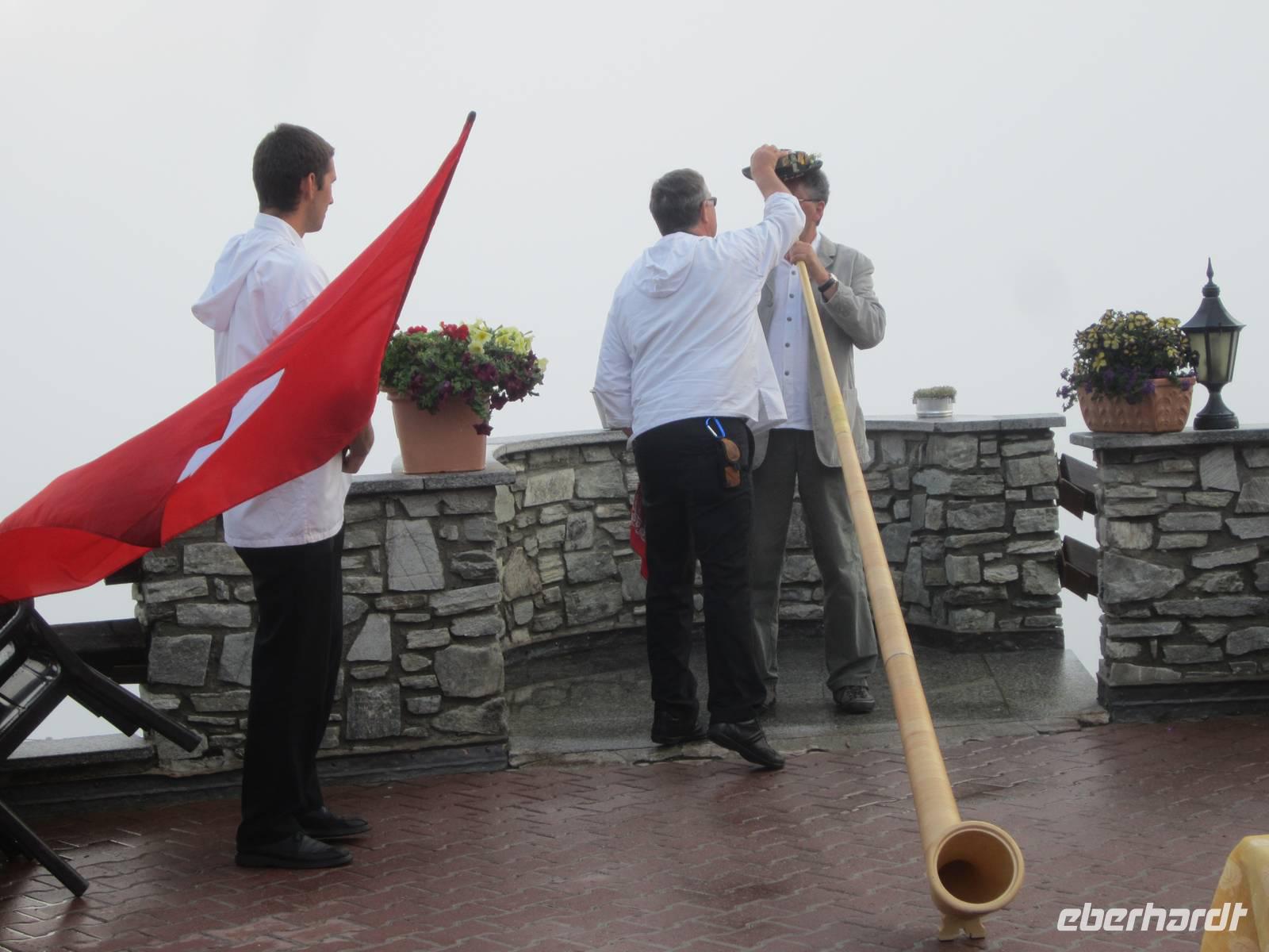 Nach dem Aufwecken, Blick zu den Bergen, über Zermatt liegt der Nebel. Was sagt die Wetterstation auf dem Berg? Teilweise sind die Berge zu erkennen. Aber für morgen sagt der Wetterbericht Sonne pur voraus. Die Entscheidung ist schnell getroffenen. Die Fahrt auf den Gornergrat wird auf den Sonnabend verschoben. Heute legen wir einen Wandertag ein. Individuelle Wanderrouten werden eingeschlagen. Einige von uns treffen sich auf den Ahornweg wieder der oberhalb von Zermatt zur Sunnega führt. Ein anderer Teil der Gruppe fährt mit der höchsten Luftseilbahn Europas zum kleinen Matterhorn(3820 m) Am Nachmittag geht es zurück zum Hotel. Wir haben heute noch ein Bergerlebnis.Ein Abendessen mit Folkloreabend auf der Sunnegga. Wir fahren mit dem Sunnegga - Express eine Tunnel-Standseilbahn zur Sunnegaterrasse (2288m).Begrüßt werden wir von einer Folkloregruppe mit Fahnenschwingern.Nach einem guten Käseracletteund einem schönen Abend fahren wir nach 20.00 Uhr wieder nach Zermatt.Ein sehr schöner Tag geht zu Ende.