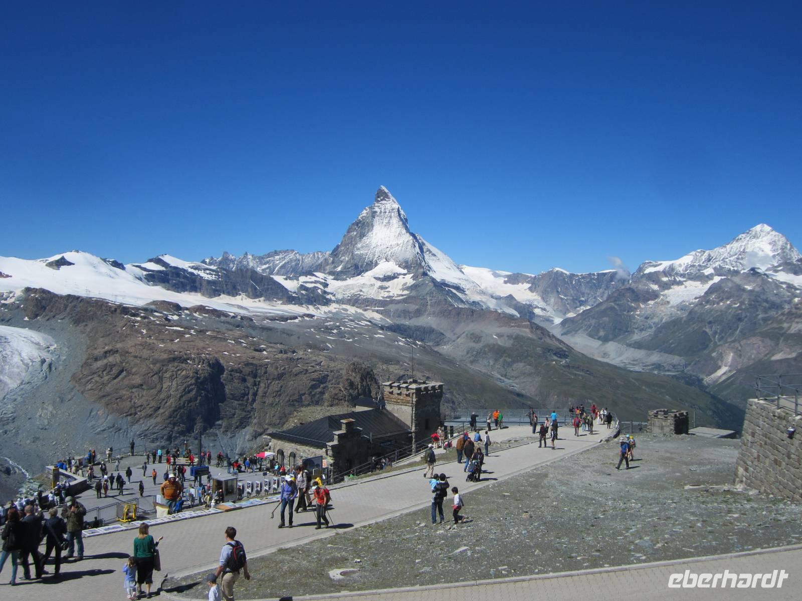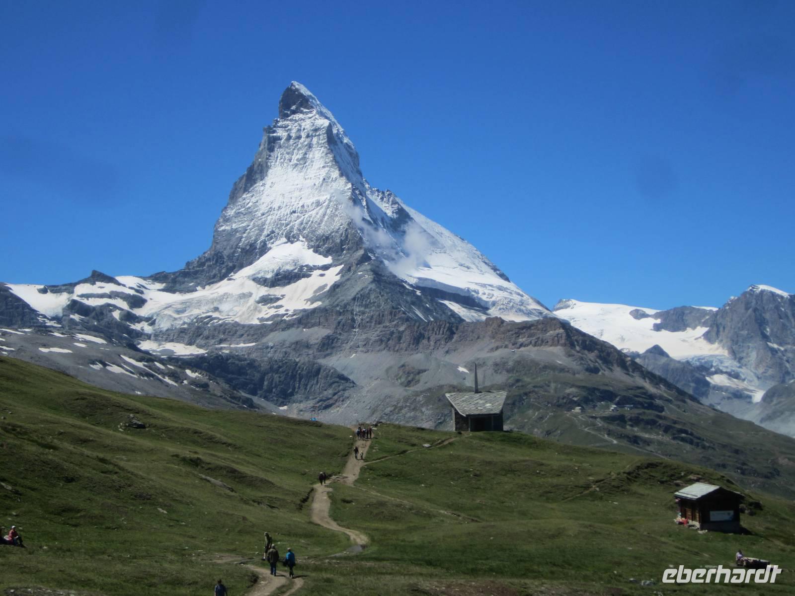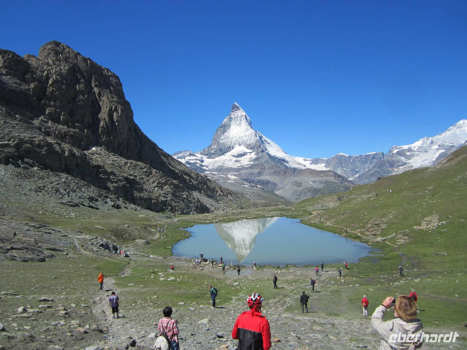 Das Matterhorn ist frei von Wolken. Nach dem Frühstück lassen wir uns nicht aufhalten die Gruppe fährt mit der Gornergratbahn, der höchsten Zahnradbahn Europas, zum 3130m hohen Gornergrat. Welch ein überwältigendes Panorama. Wir benötigen die Sonnenbrille um die Schönheit der Berge genießen zu können.Durch das Aufsteigen der Wolken zeigen sich immer wieder neue Bilder, ein tolles Erlebnis.Die Gestaltung des weiteren Tages kann jeder selbst bestimmen. Ein Teil der Gruppe möchte wandern und so treffen wir uns wieder an der Bahn und fahren bis zur Station Rothenboden (2819m). Hier steigen wir aus und wandern zum Riffelsee. Eine Wanderung mit sehr schönen Blicken auf die Viertausender. Einer der schönsten Blicke ist die Spiegelung des Matterhorns im See. Weiter geht unsere Wanderung zum Riffelberg. (2582m). Danach haben wir uns eine Rast verdient.Am Abend treffen wir uns alle sehr zufrieden mit dem Tag wieder im Hotel.Heute heißt es noch Kofferpacken, mit etwas Wehmut, die Reise geht so langsam dem Ende zu. Aber mit der Gewissheit, wir hatten Glück, dass wir den Berg der Berge in voller Schönheit erleben durften.