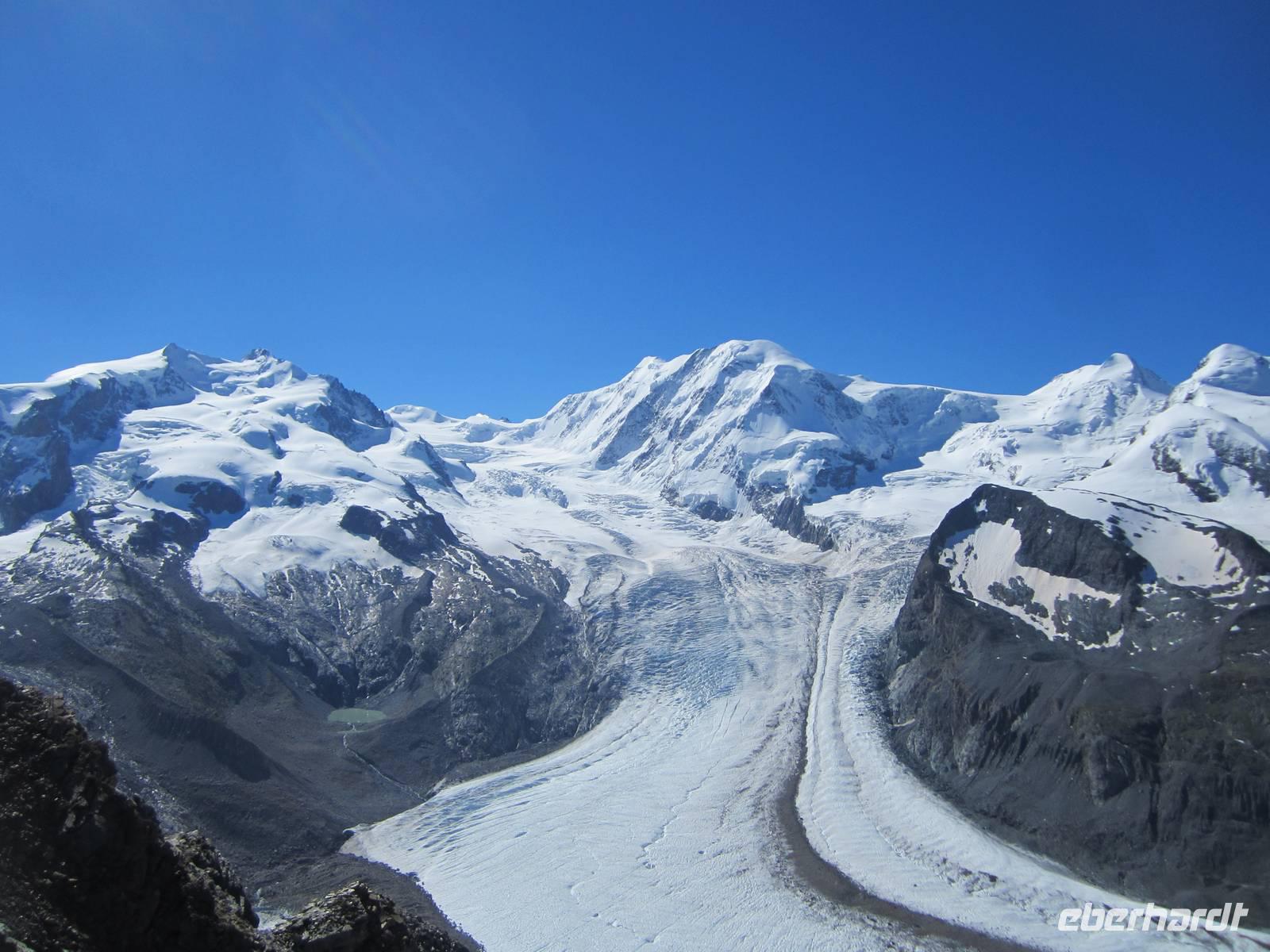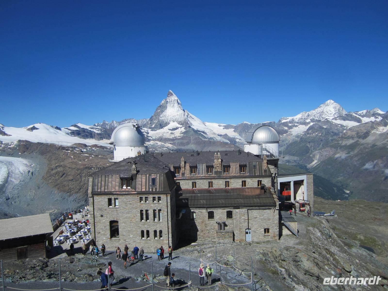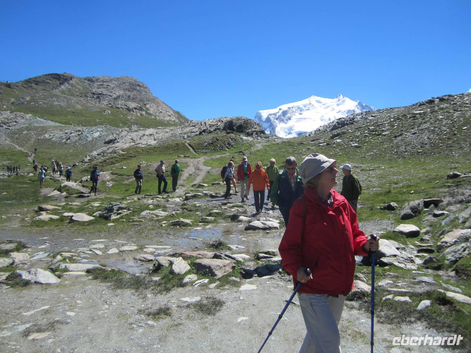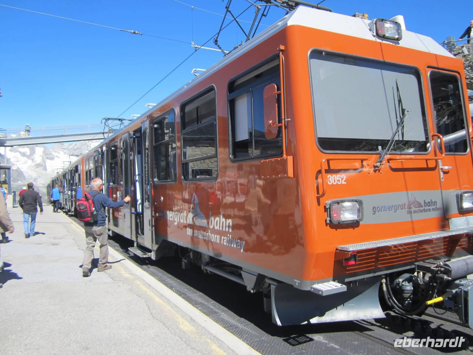 Das Matterhorn ist frei von Wolken. Nach dem Frühstück lassen wir uns nicht aufhalten die Gruppe fährt mit der Gornergratbahn, der höchsten Zahnradbahn Europas, zum 3130m hohen Gornergrat. Welch ein überwältigendes Panorama. Wir benötigen die Sonnenbrille um die Schönheit der Berge genießen zu können.Durch das Aufsteigen der Wolken zeigen sich immer wieder neue Bilder, ein tolles Erlebnis.Die Gestaltung des weiteren Tages kann jeder selbst bestimmen. Ein Teil der Gruppe möchte wandern und so treffen wir uns wieder an der Bahn und fahren bis zur Station Rothenboden (2819m). Hier steigen wir aus und wandern zum Riffelsee. Eine Wanderung mit sehr schönen Blicken auf die Viertausender. Einer der schönsten Blicke ist die Spiegelung des Matterhorns im See. Weiter geht unsere Wanderung zum Riffelberg. (2582m). Danach haben wir uns eine Rast verdient.Am Abend treffen wir uns alle sehr zufrieden mit dem Tag wieder im Hotel.Heute heißt es noch Kofferpacken, mit etwas Wehmut, die Reise geht so langsam dem Ende zu. Aber mit der Gewissheit, wir hatten Glück, dass wir den Berg der Berge in voller Schönheit erleben durften.