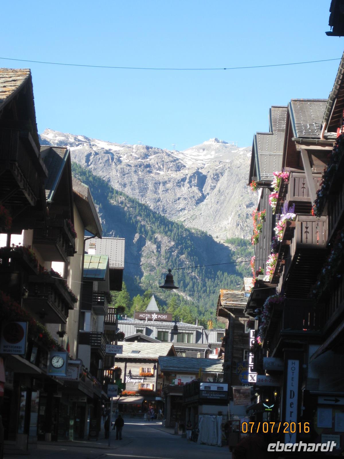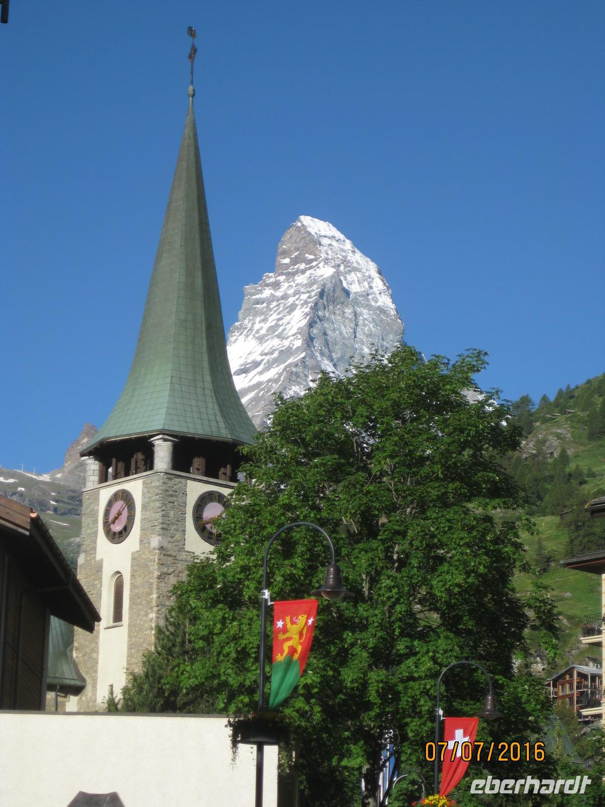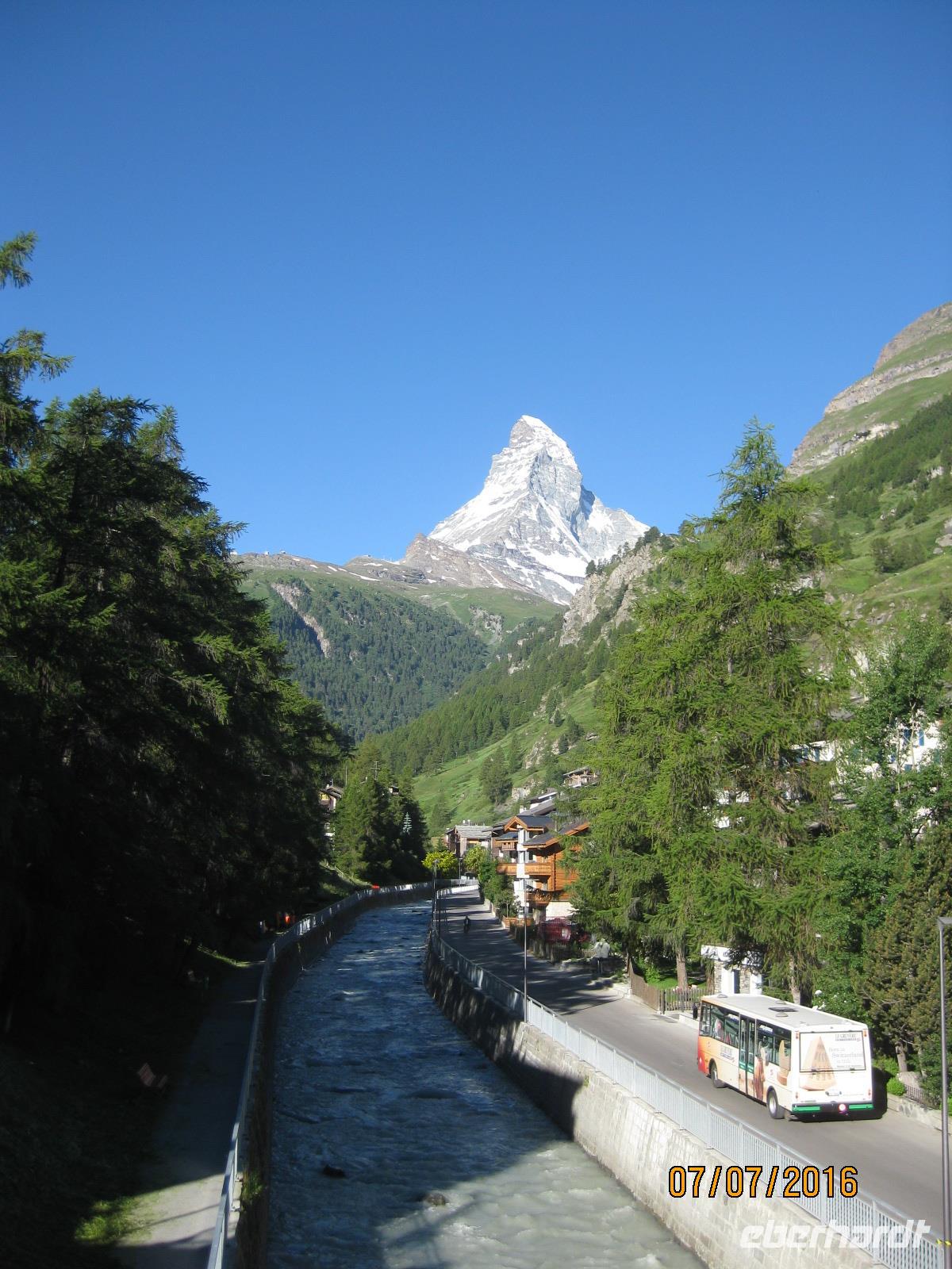 Schon heute erwartet uns unsere zweite Zugfahrt durch die Schweiz. Mit dem "langsamsten Schnellzug der Welt" begeben wir uns auf den Weg in Richtung Zermatt. Der Glacier-Express führt uns von Filisur aus durch die Rheinschlucht, vorbei an Disentis, über den Oberalppass und vorbei an Andermatt nach Zermatt im Wallis. Zahlreiche Tunnel, Viadukte und Passüberquerungen stellen nicht nur Meisterleistungen des Eisenbahnbaus dar sondern geben uns immer wieder ein herrliches Fotomotiv. Insgesamt gesehen ist die Strecke des Glacier Express 291 Kilometer lang und durchläuft drei Kantone der Schweiz: Graubünden, Uri und Wallis. In Visp angekommen, können wir es nun kaum noch erwarten, endlich das Matterhorn sehen zu können. Aber die wohl maraknteste Spitze der Schweiz versteckt sich gut und erst auf dem letzten Stück von Täsch nach Zermatt zeigt sich uns die Spitze vom Matterhorn. Nun sind wir endlich da. Der Ort Zermatt ist komplett autofrei und zeigt sich uns zu Beginn schon gleich von seiner schönsten Seite. Bei strahlendem Sonnenschein werden wir empfangen und haben einen traumhaften Blick auf das Matterhorn. Im Hotel Bristol beziehen wir am späten Nachmittag unsere Zimmer und genießen bereits im Anschluss einen ersten kleinen Rundgang durch den Ort.