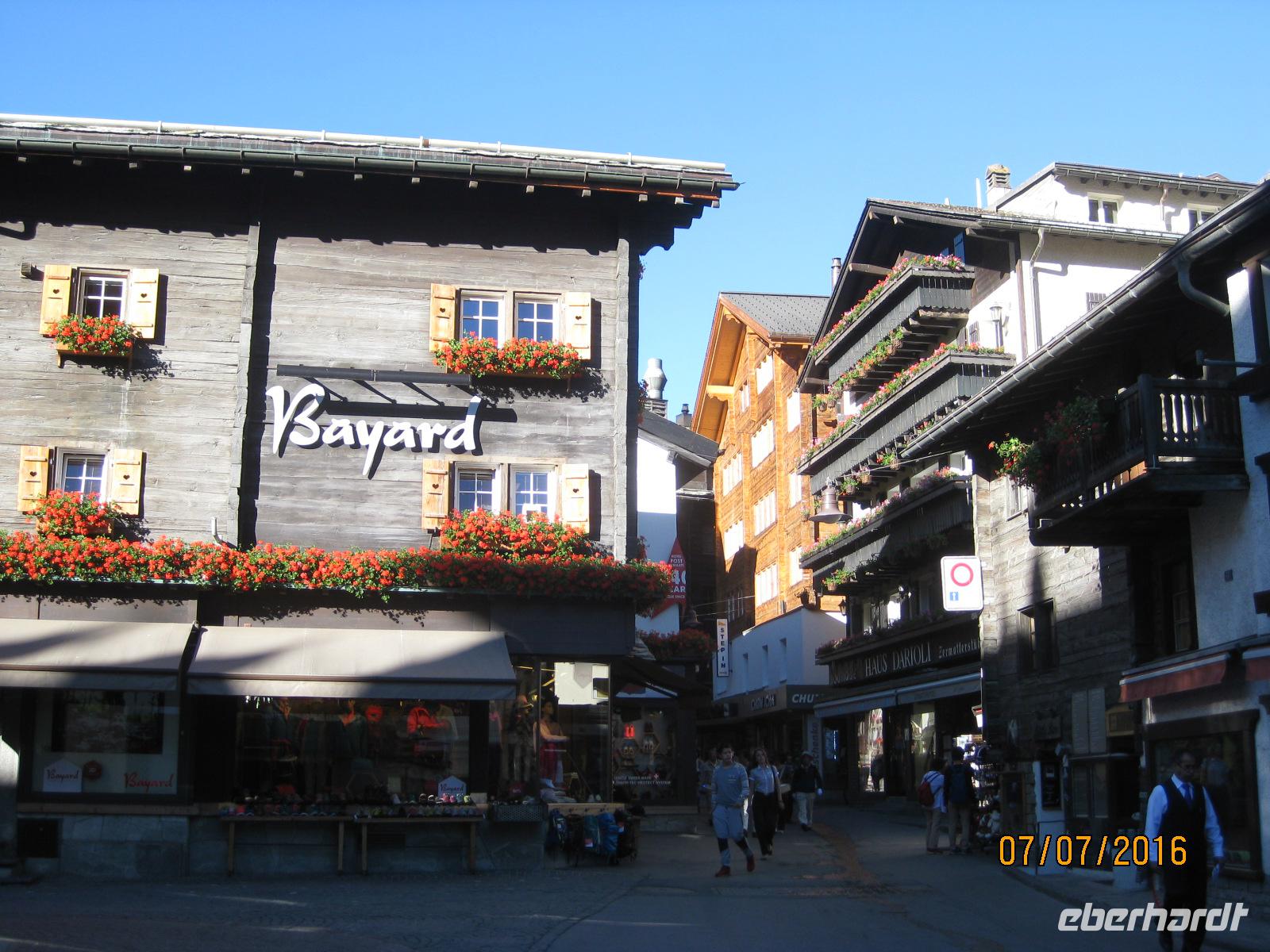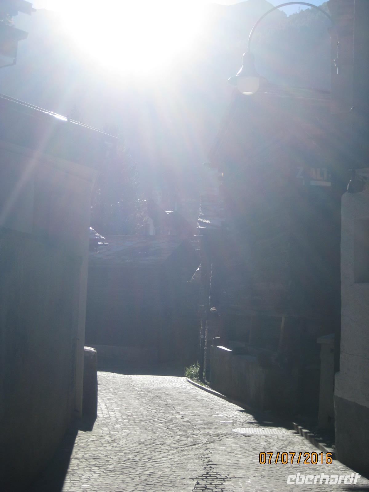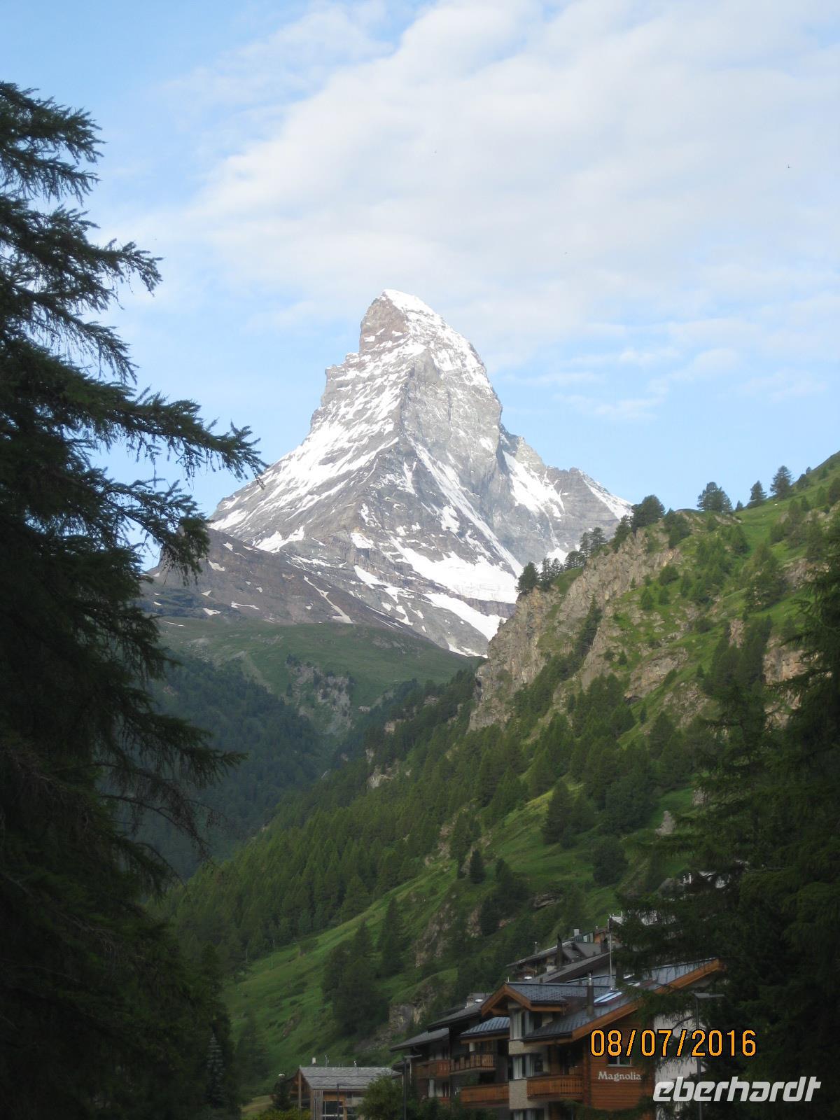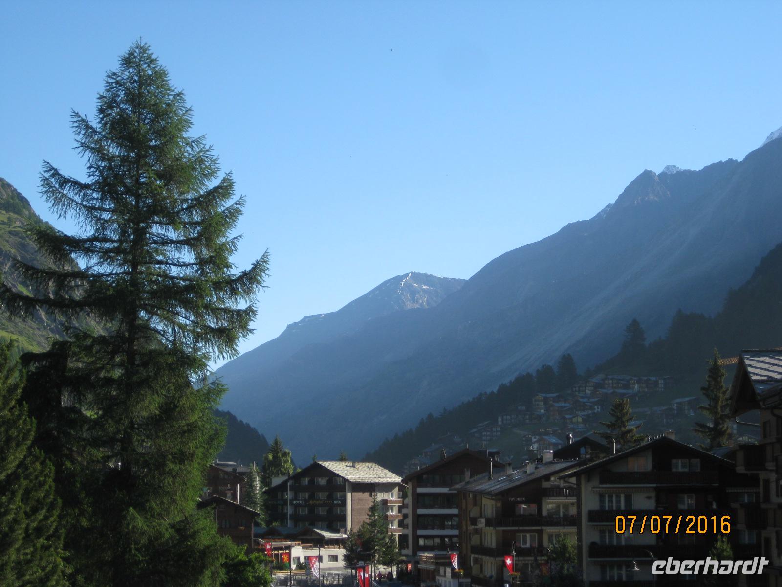 Schon heute erwartet uns unsere zweite Zugfahrt durch die Schweiz. Mit dem "langsamsten Schnellzug der Welt" begeben wir uns auf den Weg in Richtung Zermatt. Der Glacier-Express führt uns von Filisur aus durch die Rheinschlucht, vorbei an Disentis, über den Oberalppass und vorbei an Andermatt nach Zermatt im Wallis. Zahlreiche Tunnel, Viadukte und Passüberquerungen stellen nicht nur Meisterleistungen des Eisenbahnbaus dar sondern geben uns immer wieder ein herrliches Fotomotiv. Insgesamt gesehen ist die Strecke des Glacier Express 291 Kilometer lang und durchläuft drei Kantone der Schweiz: Graubünden, Uri und Wallis. In Visp angekommen, können wir es nun kaum noch erwarten, endlich das Matterhorn sehen zu können. Aber die wohl maraknteste Spitze der Schweiz versteckt sich gut und erst auf dem letzten Stück von Täsch nach Zermatt zeigt sich uns die Spitze vom Matterhorn. Nun sind wir endlich da. Der Ort Zermatt ist komplett autofrei und zeigt sich uns zu Beginn schon gleich von seiner schönsten Seite. Bei strahlendem Sonnenschein werden wir empfangen und haben einen traumhaften Blick auf das Matterhorn. Im Hotel Bristol beziehen wir am späten Nachmittag unsere Zimmer und genießen bereits im Anschluss einen ersten kleinen Rundgang durch den Ort.